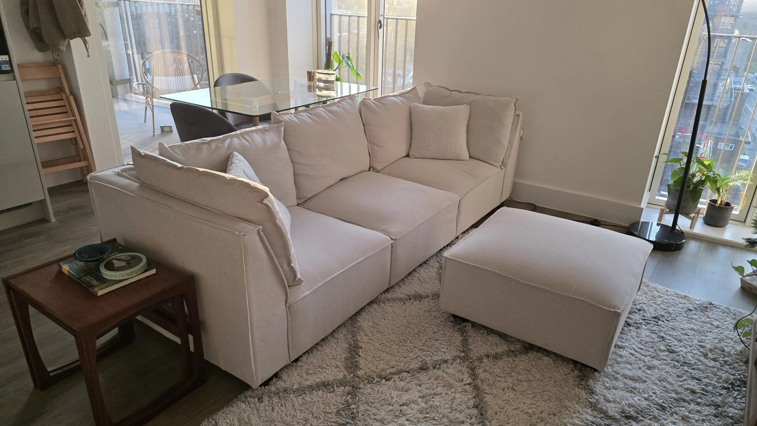 The ottoman is detached and can be moved to create a left or right chaise sofa. This sofa can be disassemble into small sections for easy maneuverability.