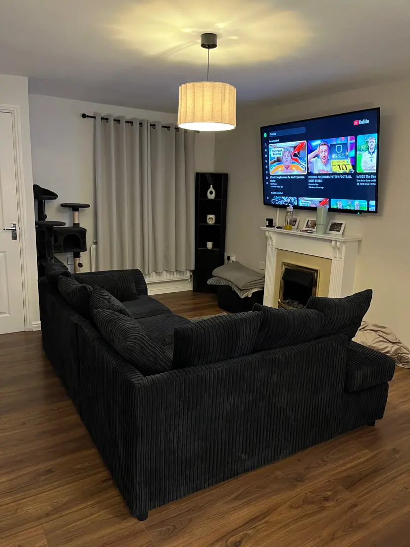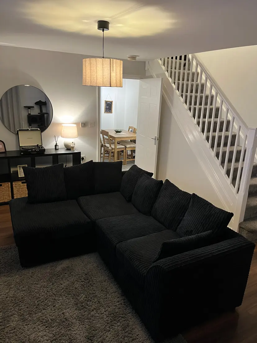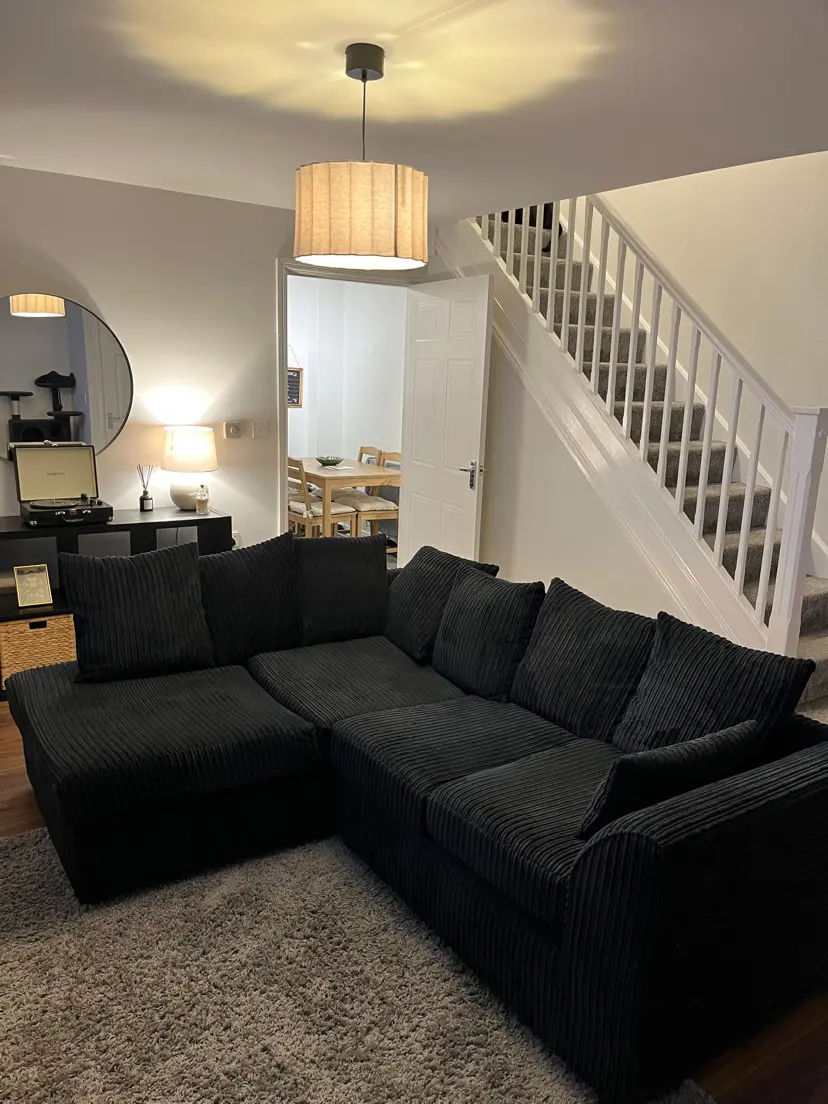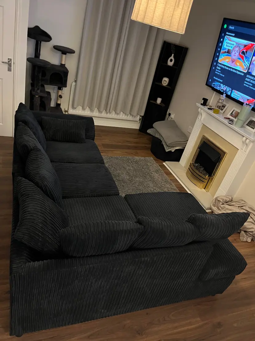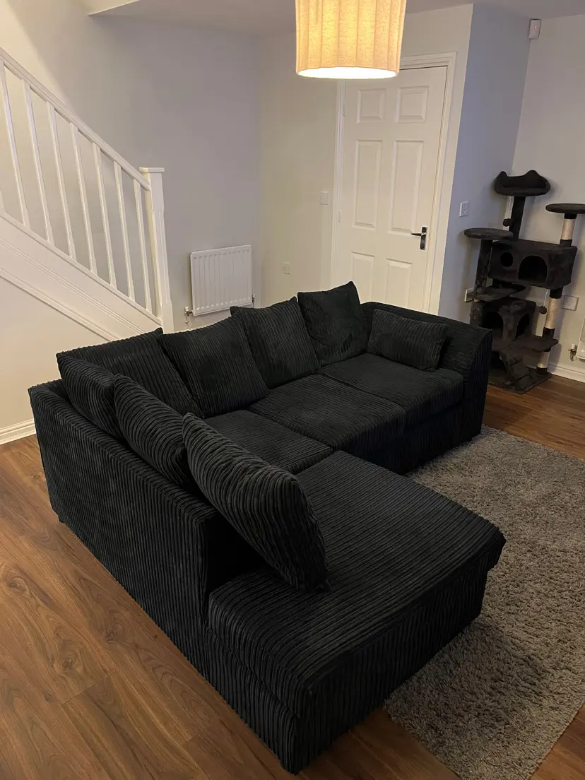 Great condition sofa, colour is black but it does appear a darker blue colour in natural light, only realised when moving but as pictures show it is a darker black colour under warmer lighting.