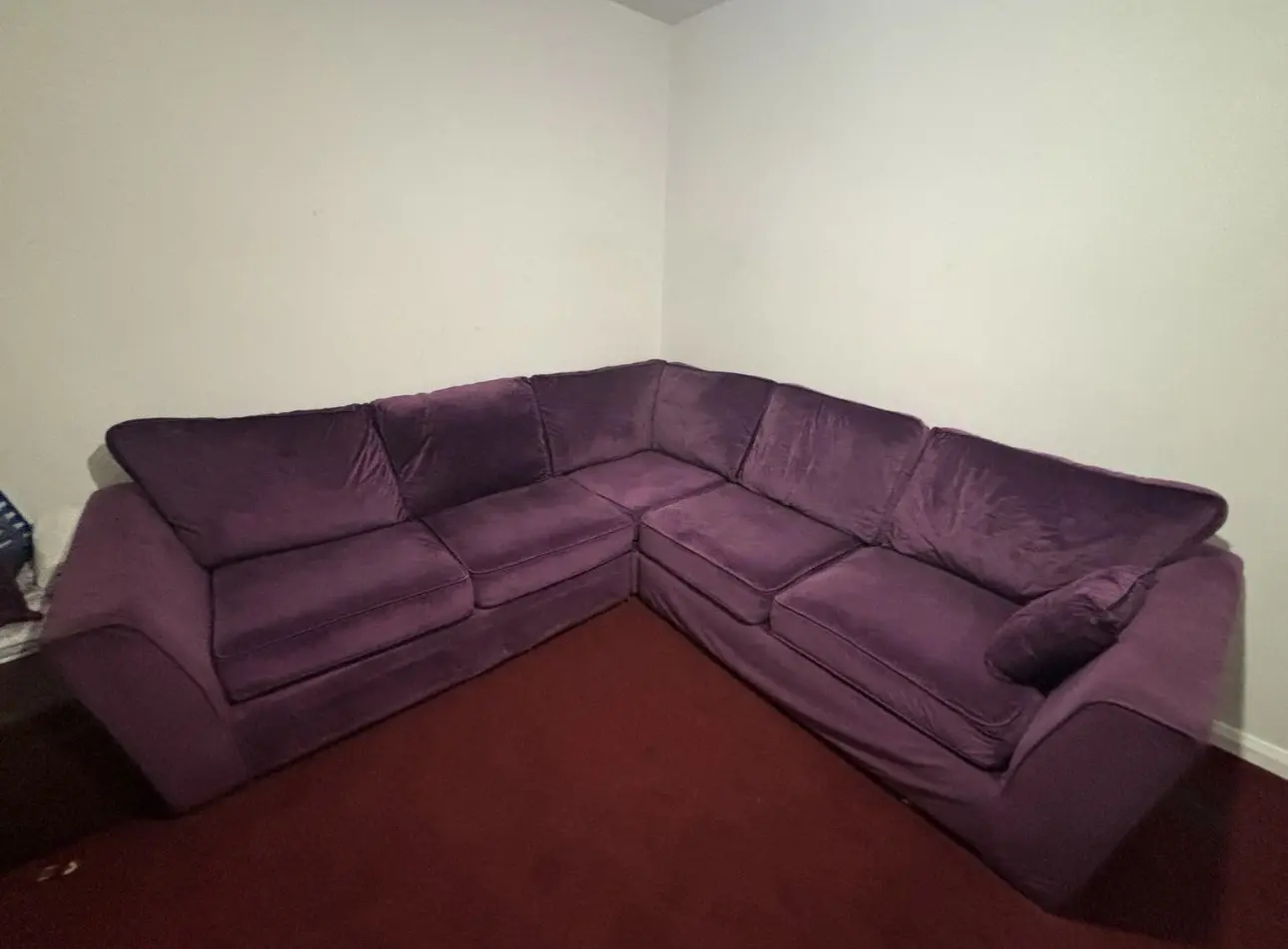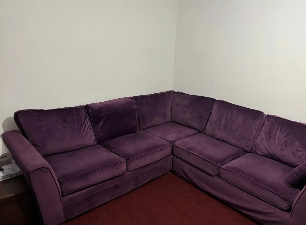 In very good condition clean in purple colour velvet corner sofa. The measurements is for all 3 pieces together.