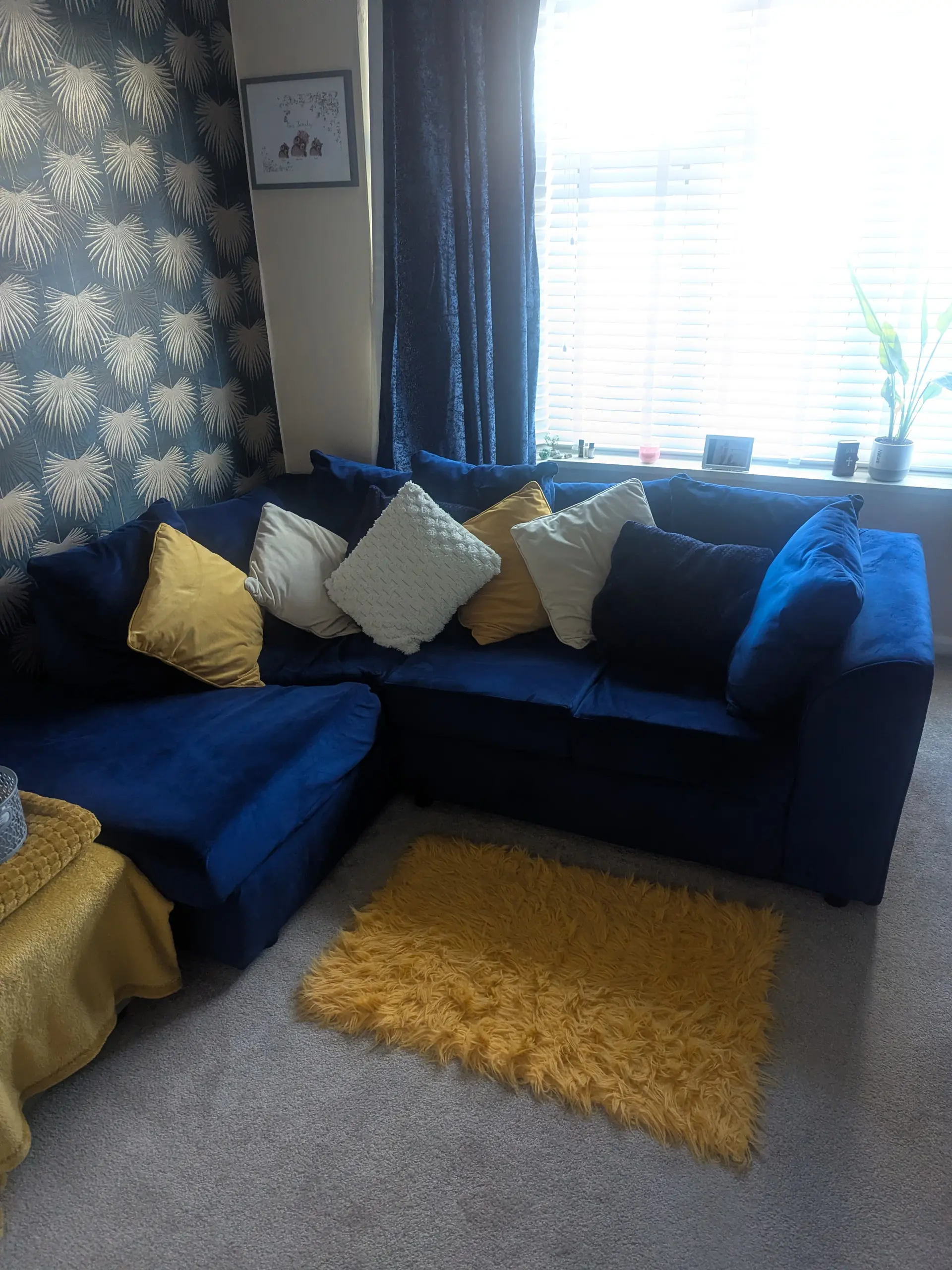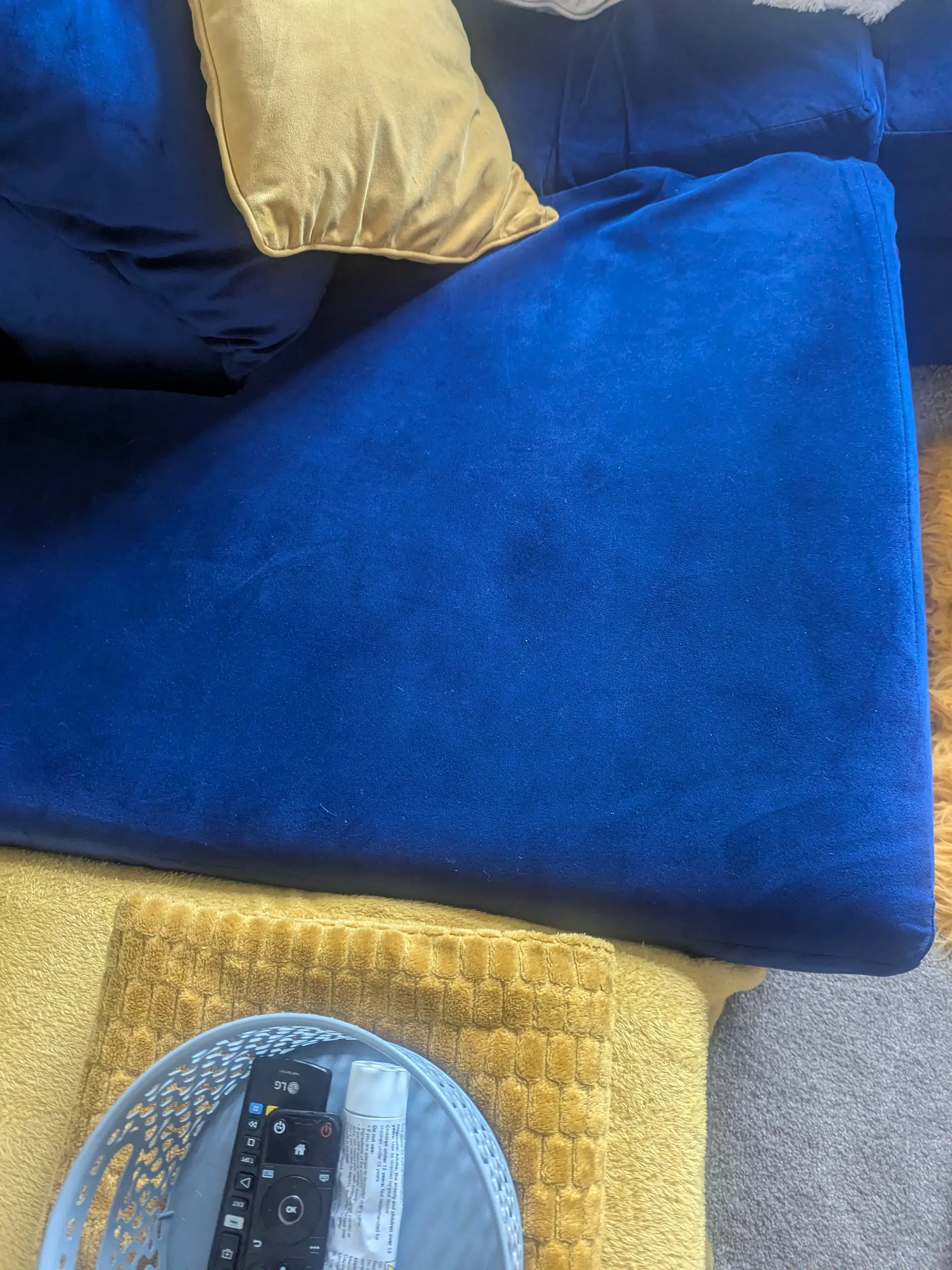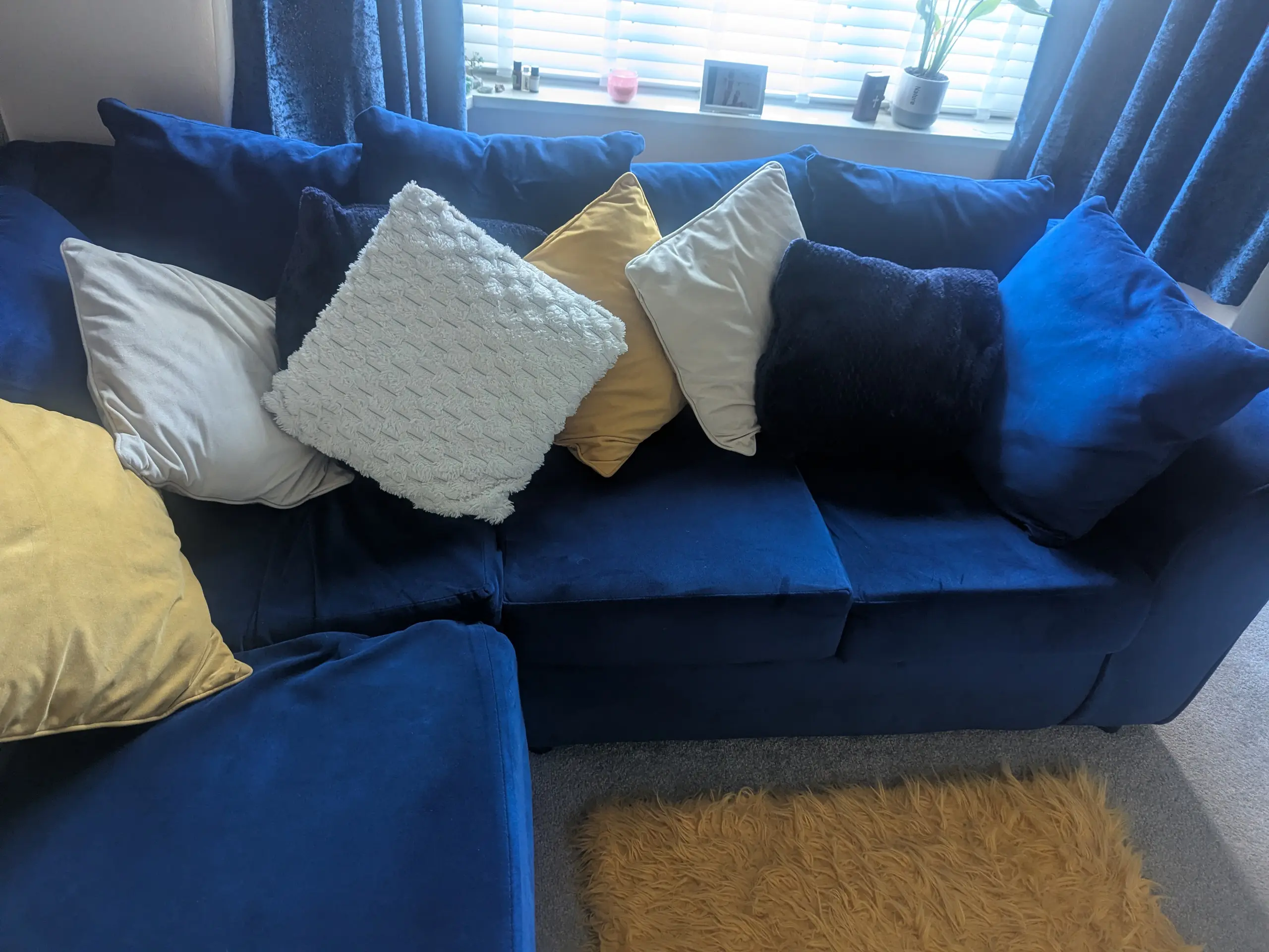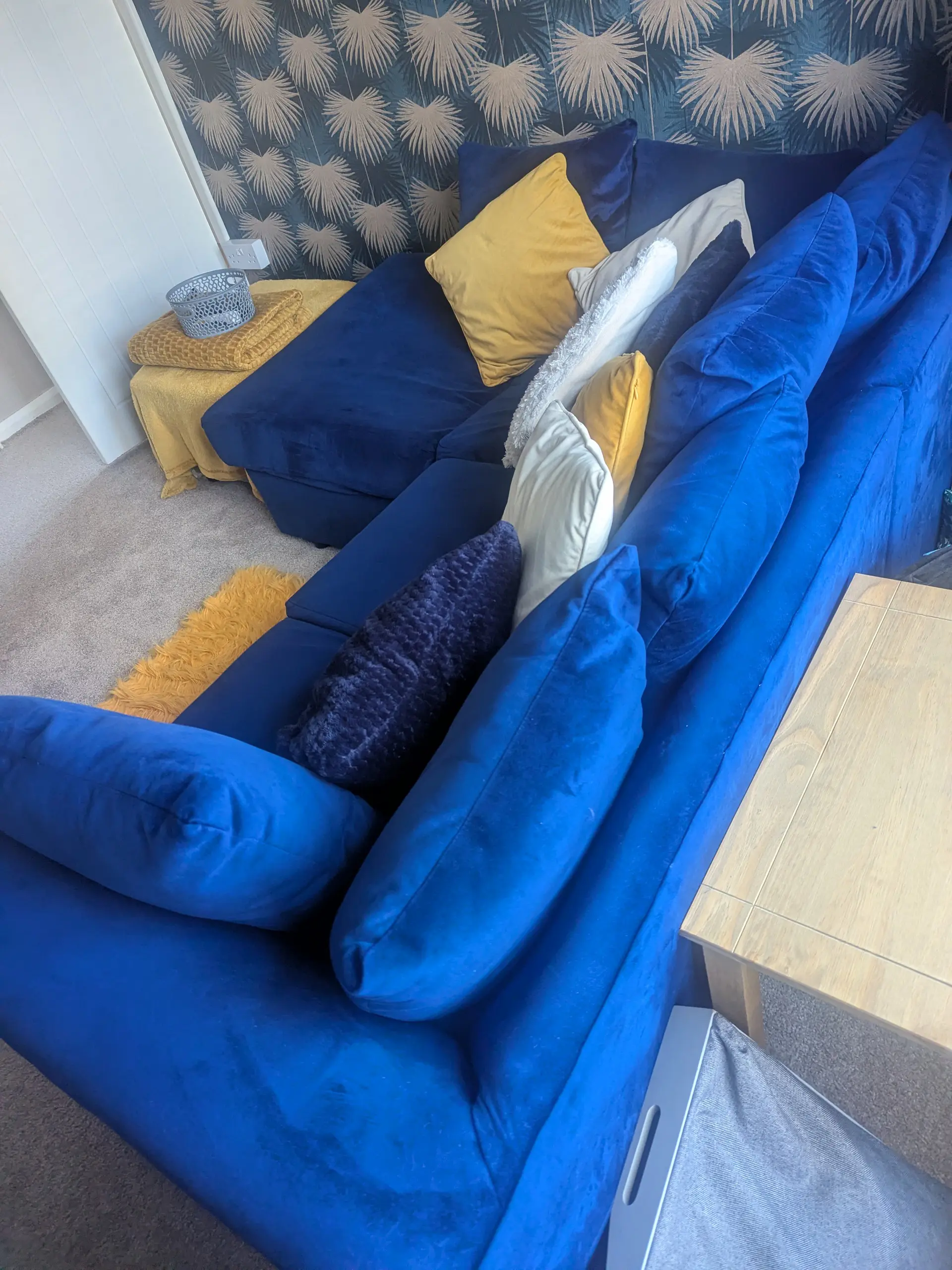 Royal blue Velvet left hand corner sofa. 18 months old no damage on outside, however underneath there is some velcro attached to bottom of cushion to keep it on place.
