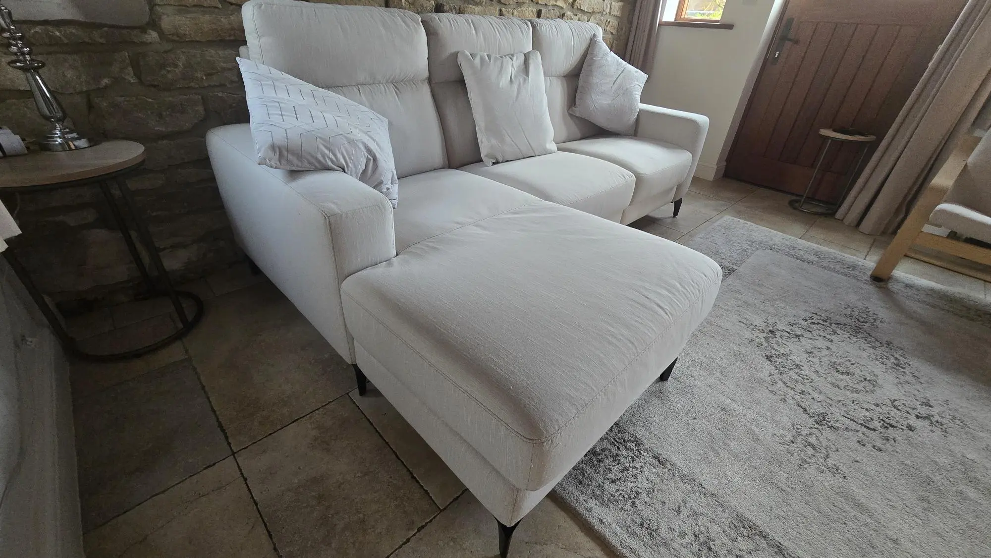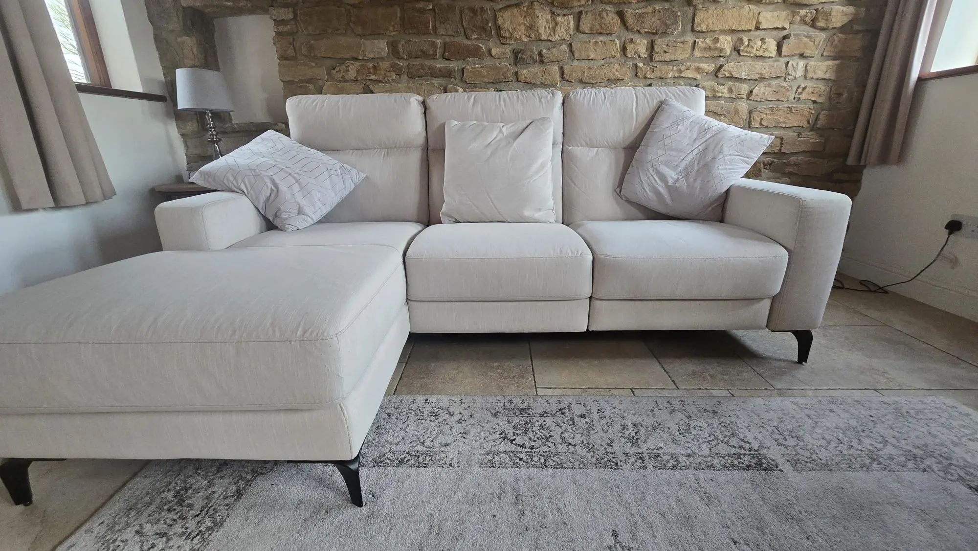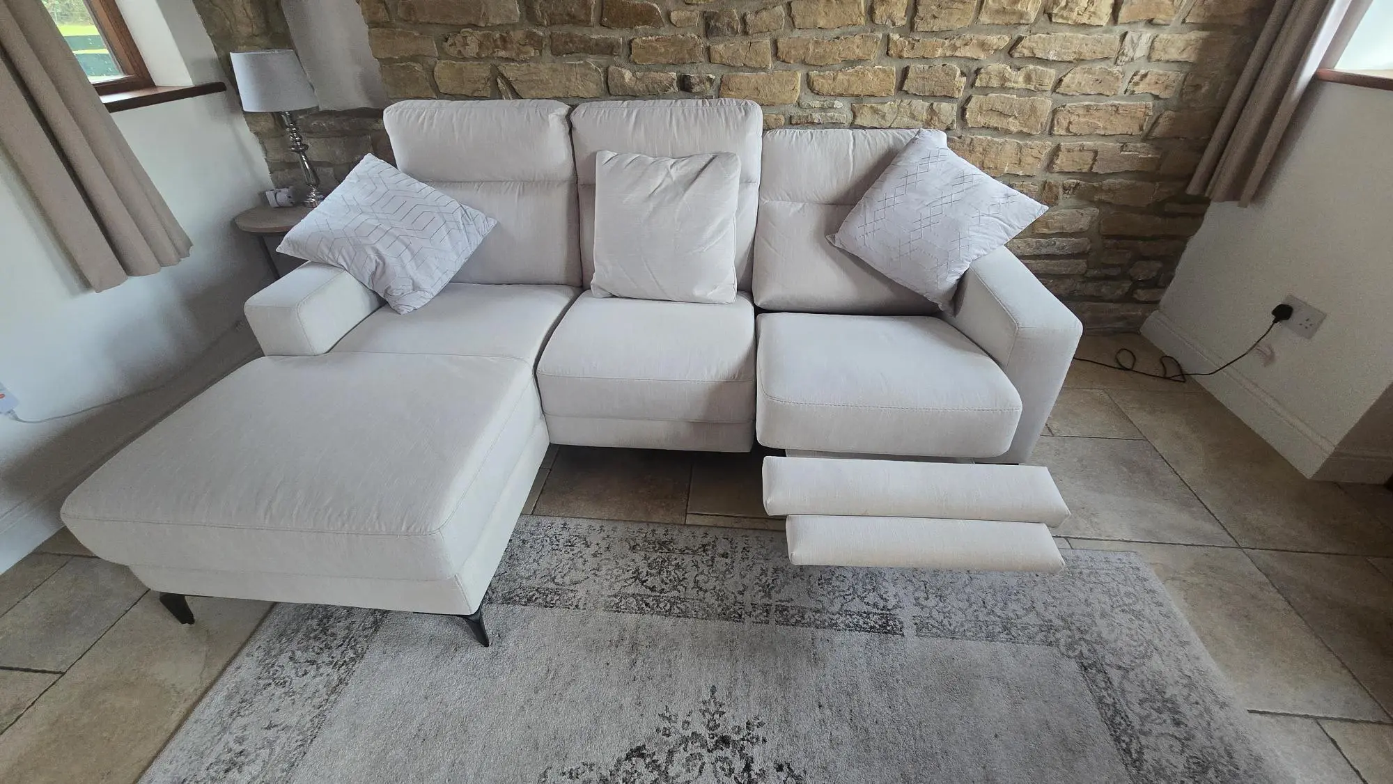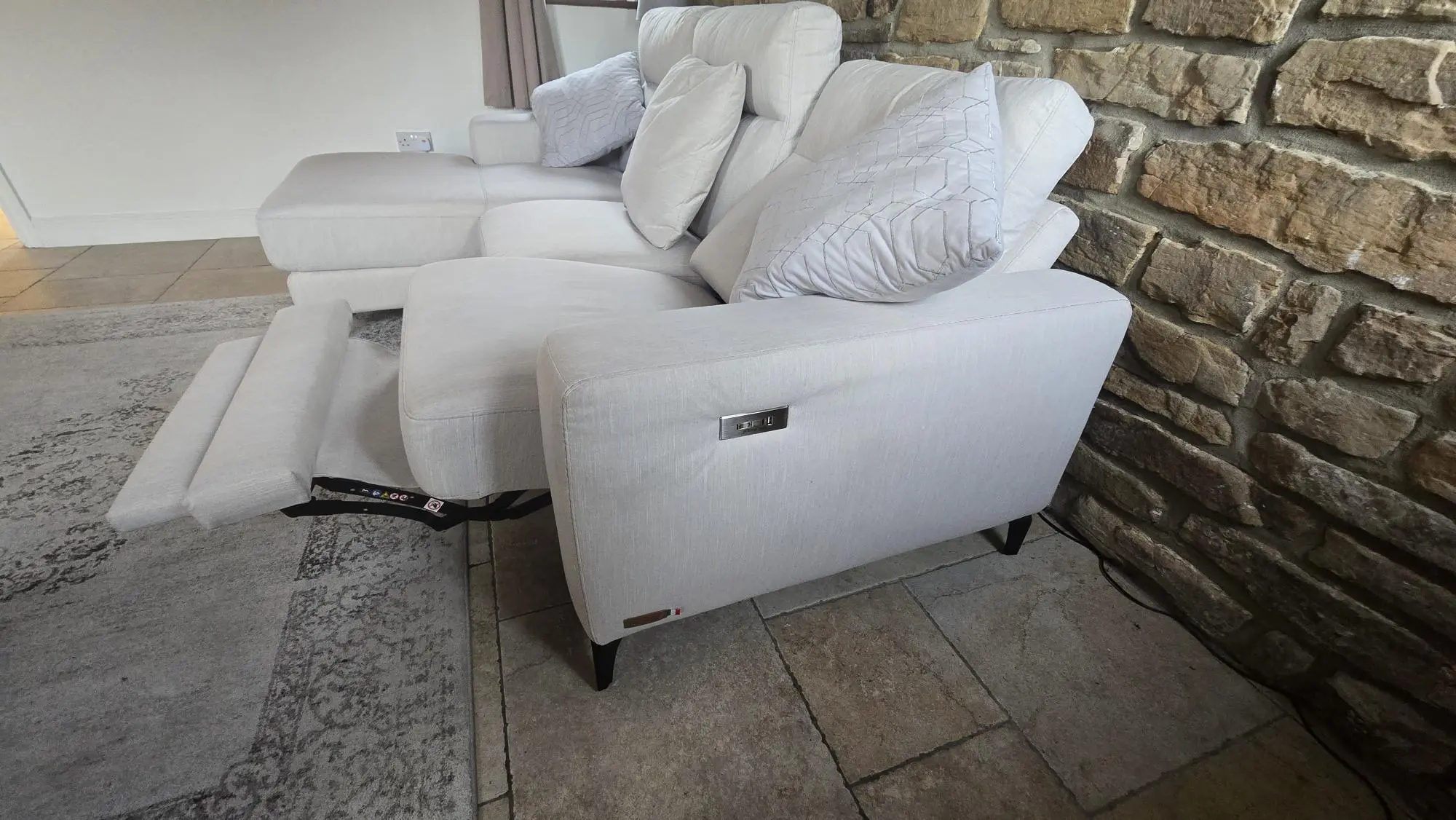 3 seater Italian Chaise Longue corner sofa with electric recliner and USB & USB C ports.