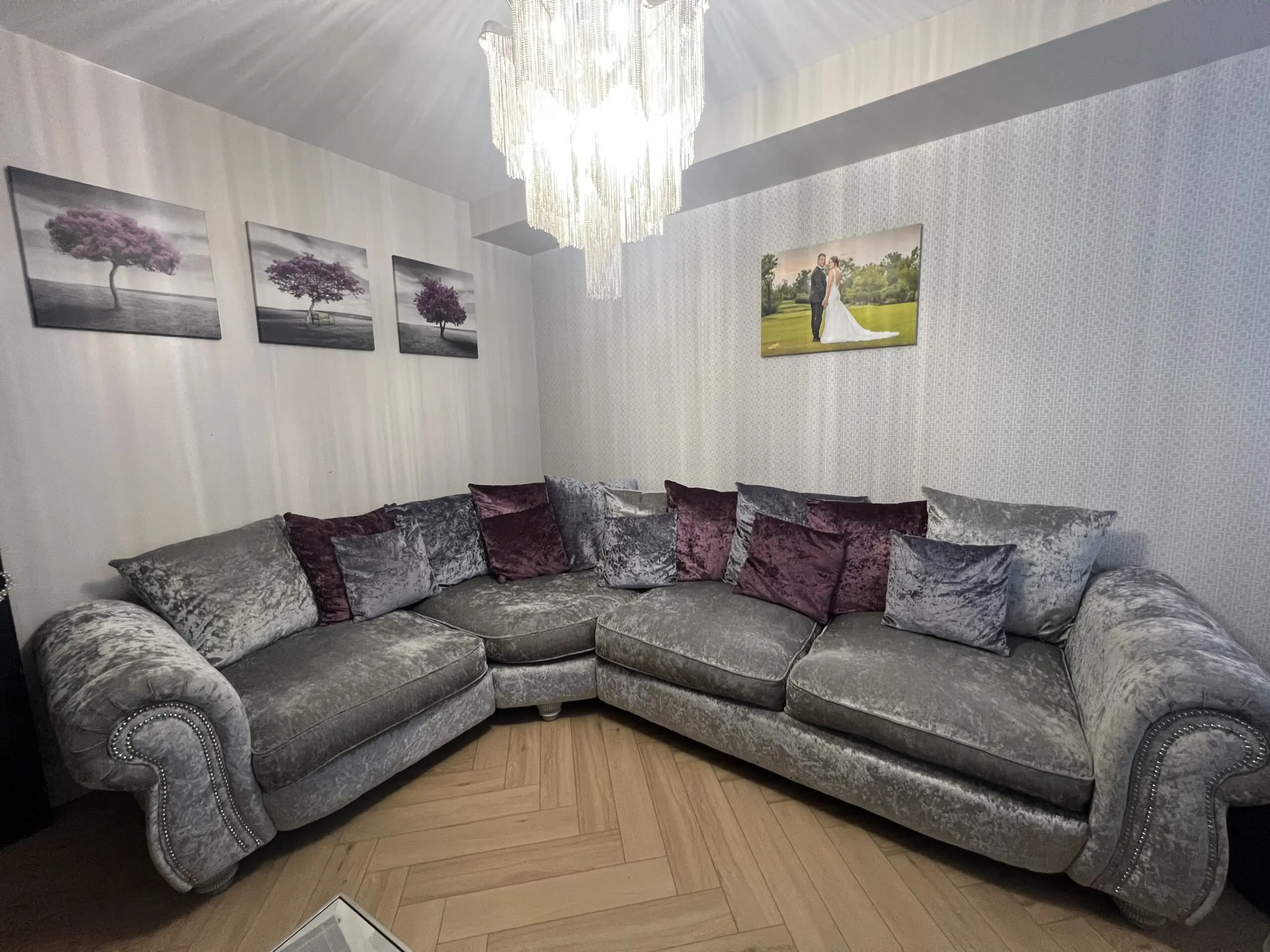 Grey crushed velvet corner sofa. Scatter back with purple cushions and metal stud decor.