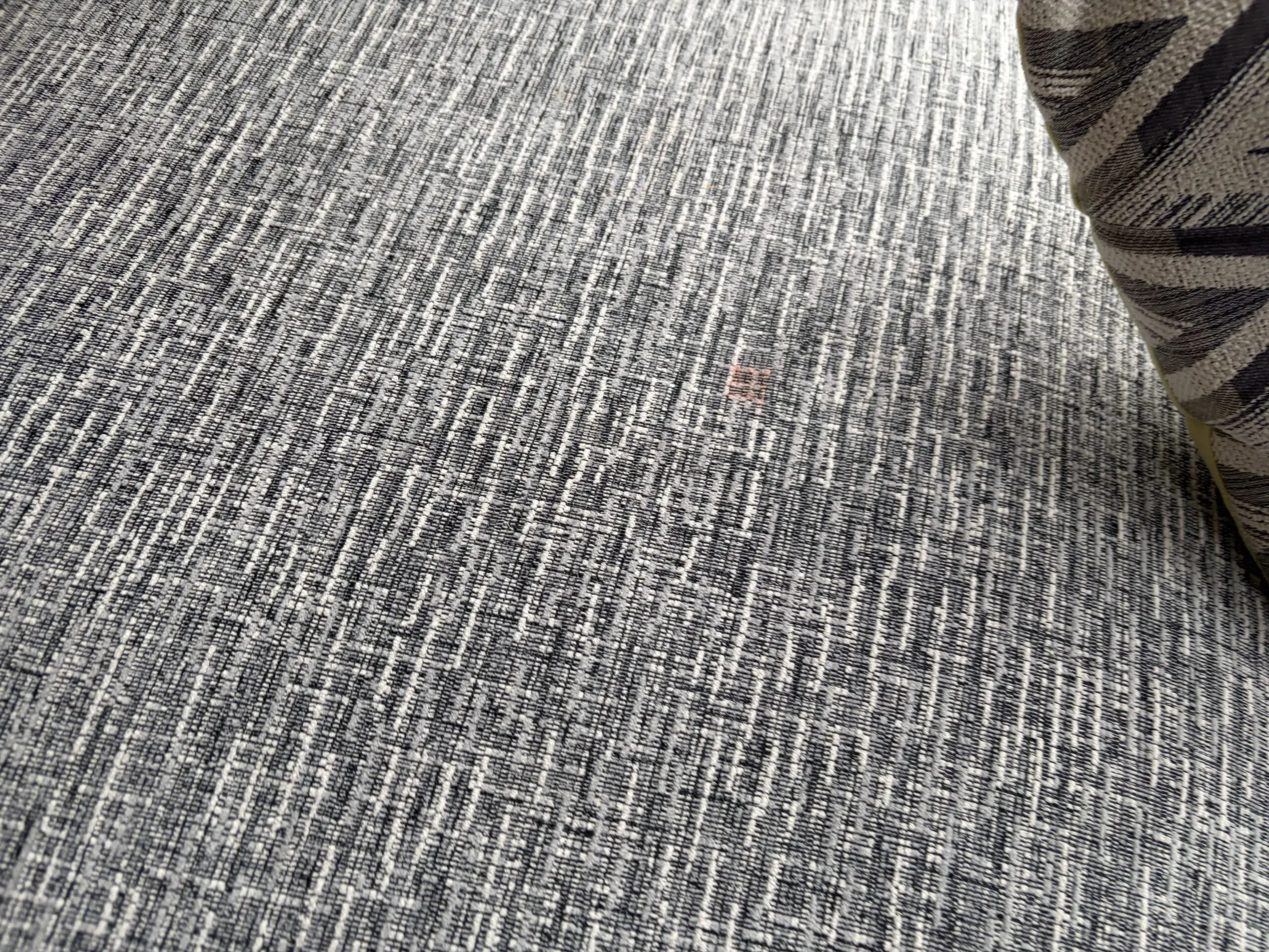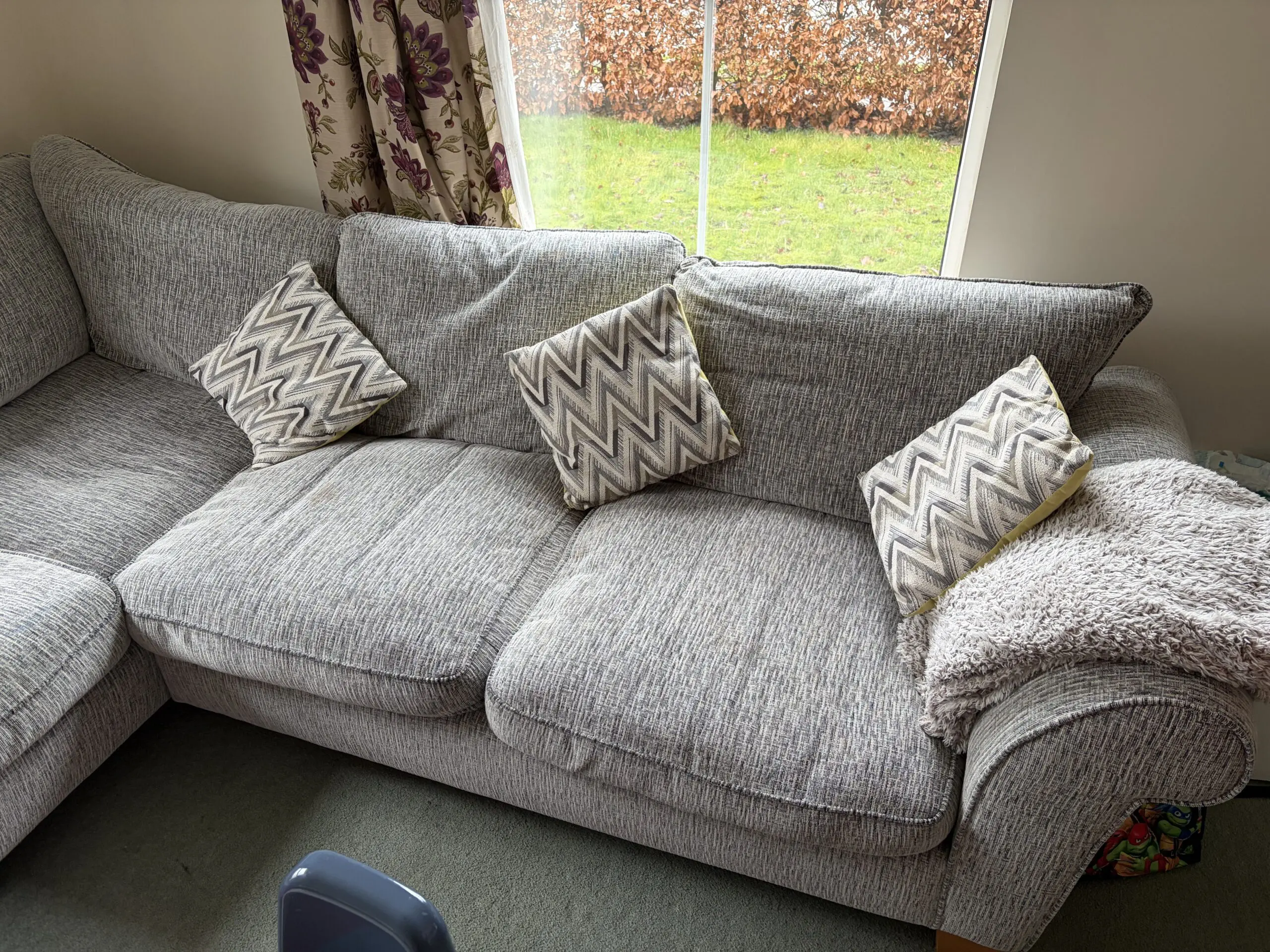 Grey corner sofa chaise long style RHF with square foot stall. Fair condition with some markings.