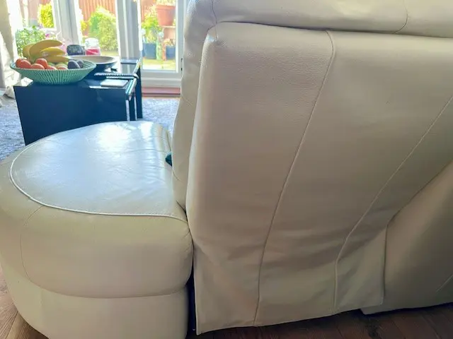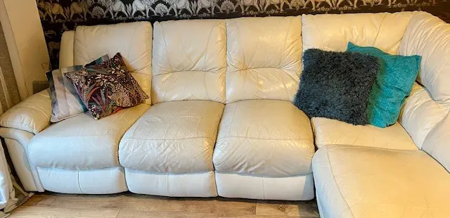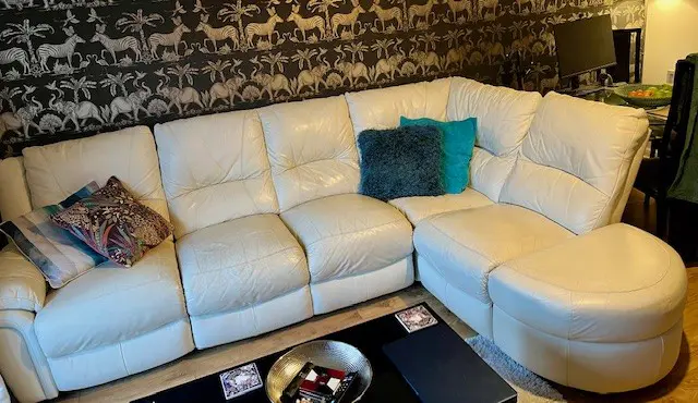 Ivory leather corner sofa 5 seater (+ chaise). Very comfortable – used but in good condition.