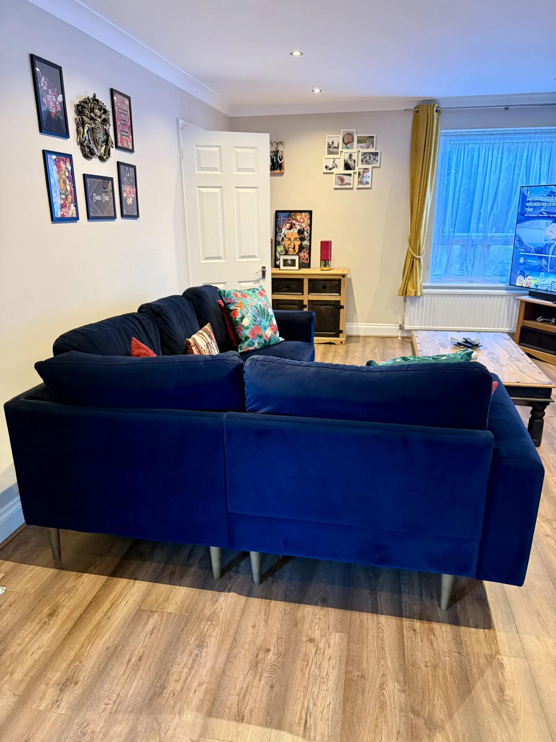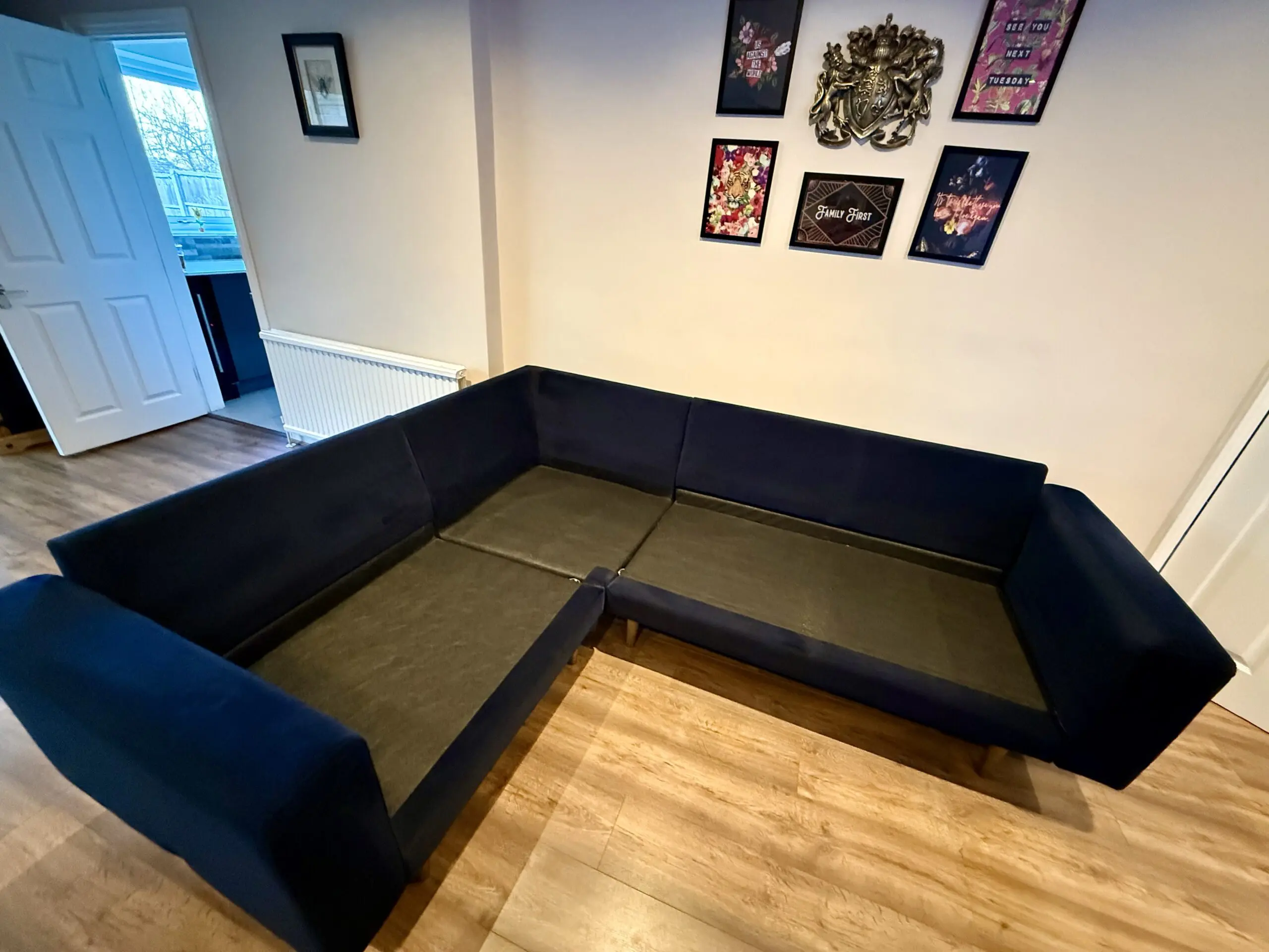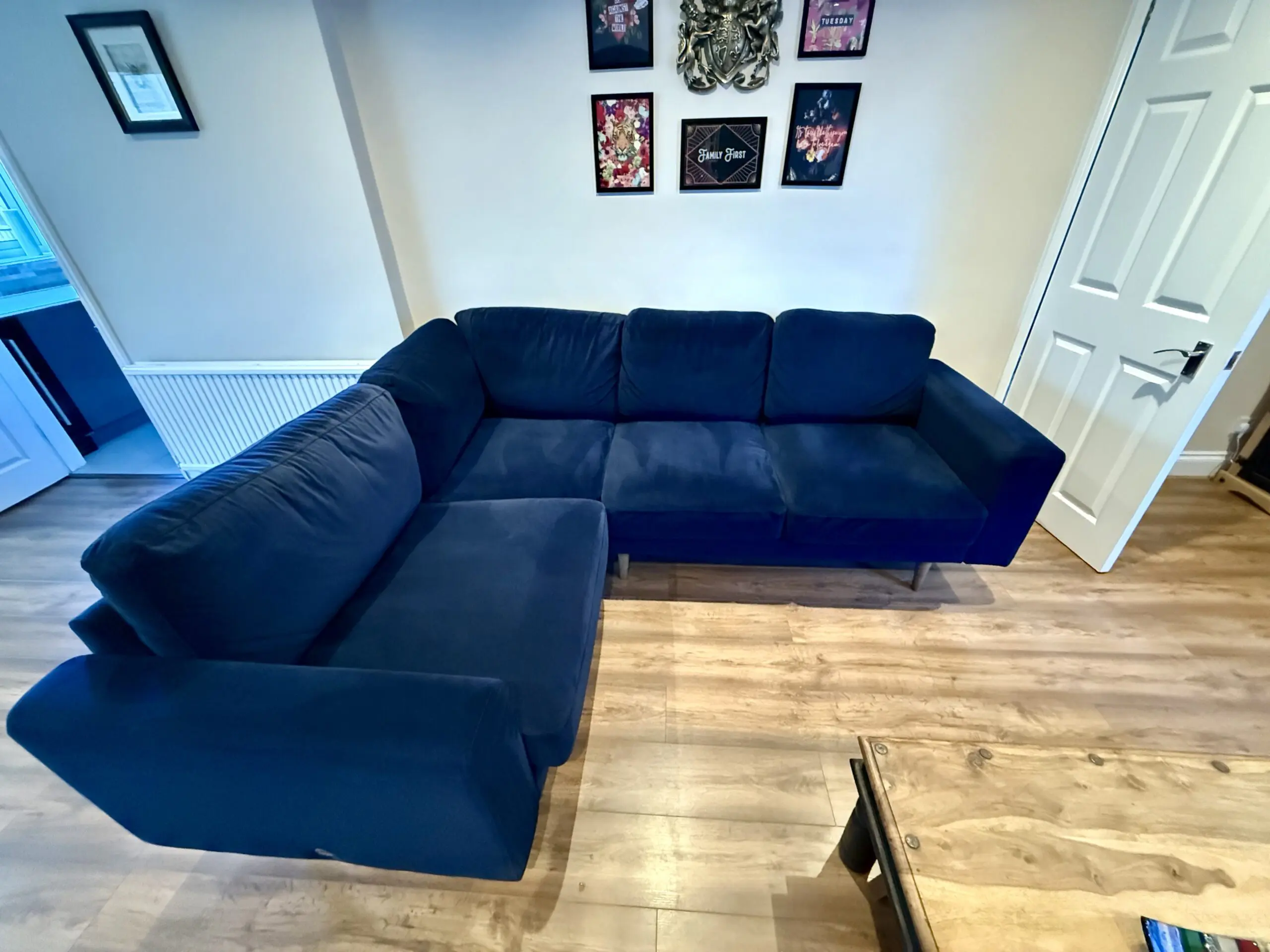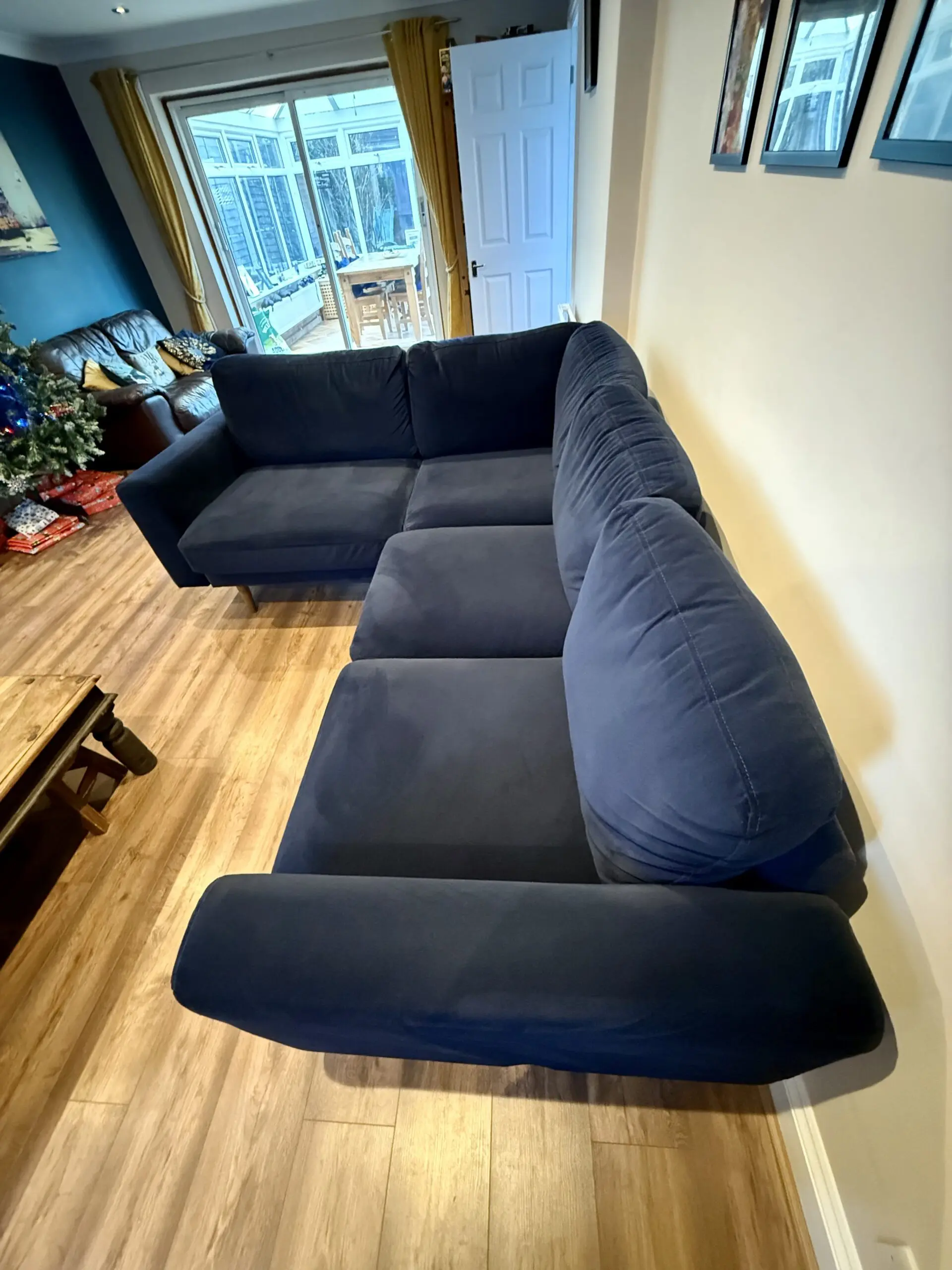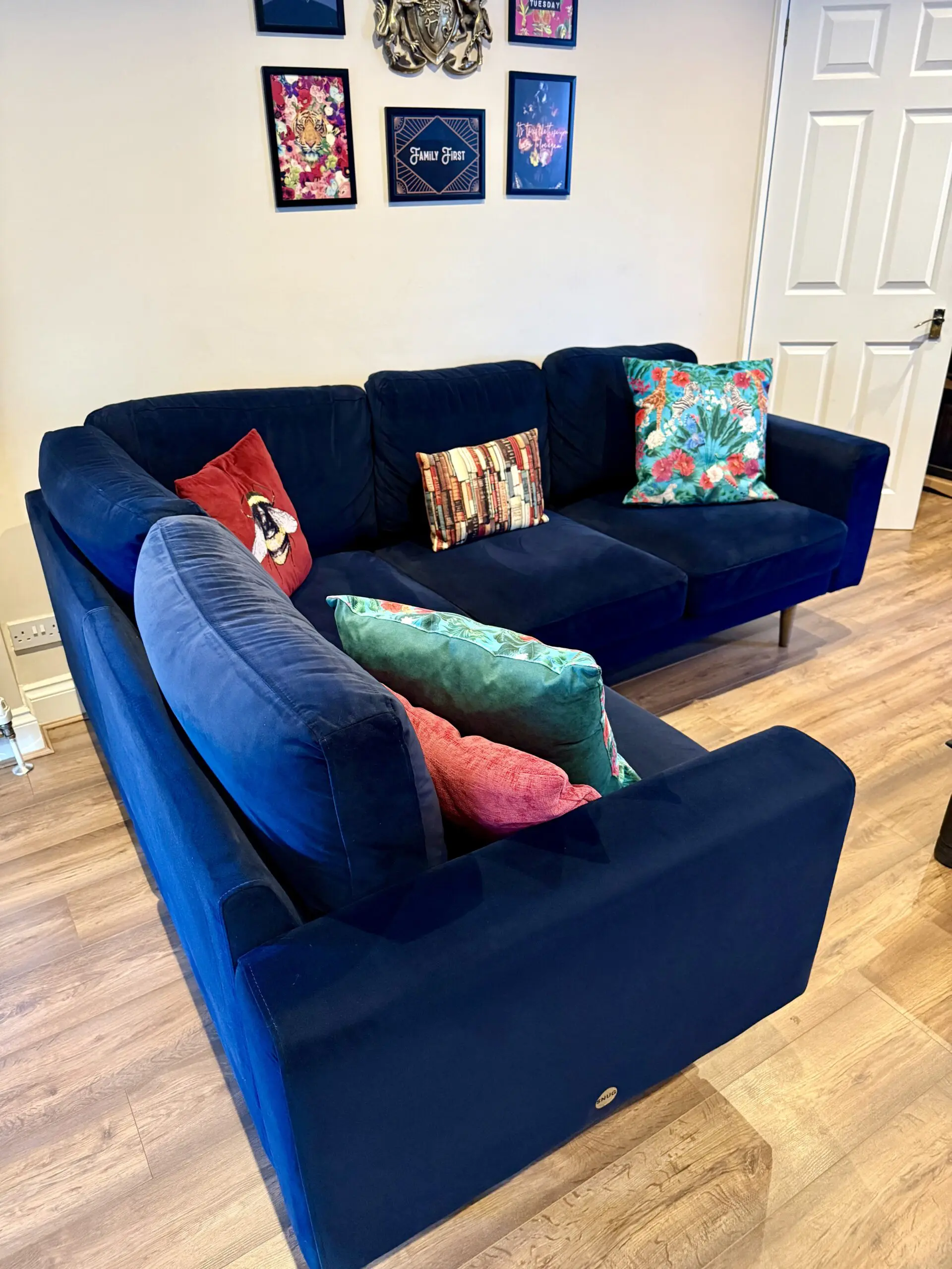 Stunning Snug The Big Chill small corner sofa in a rich deep blue, made up of a 2 seater sofa and a 1.5 seater snuggler. A beautifully designed, contemporary piece that’s both stylish and extremely comfortable.