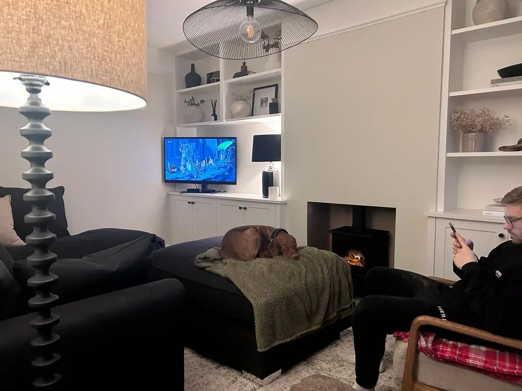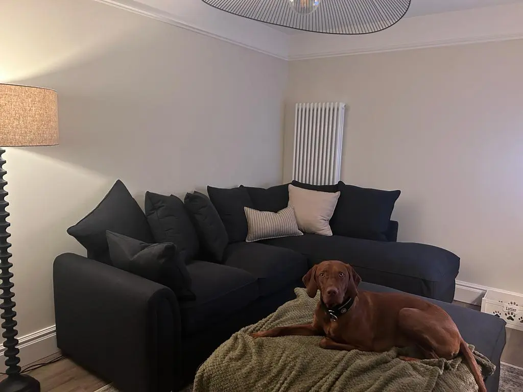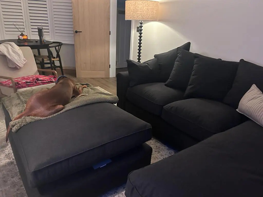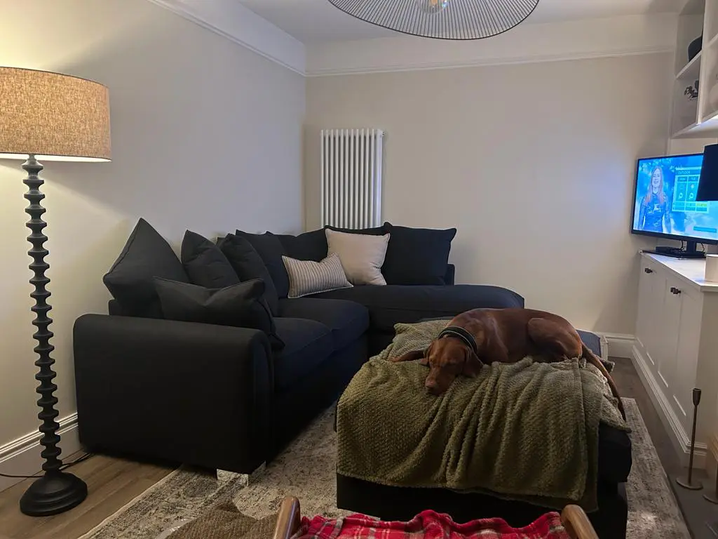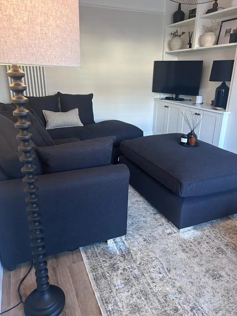 Bought in Jan 2024 – selling as renovating living room and no longer fits. We have one dog who has sat on the footstall, but the sofa and footstall are in good condition. Viewing in person welcomed.
