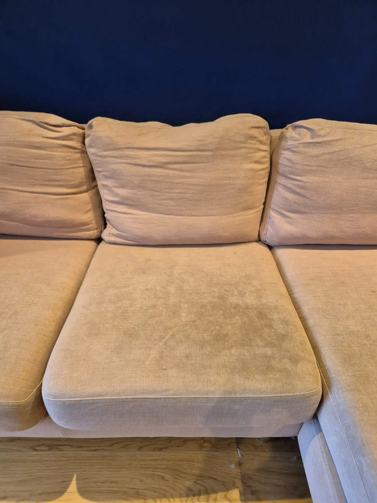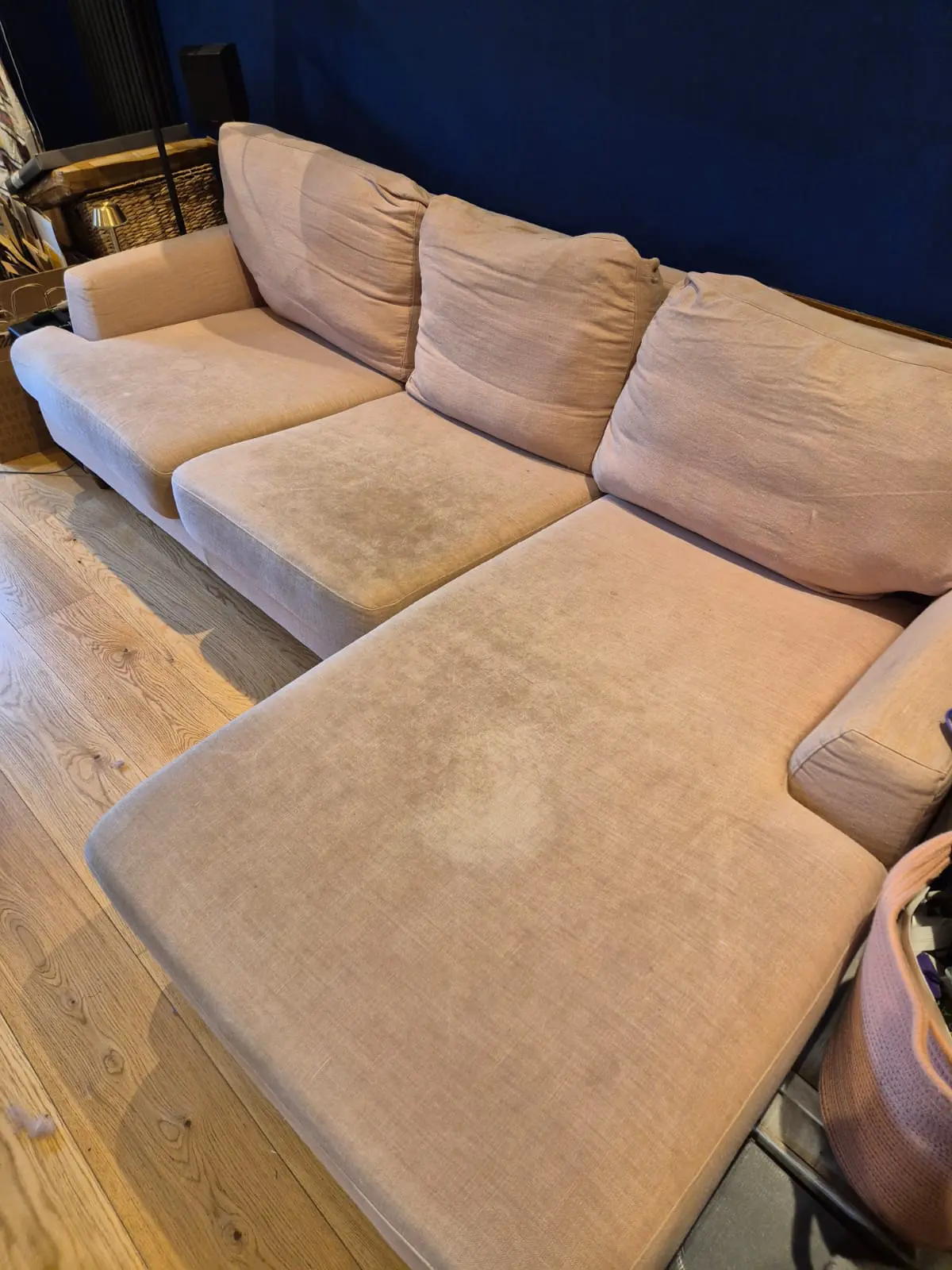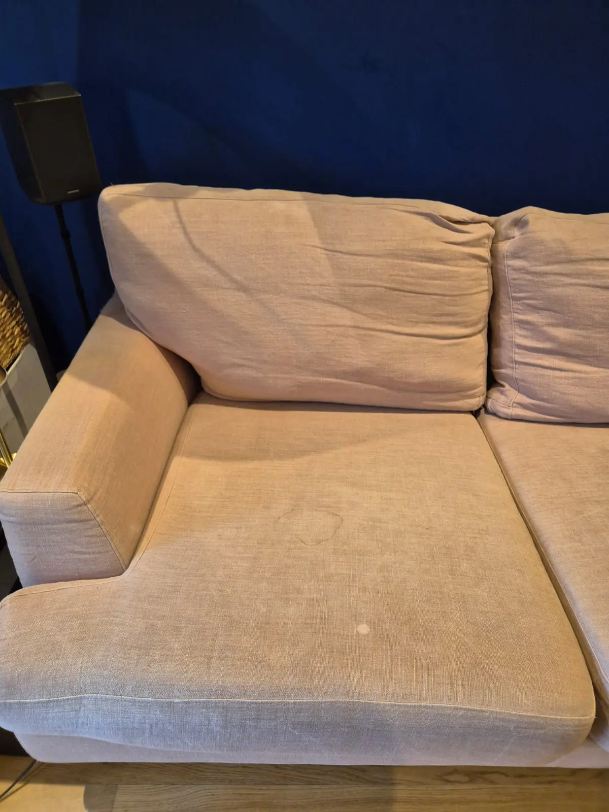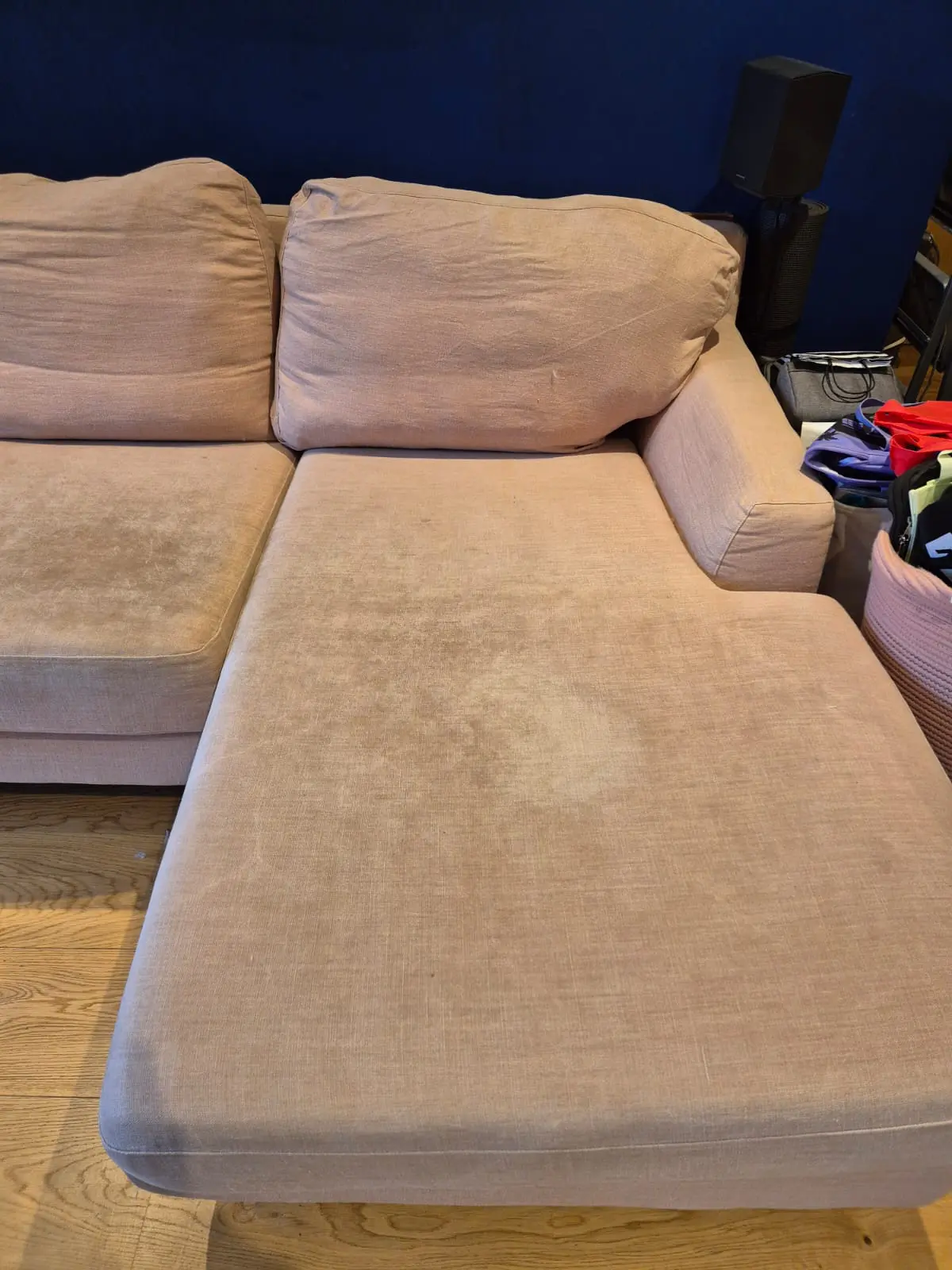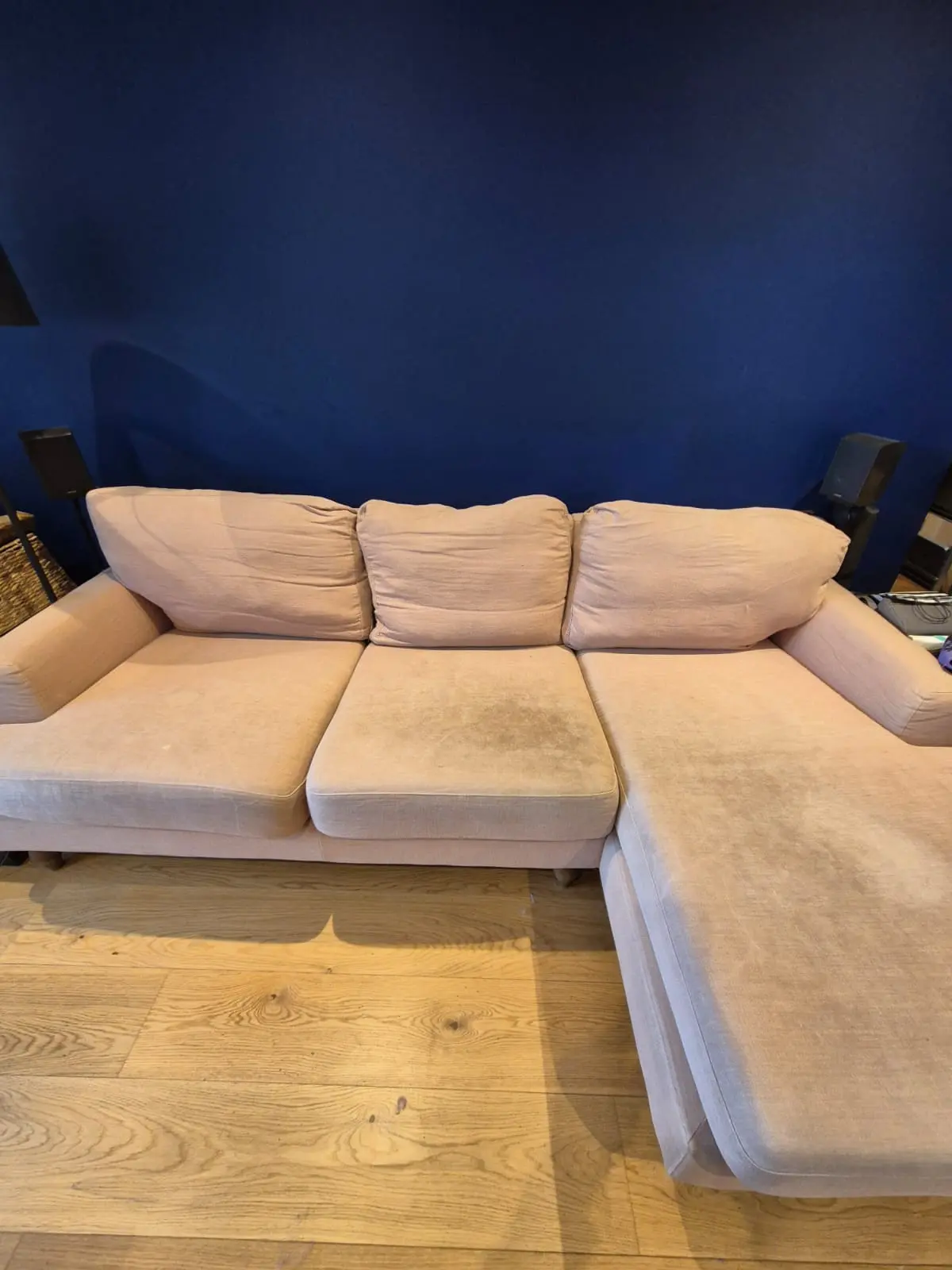 This is an Isla Medium RHF Chaise Sofa in custom Blush Pure Belgian Linen. The sofa comes with English Oak Legs. The sofa is in good condition apart from some stains on the covers. This retails for £3,000 when we bought it.