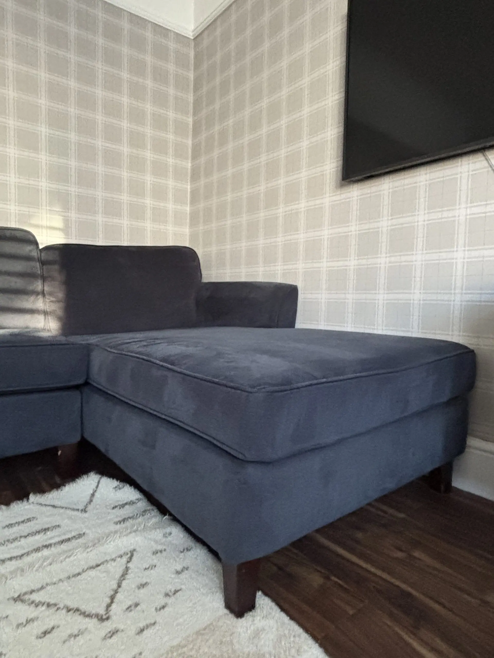 Well looked after left hand corner sofa from Sofa Workshop, in Vogue Navy, a soft velvet looking fabric but more hard-wearing, fully treated with fabric guard. Dark wooden legs and matching cushions give this sofa a very elegant finish. Sadly does not fit in our new home.
