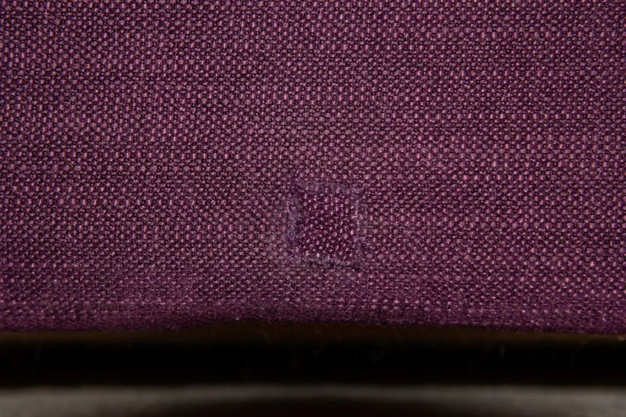 Please see photo of front right base where a small nick has been repaired with the same material attached to sofa labels on sofas. There is still some more material there if want to have it professionally done. Actually we do not notice it as it is not a light coloured fabric and where it is makes it not in view.