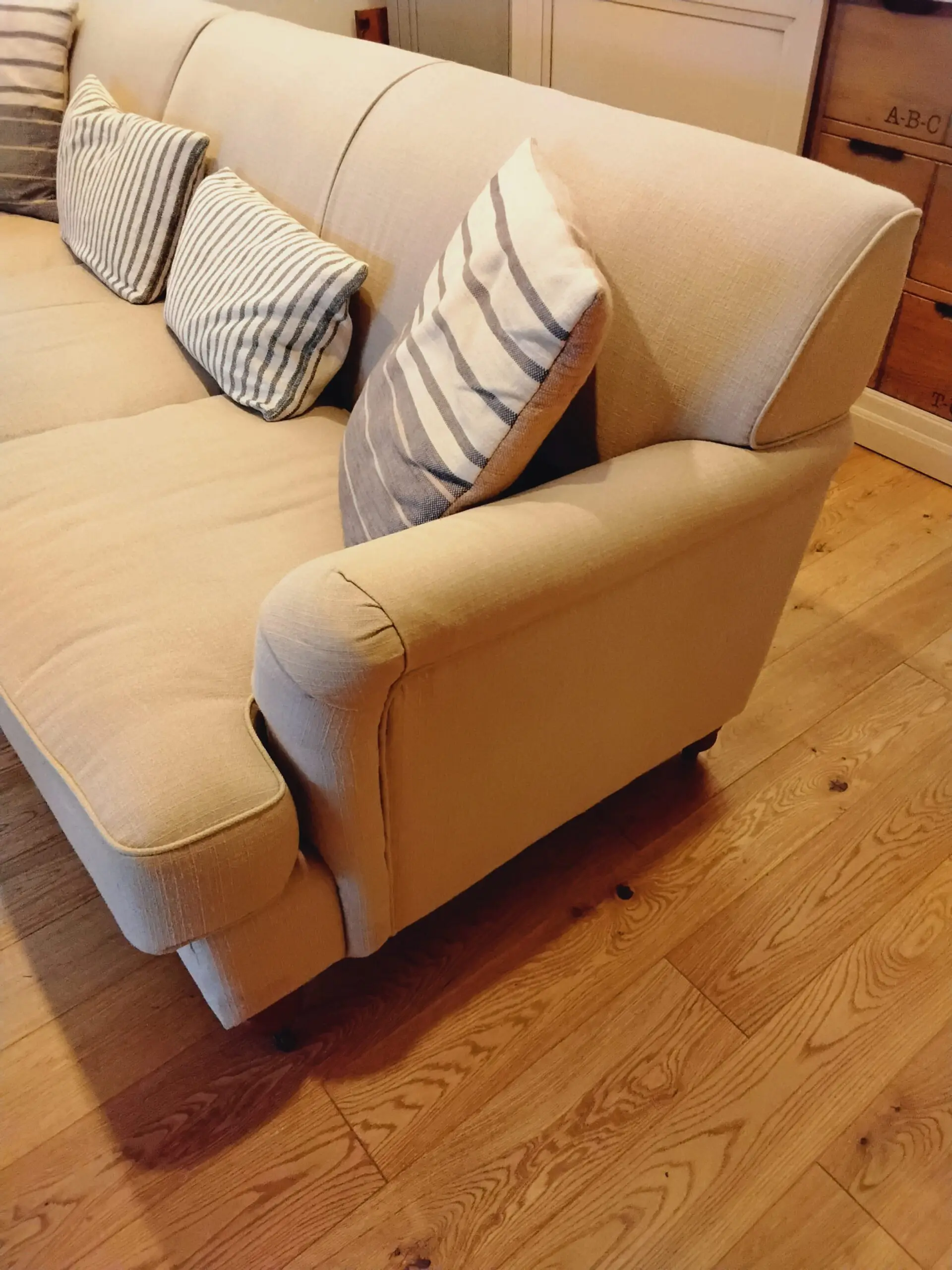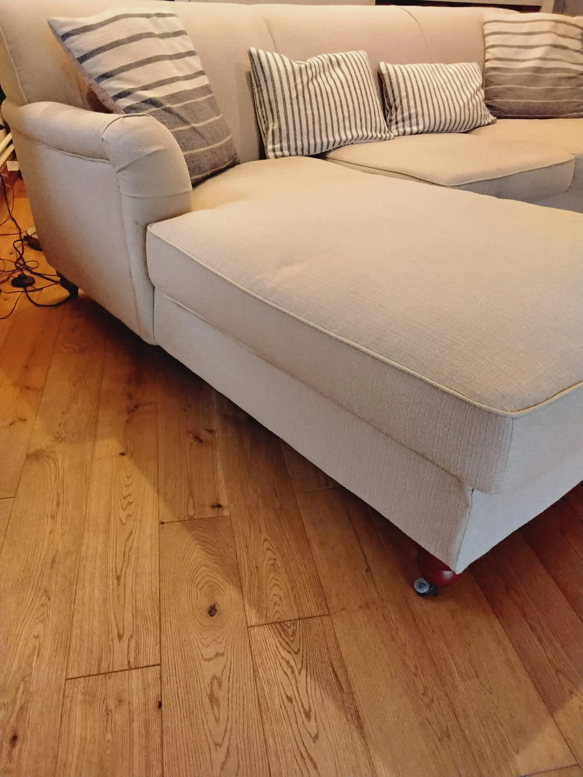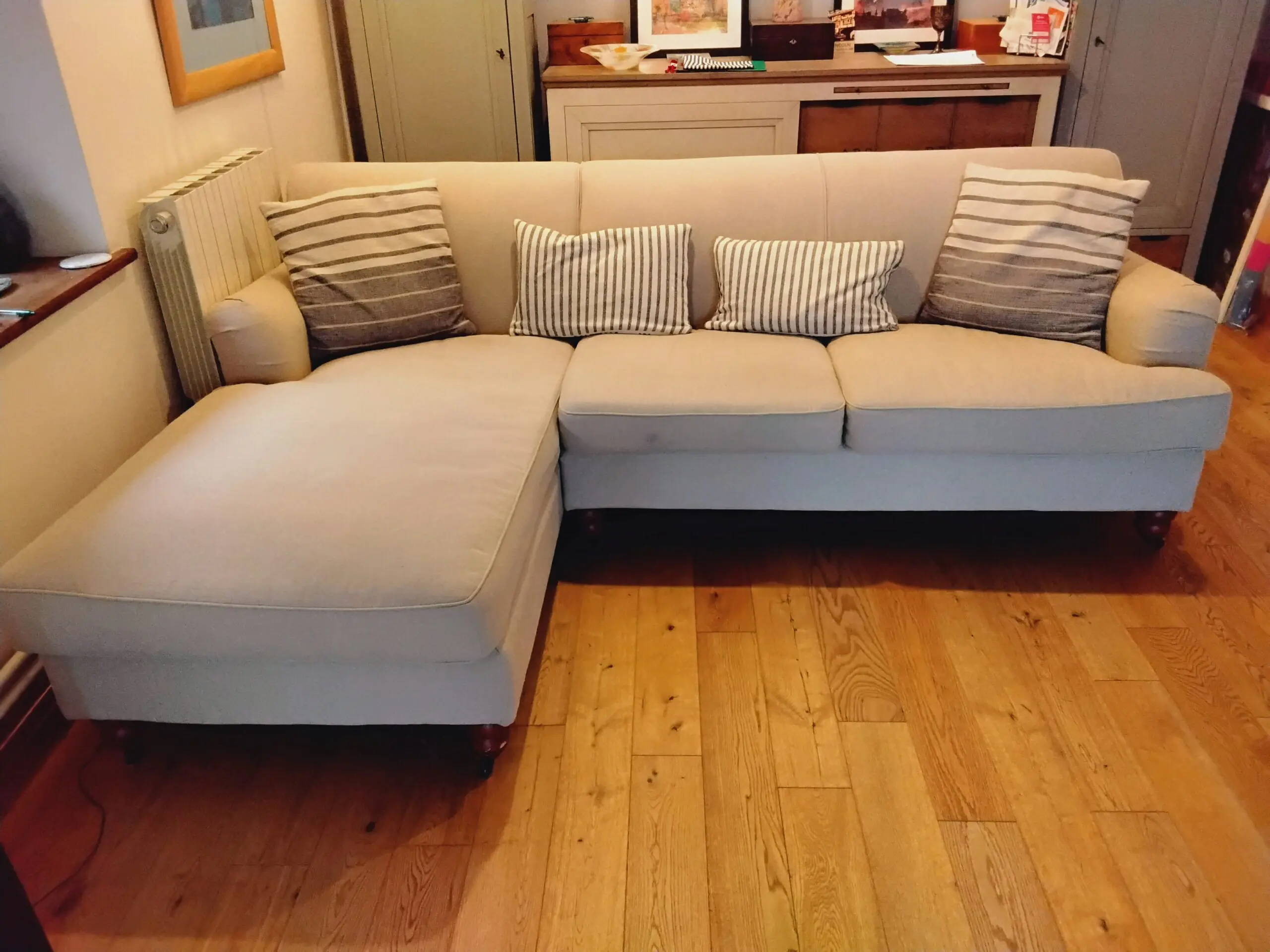 L shape sofa, chaise long style for one seat. Seats upto 4 people.