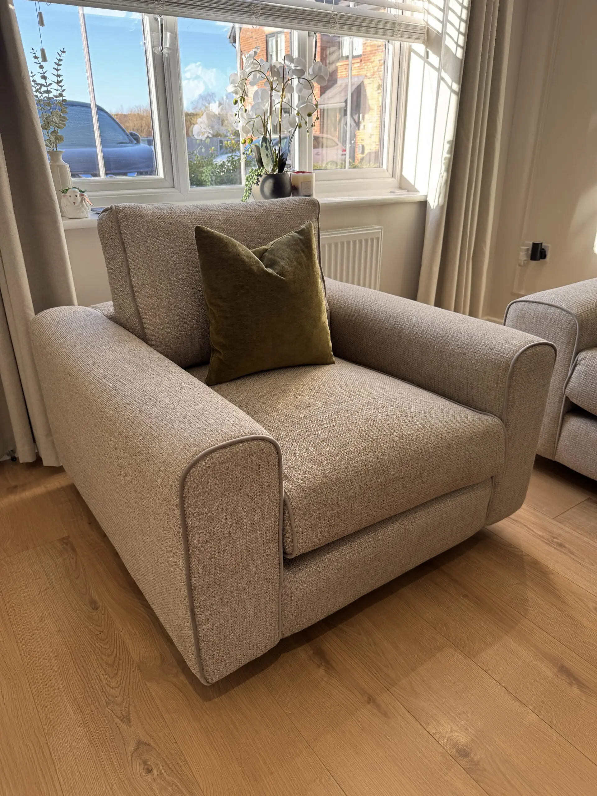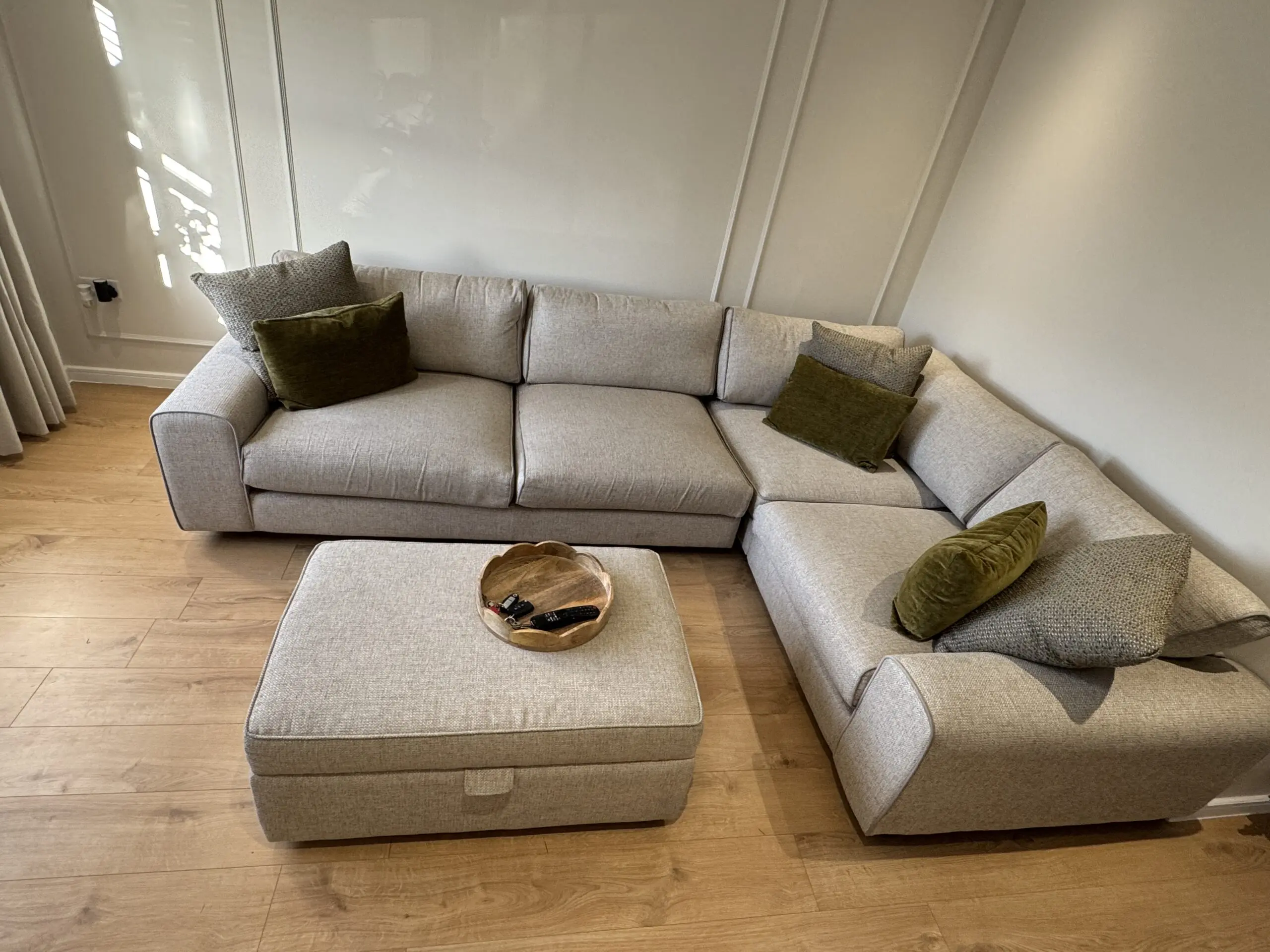 Selling our Sterling sofa set – includes the 3-seater sofa, matching corner/armchair, and storage footstool – in the premium chunky woven Stone fabric with Olive cushions.