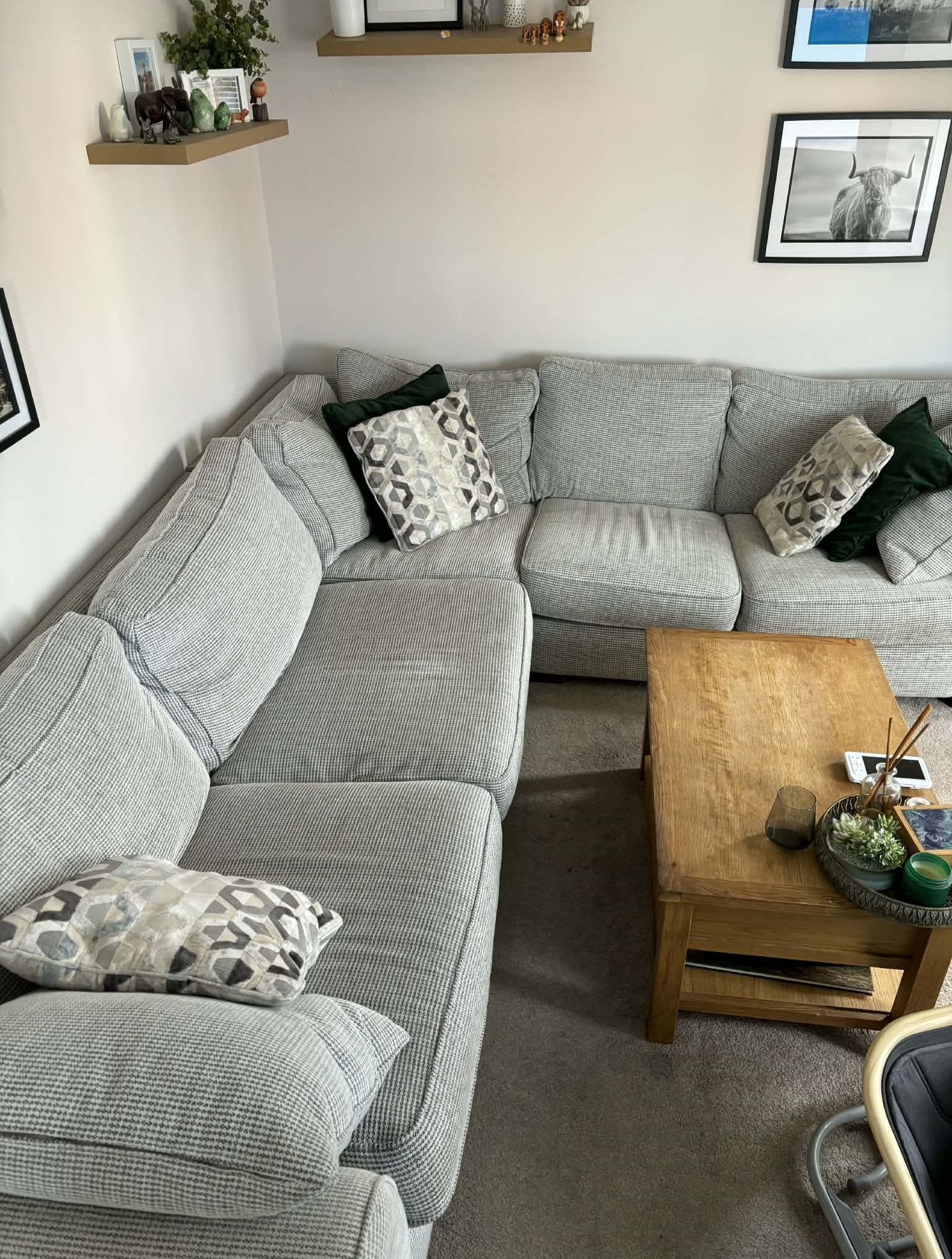 We have had the sofa since 2018 so it is well loved but well looked after and from a smoke free home. One of the cushions has a broken zip at the back, but this does not effect the use and can be easily fixed.