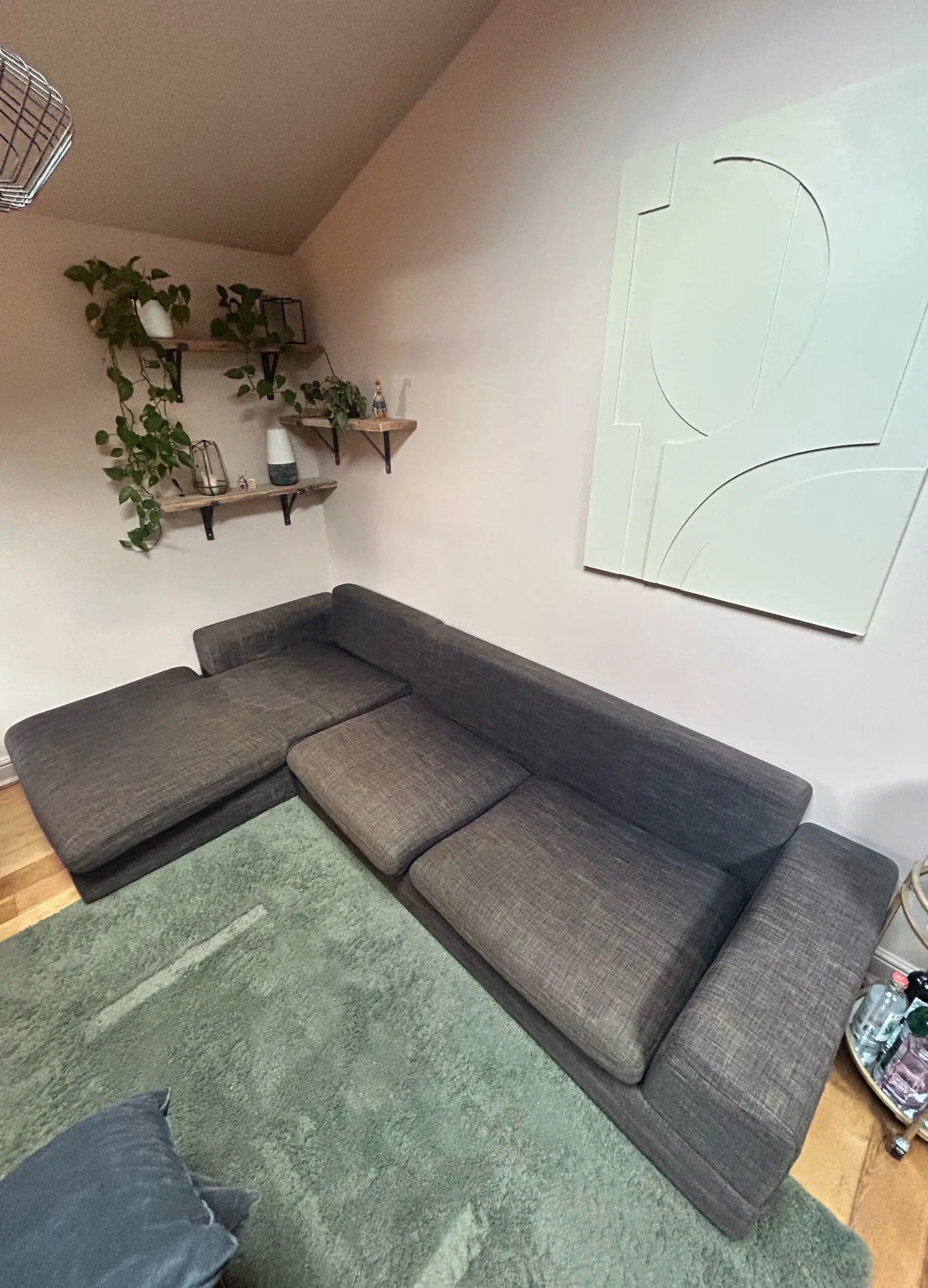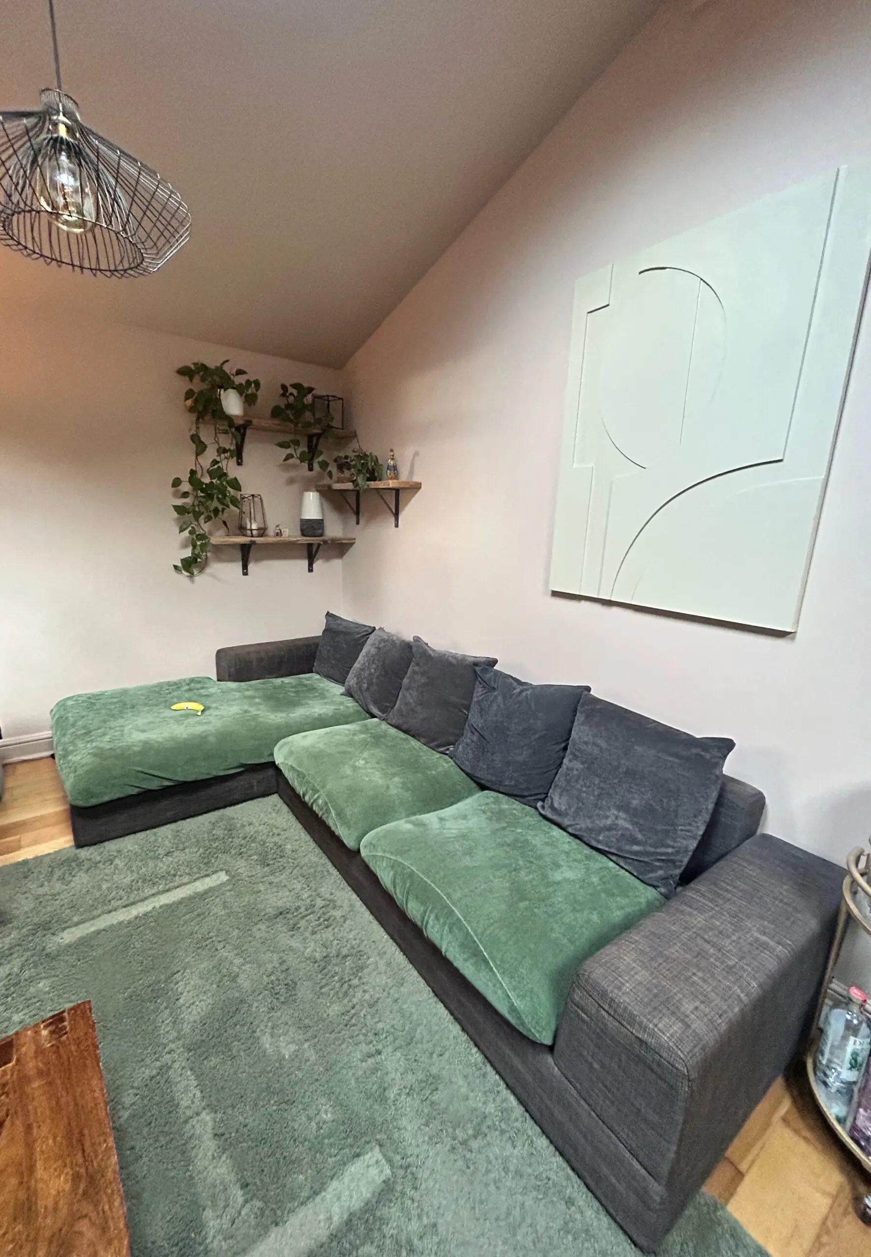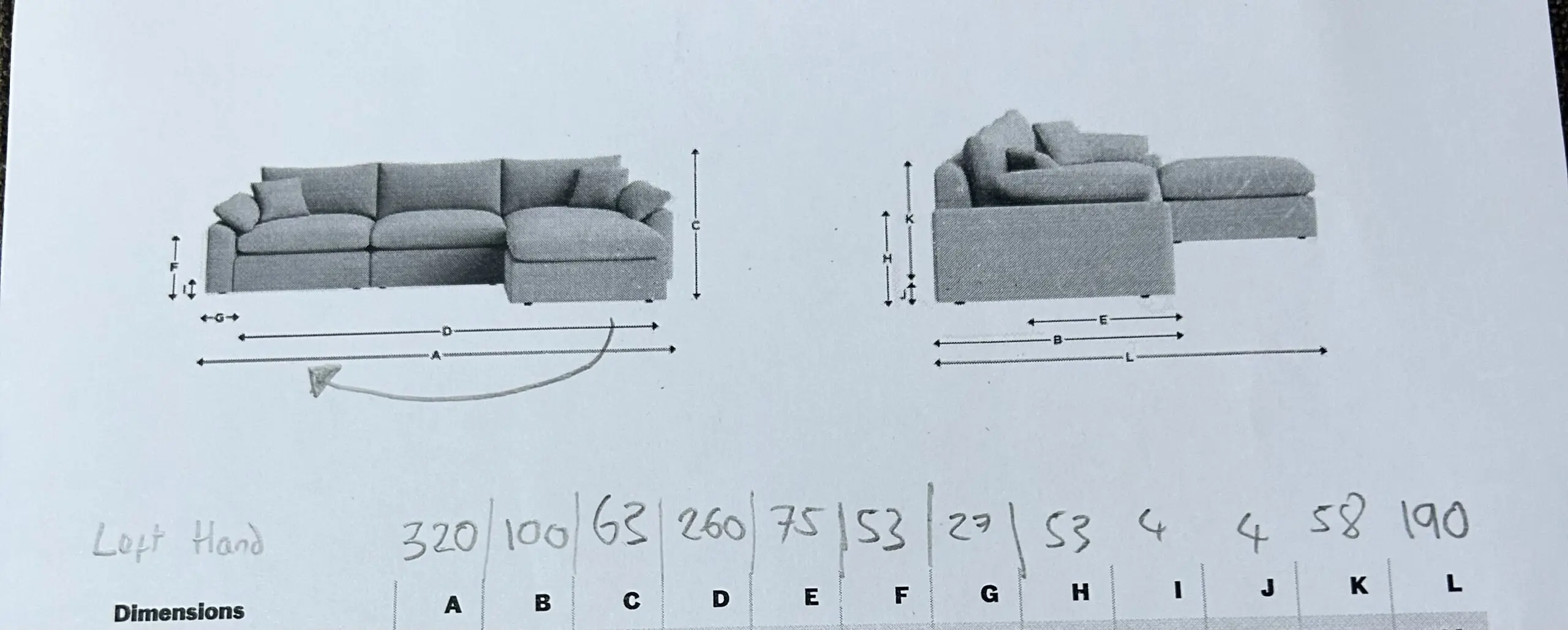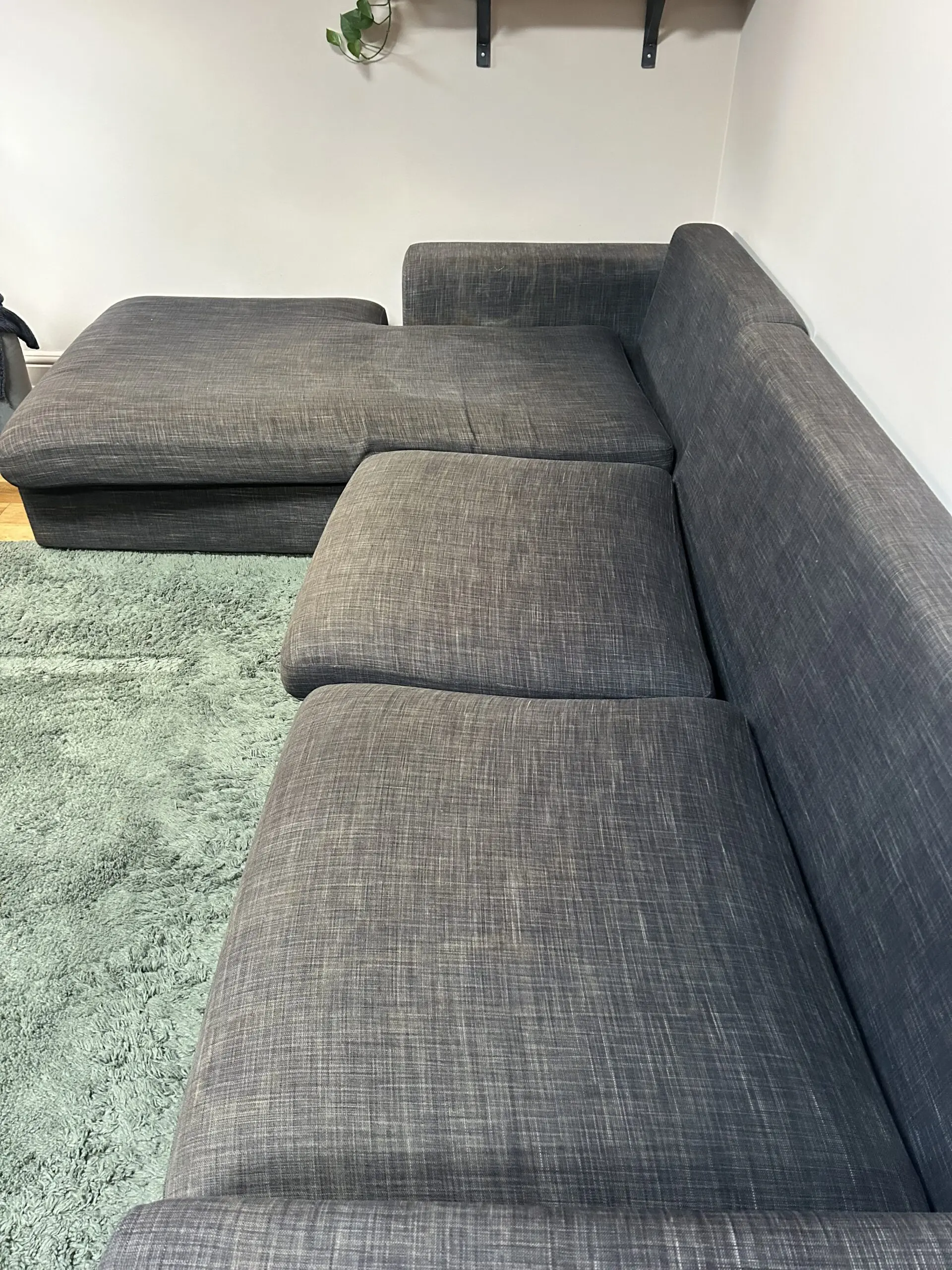 Left hand chaise lounge, breaks into two pieces at the chez. Sits 5 comfortably. Comes with grey cushions and green covers as seen.