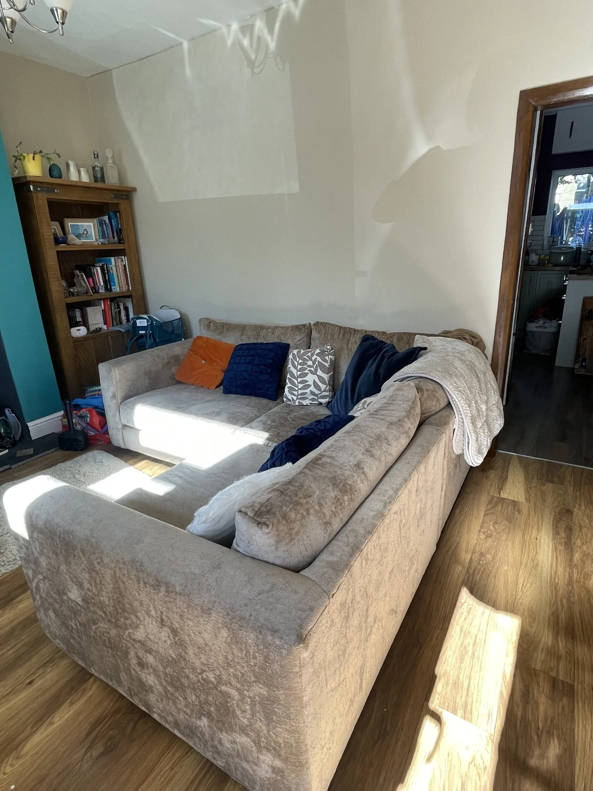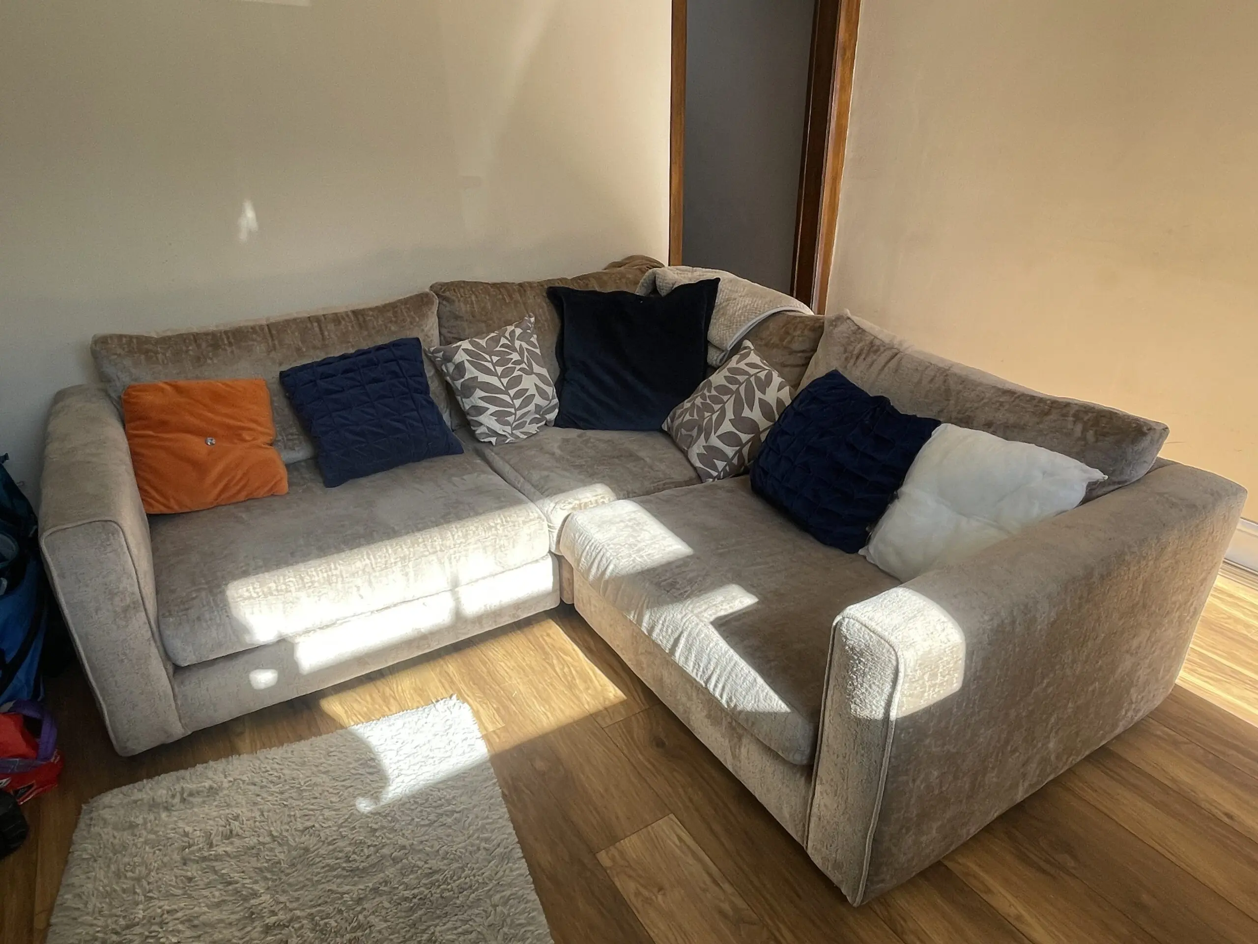 Sofology corner sofa in oatmeal / champagne. Less the 3 years old, in great condition. From a pet free and smoke free home.