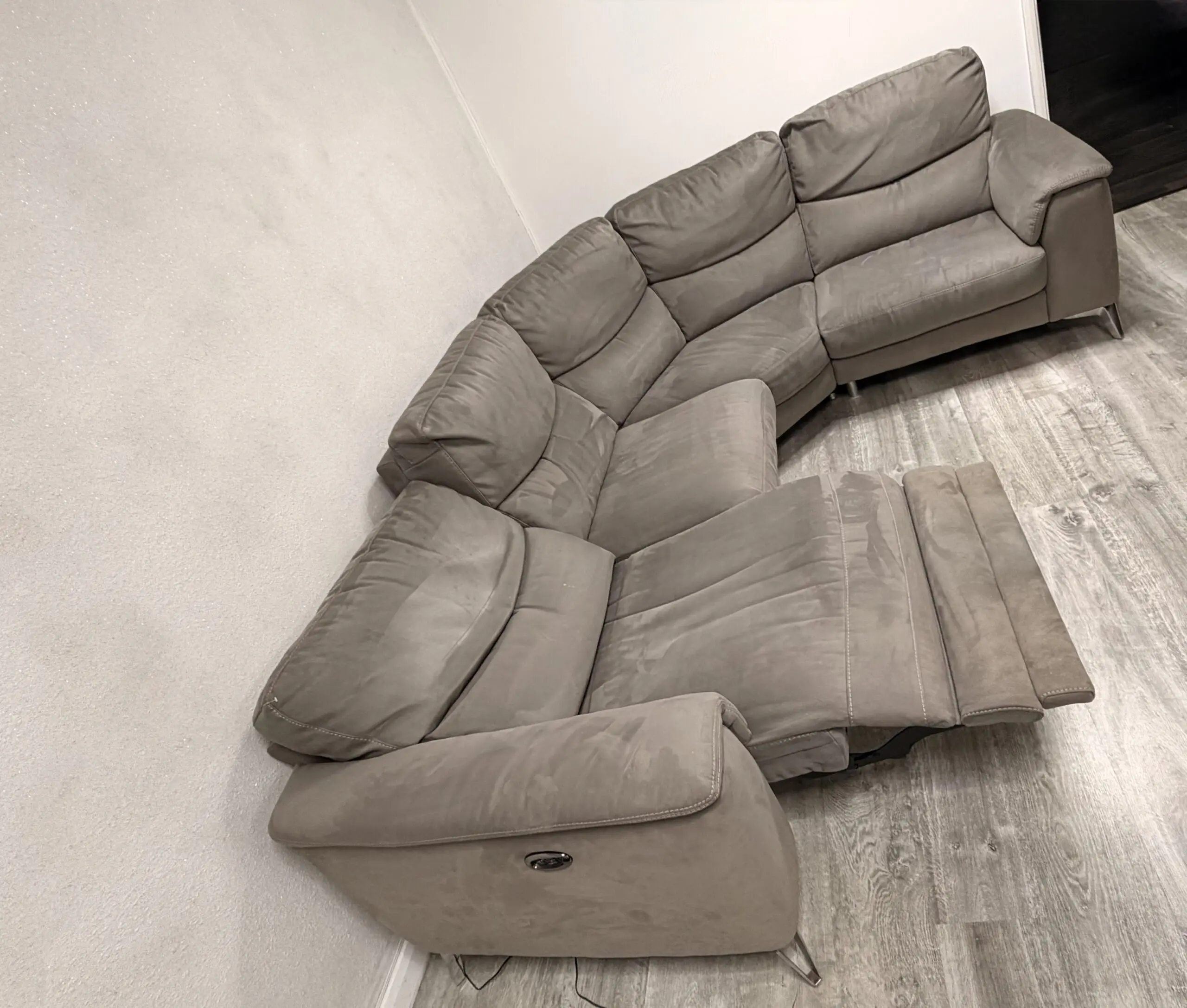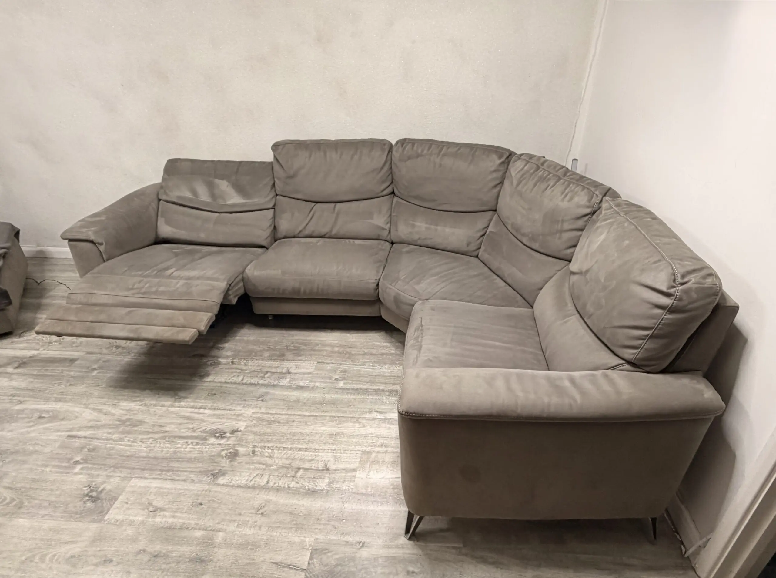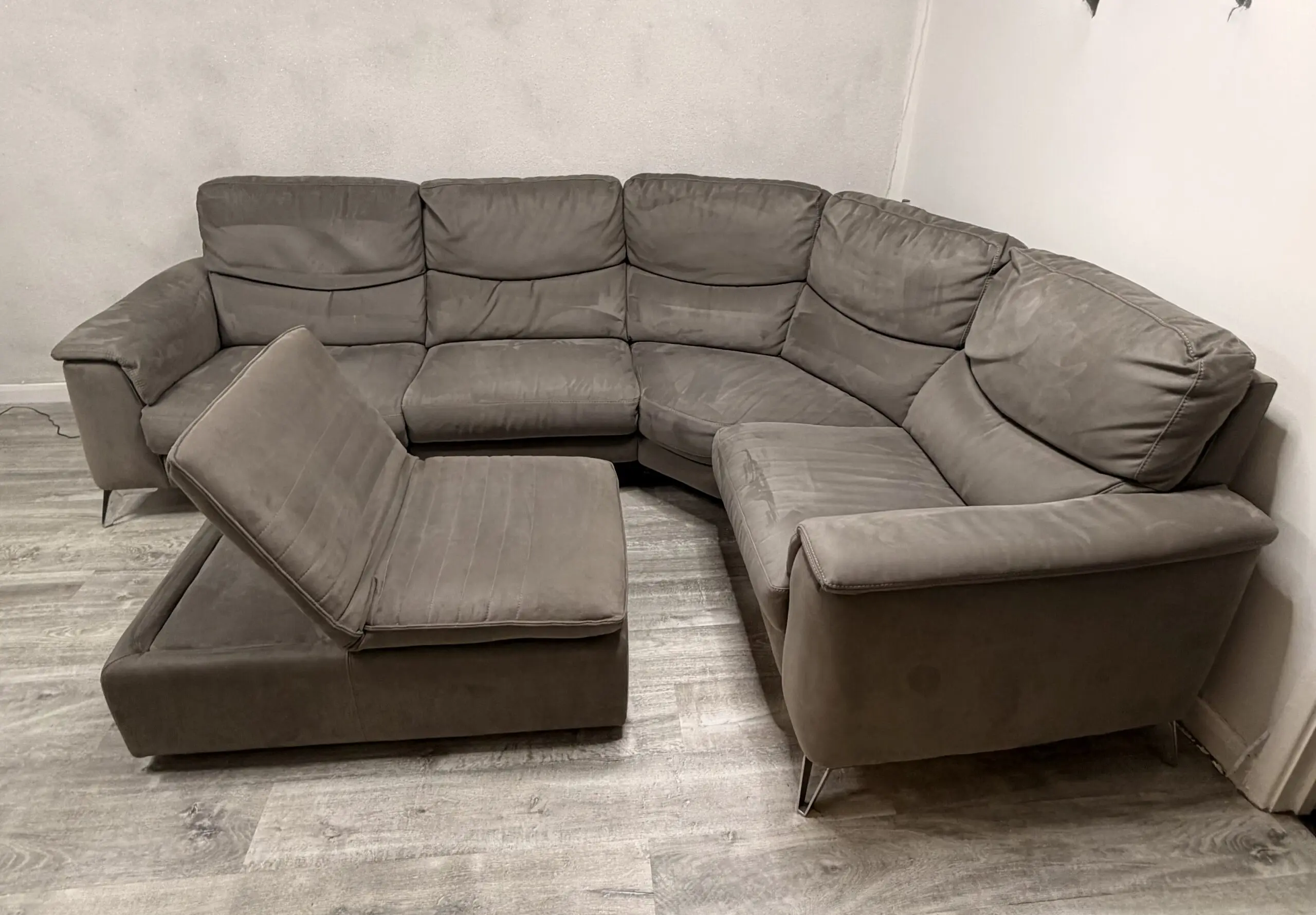 Corner sofa in light charcoal from sofology on silver legs with recliner +USB charge + footstool that can be use as a chair, come from free smoke house , no kids but small dog at home , blankets always used to cover sofa but will recommend a wash to give that fresh new look. No damage or tear just normal uses.