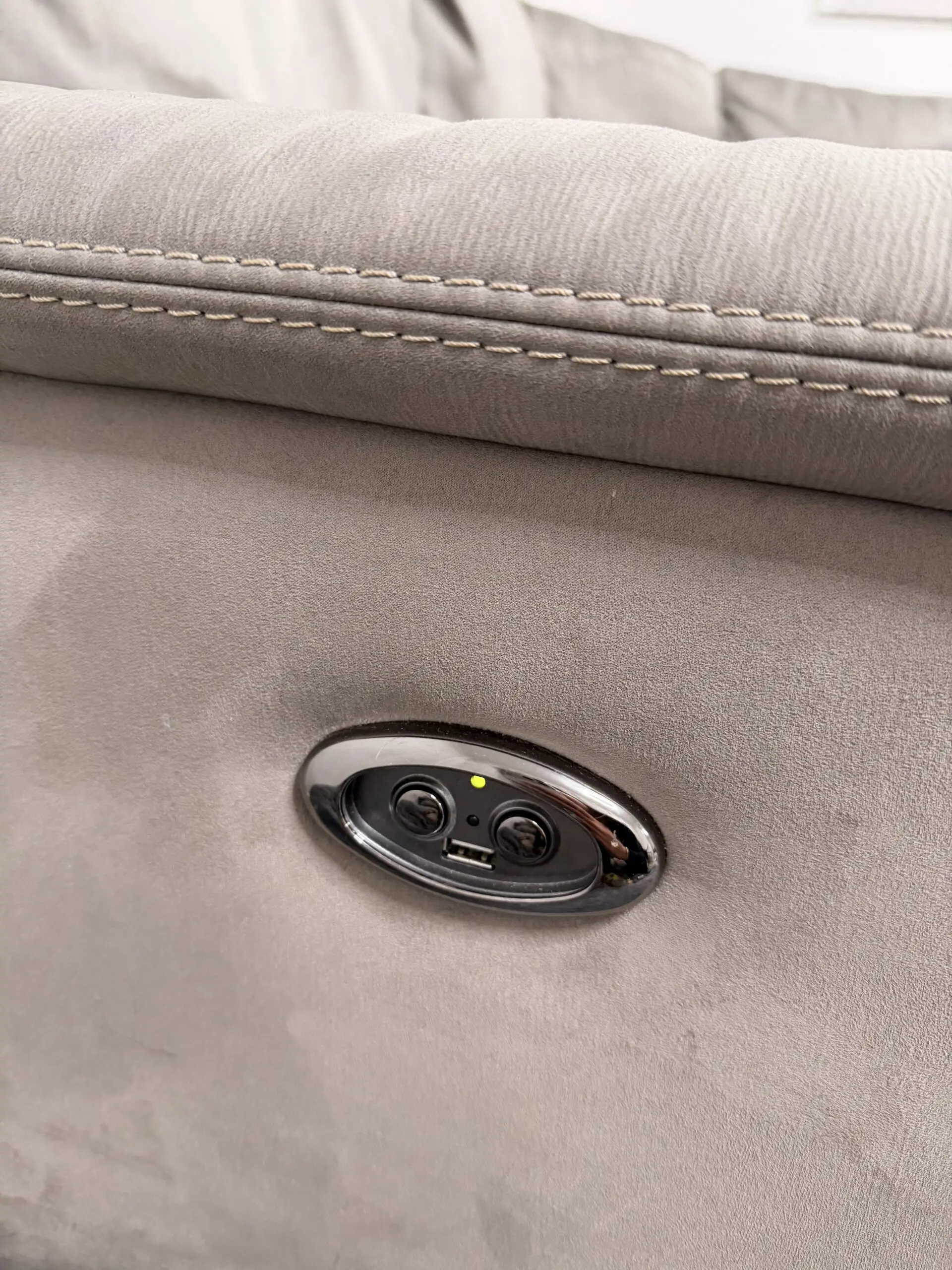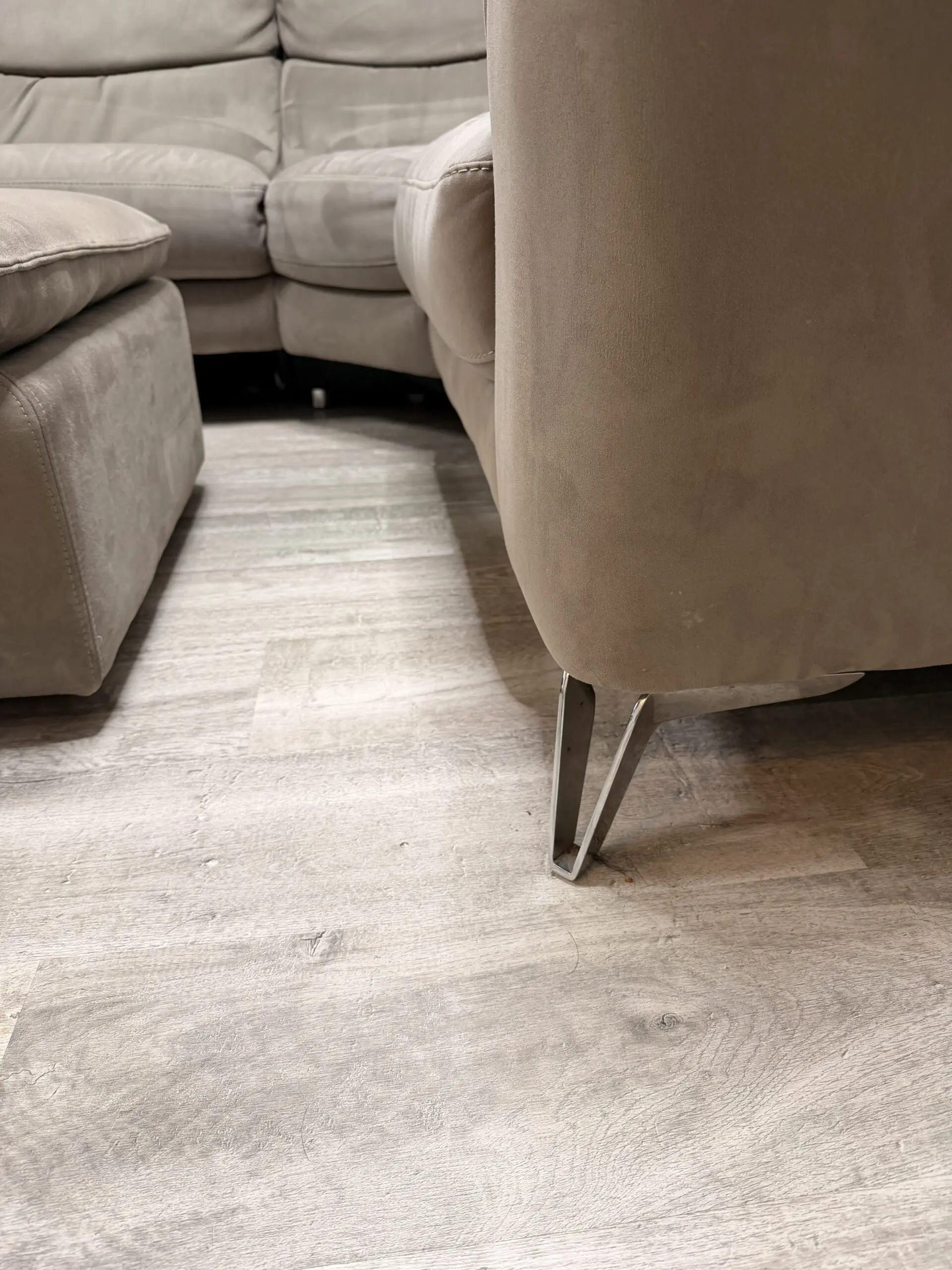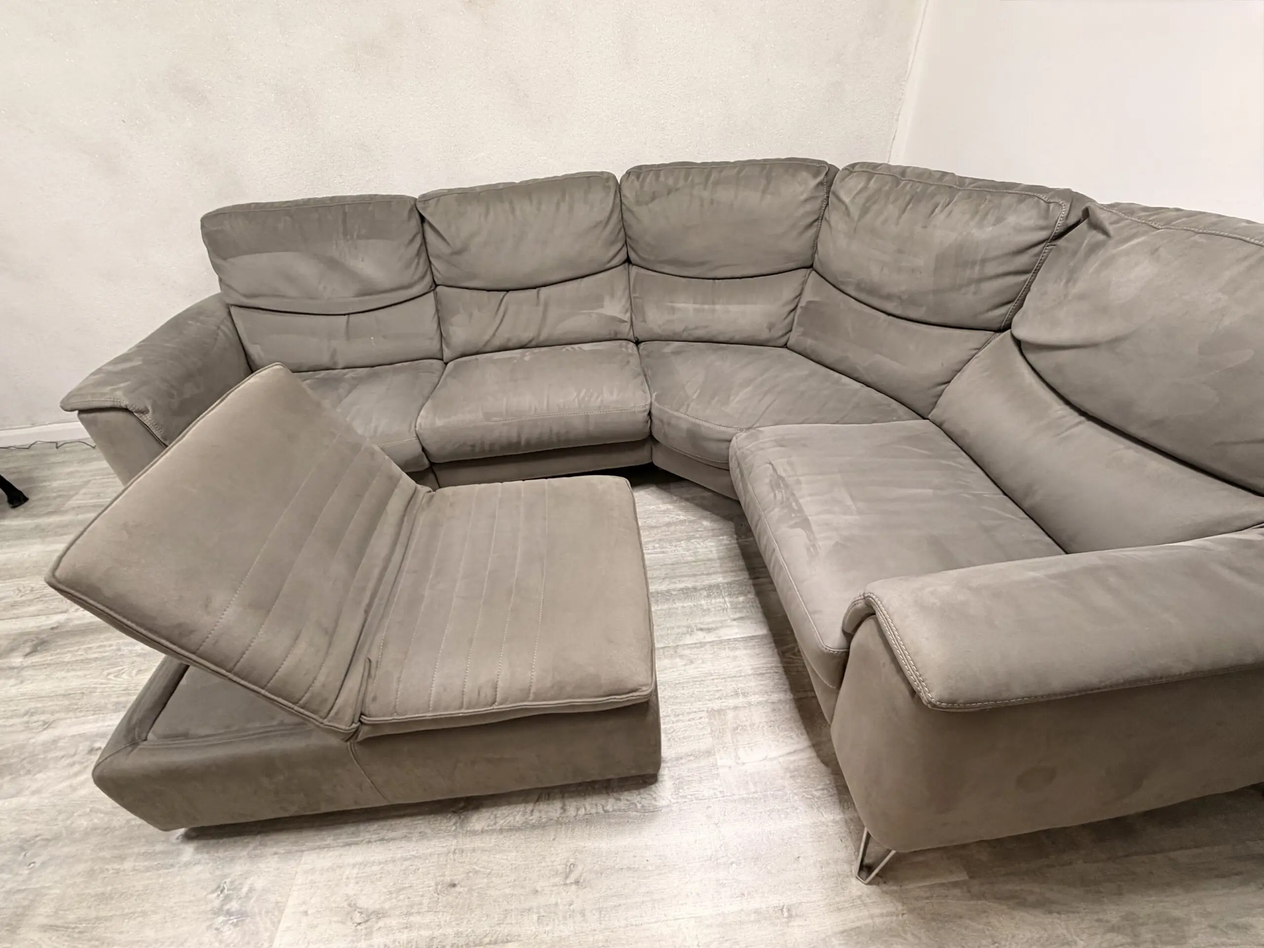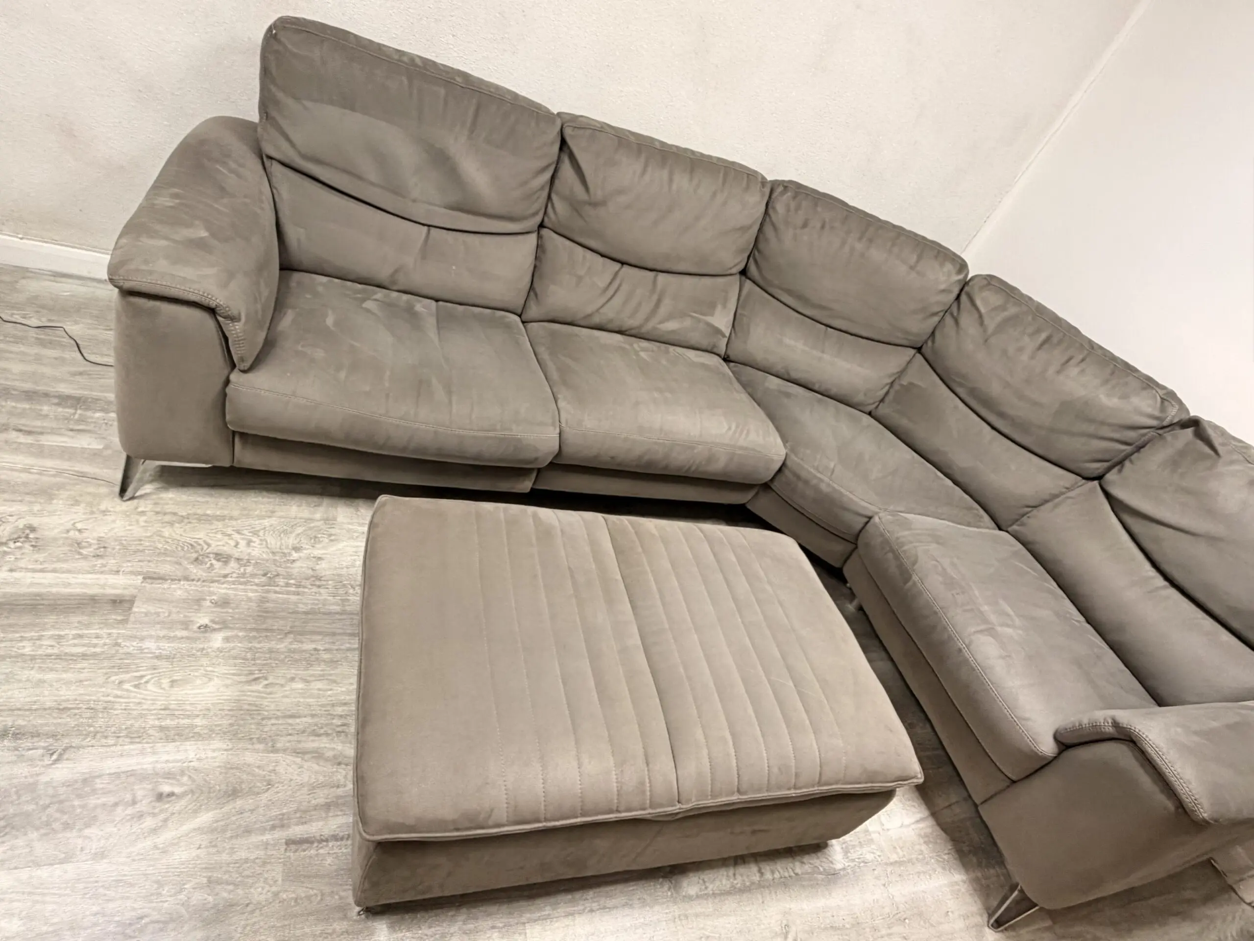 Corner sofa in light charcoal from sofology on silver legs with recliner +USB charge + footstool that can be use as a chair, come from free smoke house , no kids but small dog at home , blankets always used to cover sofa but will recommend a wash to give that fresh new look. No damage or tear just normal uses.
