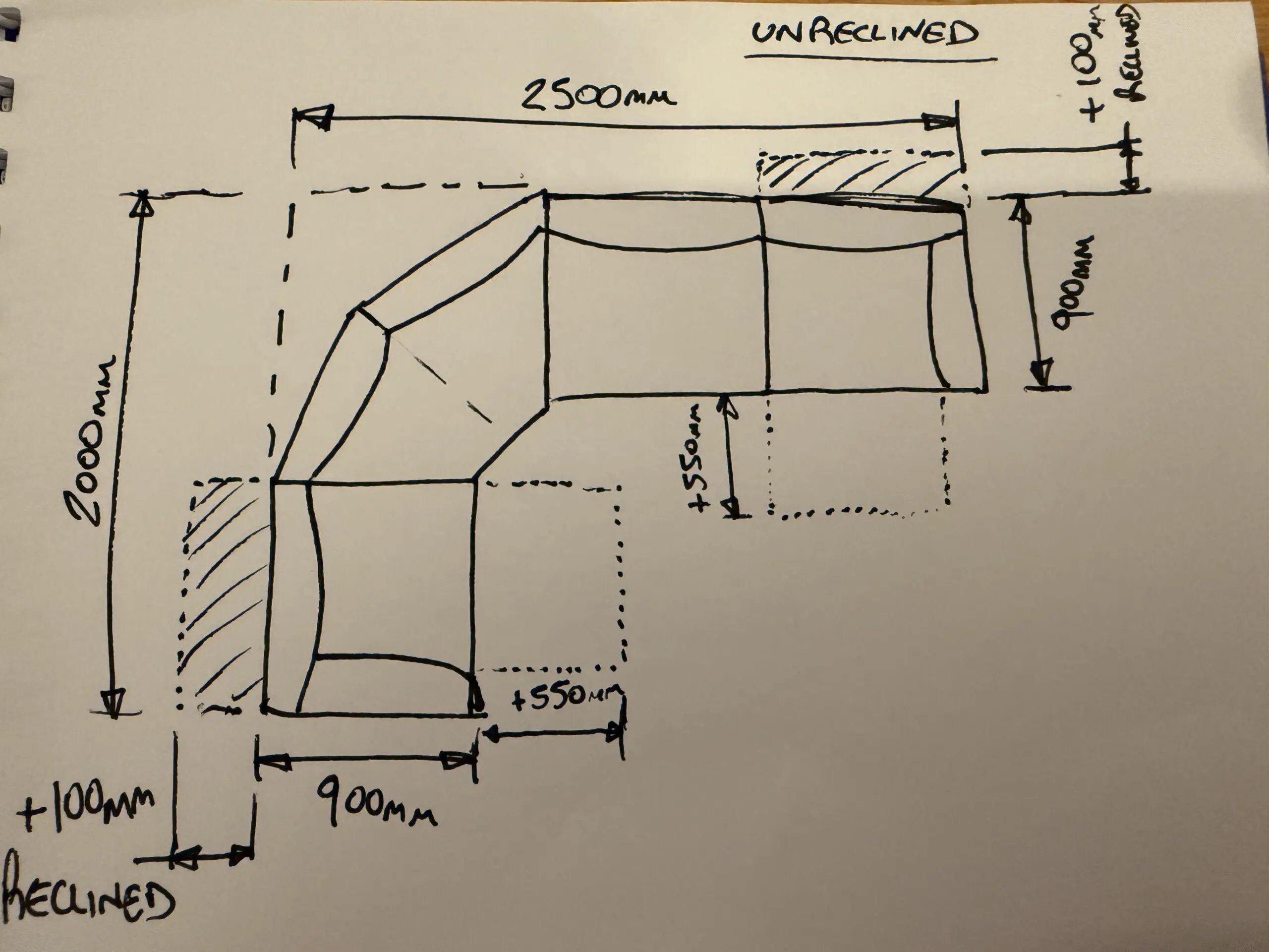 w203x262xh98xd100 (when reclined). Comes apart into 3 pieces for transport. See photos for other measurements.