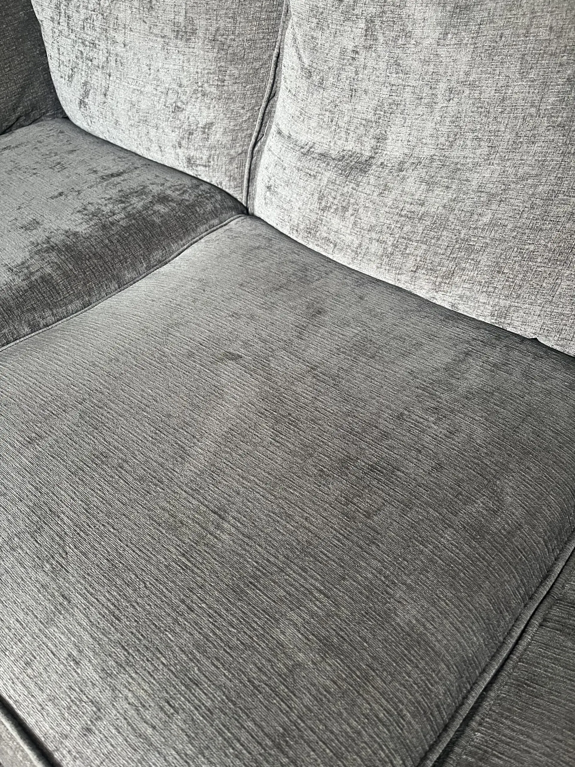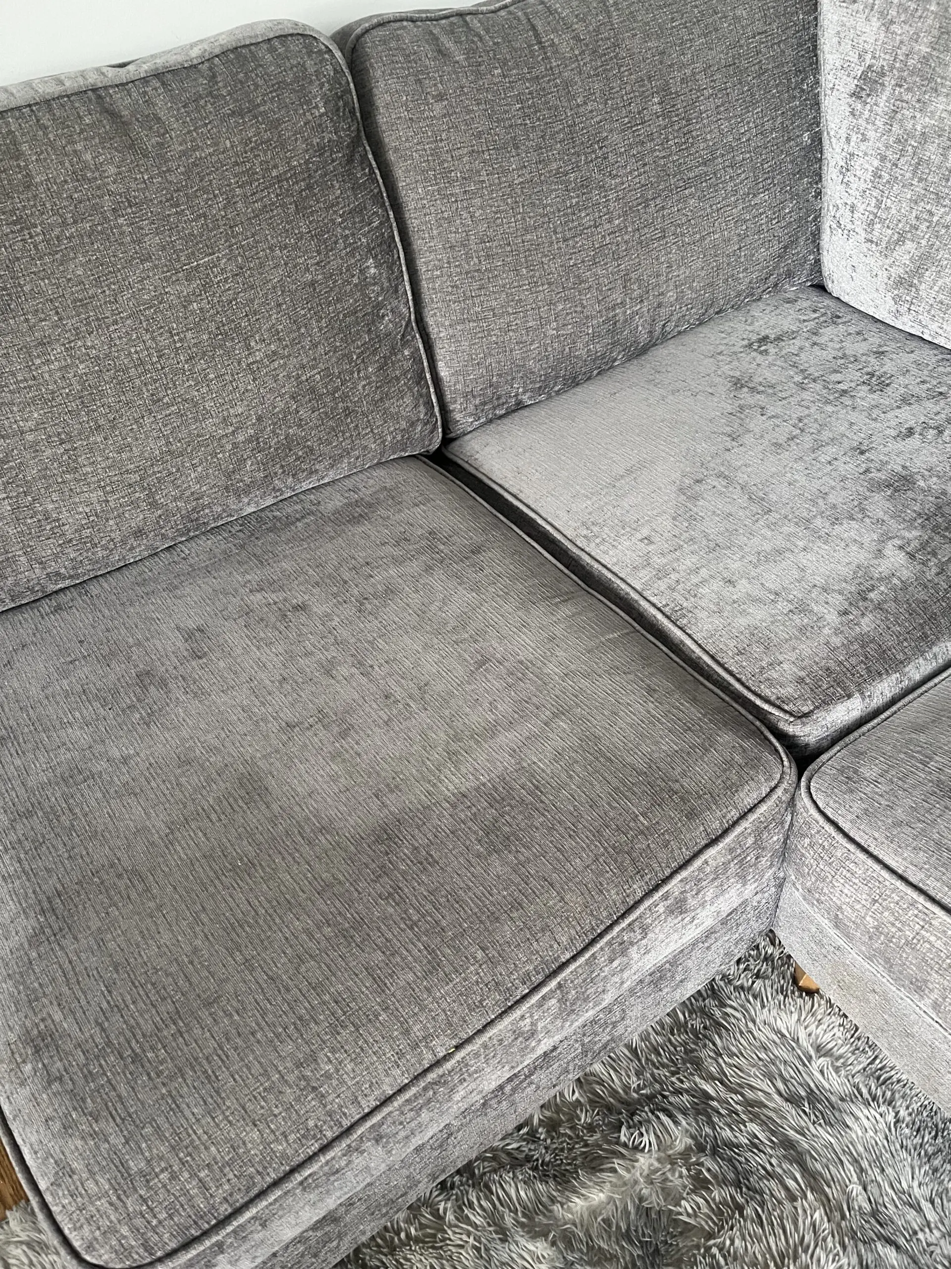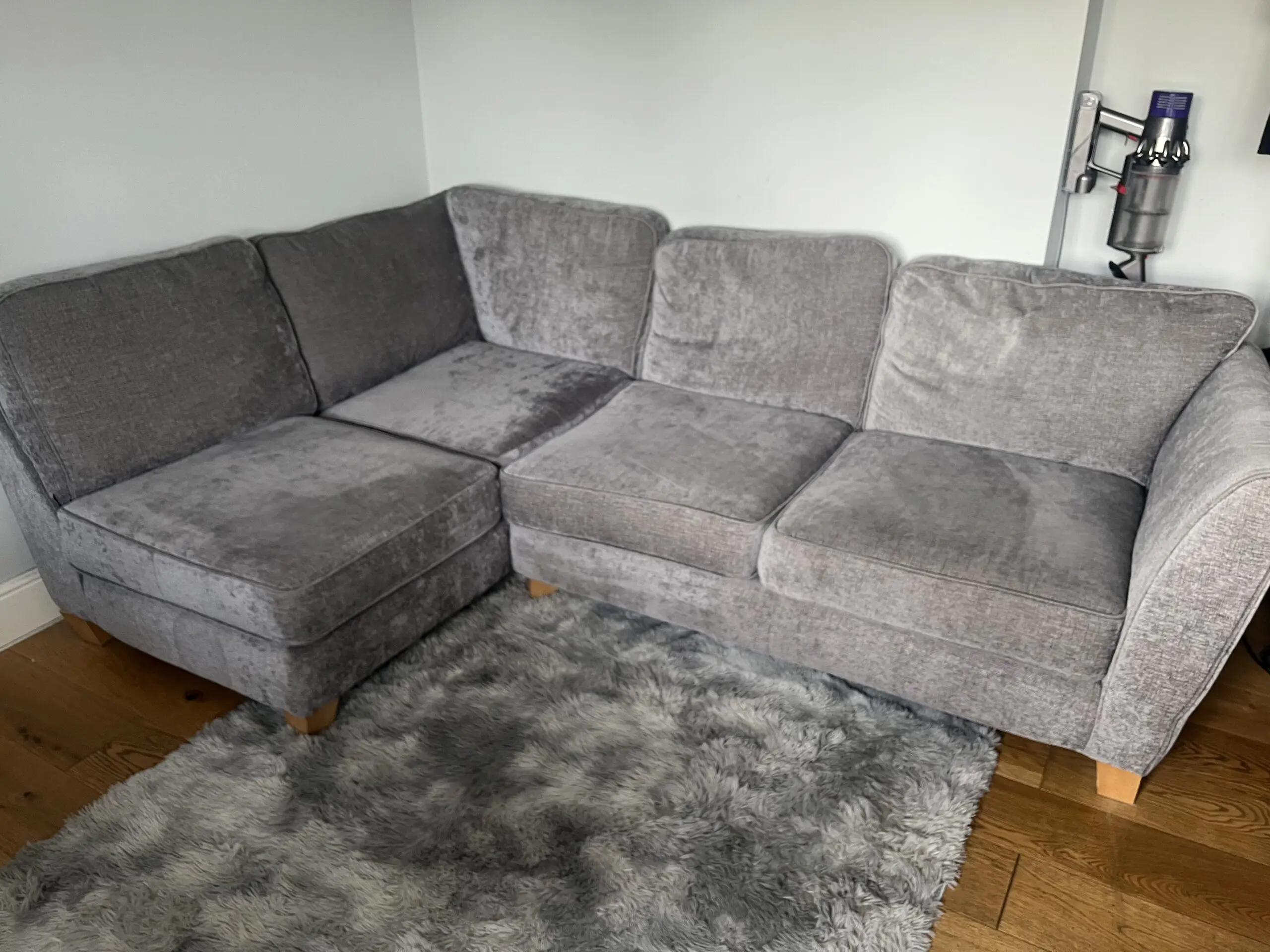 A comfortable grey corner sofa that seats up to four people. Around 9 years old, in good condition with some light wear but still plenty of life left. Fits well in most spaces.
