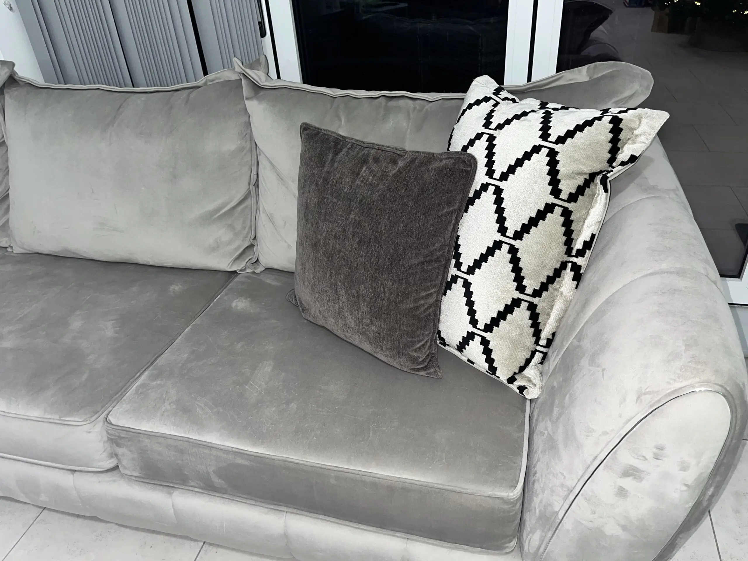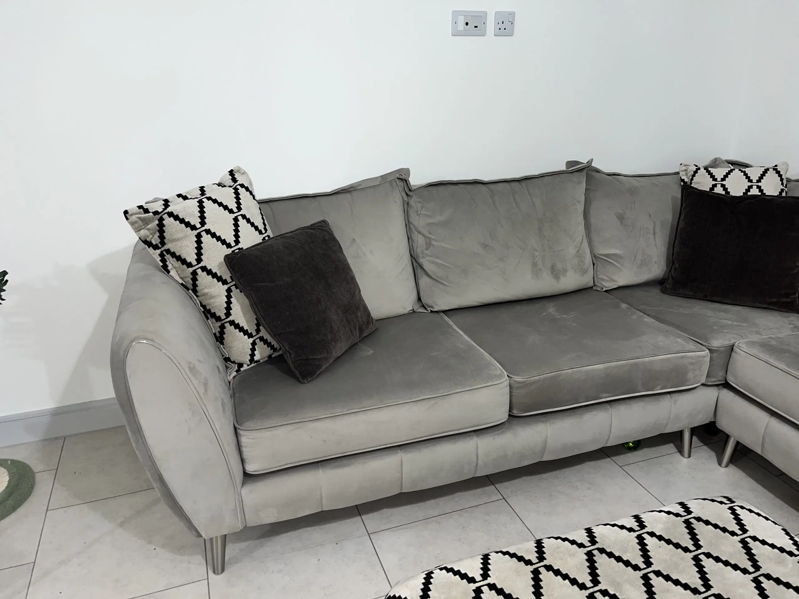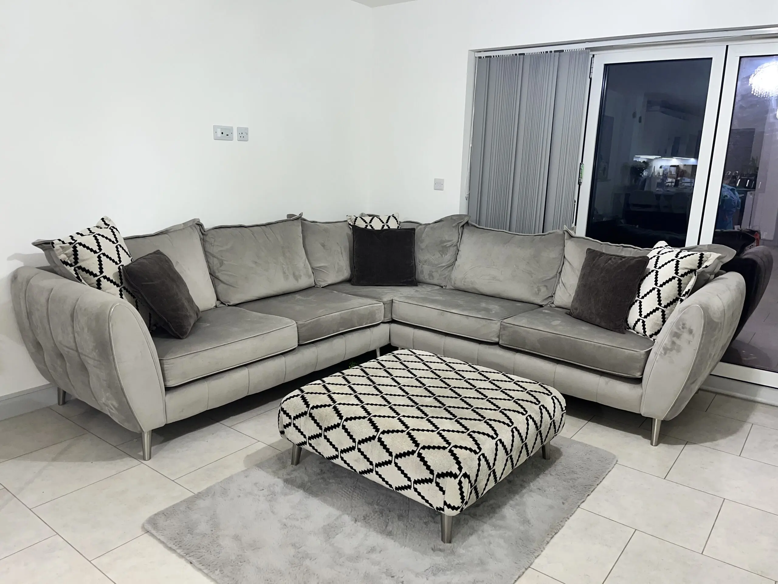 A beautiful 3×3 corner sofa, matching cushions and footstool. Kept in an excellent condition, with an unused Sofology care kit available. Will also clean it before pick up.