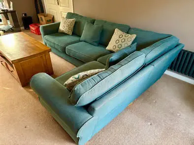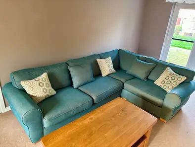 Large corner sofa with five matching cushions. Near perfect condition, and very comfortable. Only selling as we moved house and it doesn’t fit the new living room (as seen in photos).