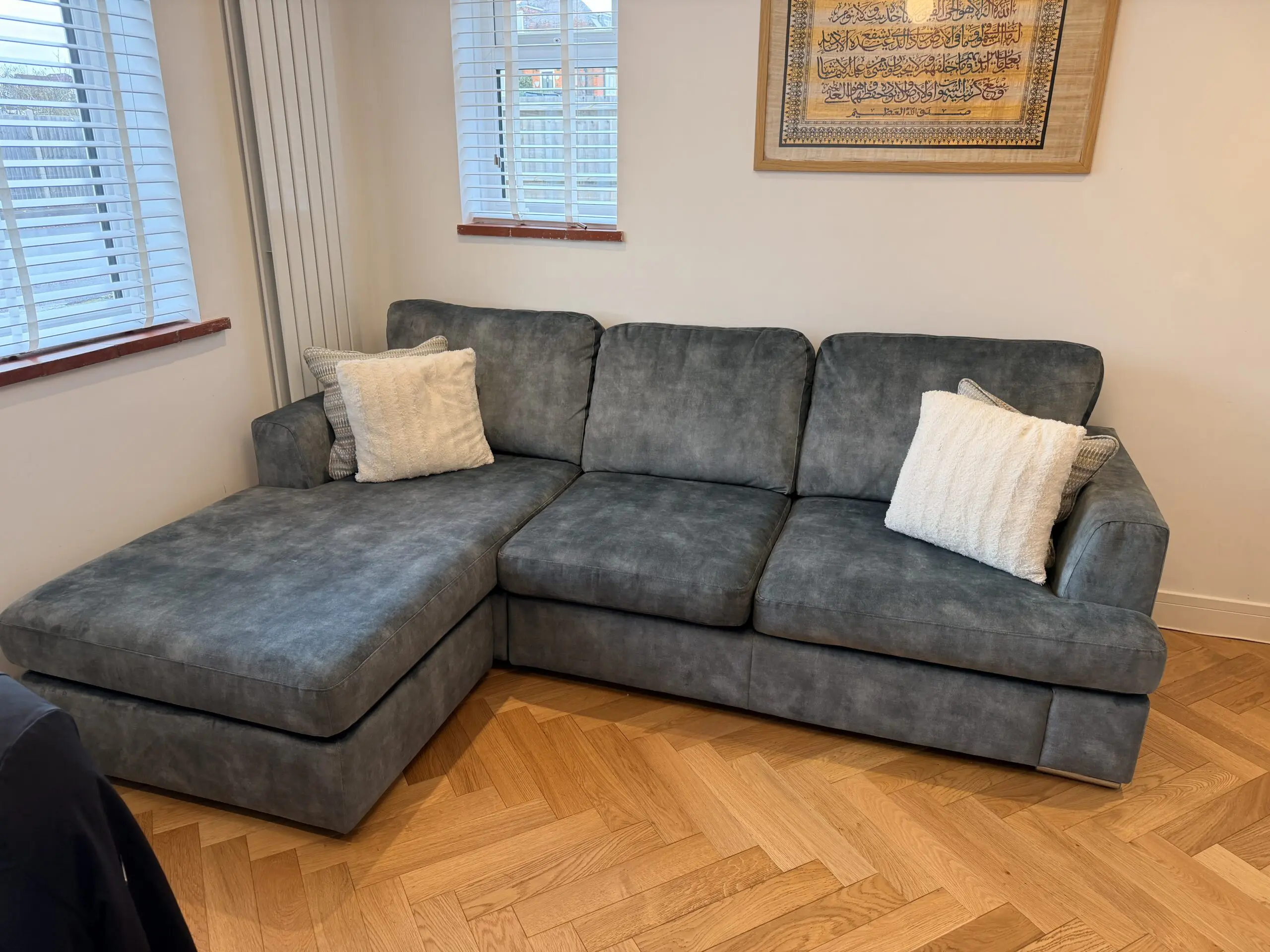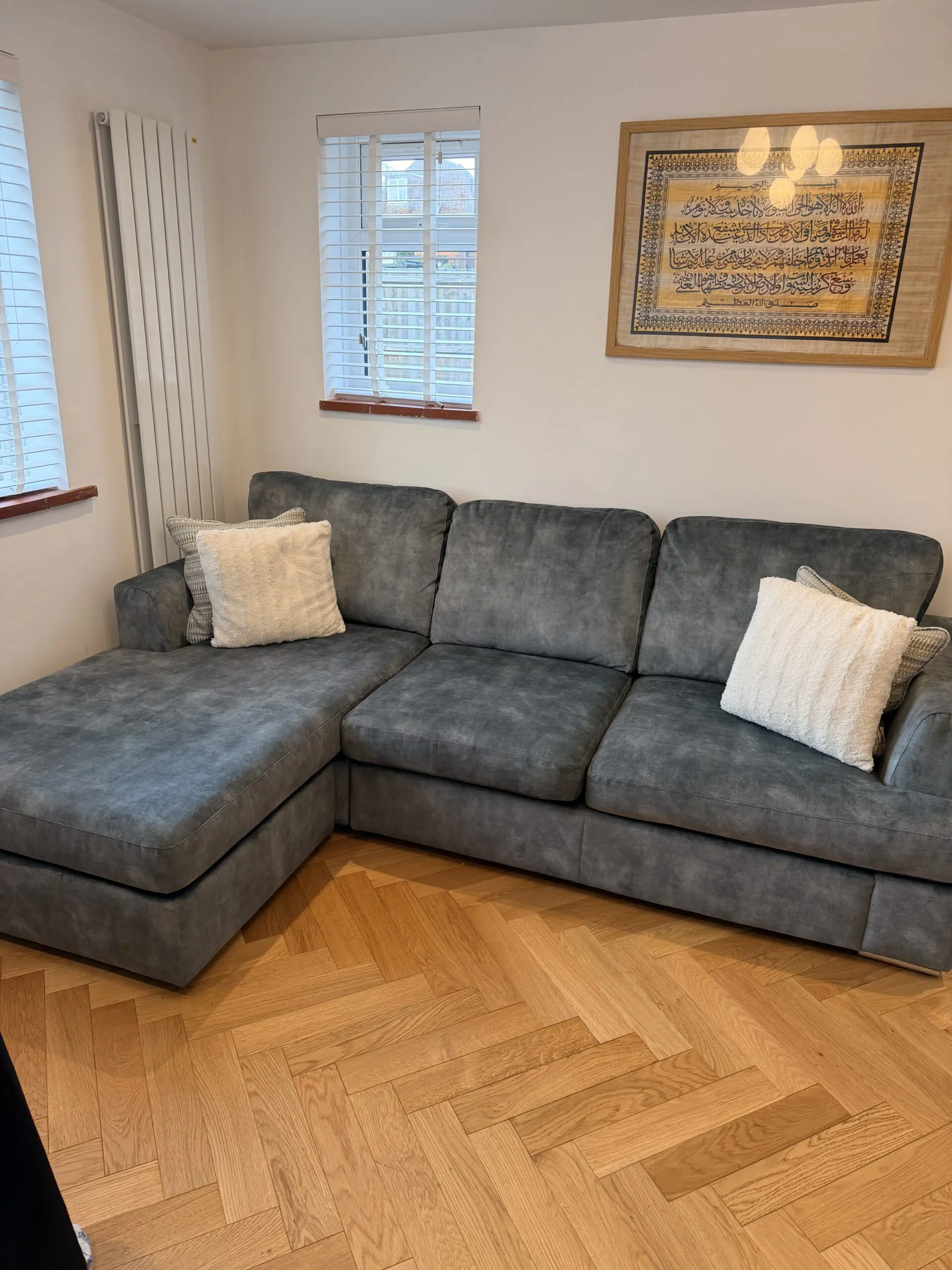 Luxury velvet blue L-shaped corner sofa from Sofology, bought in 2024 (original price £1,400).