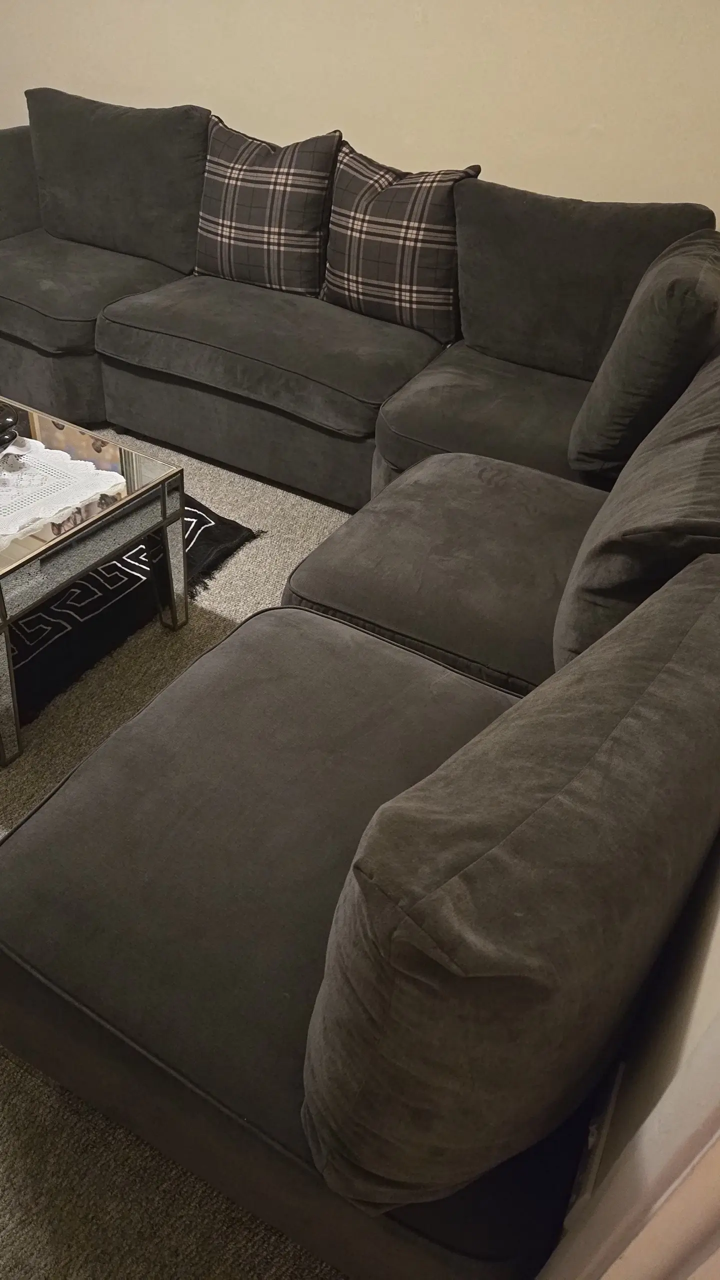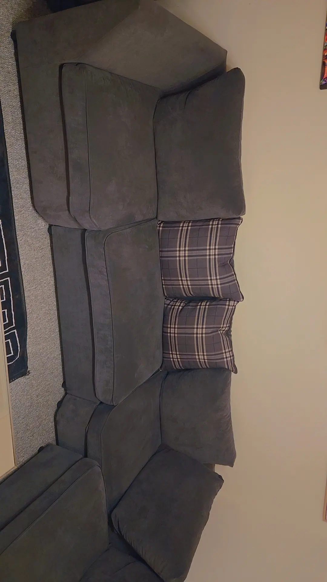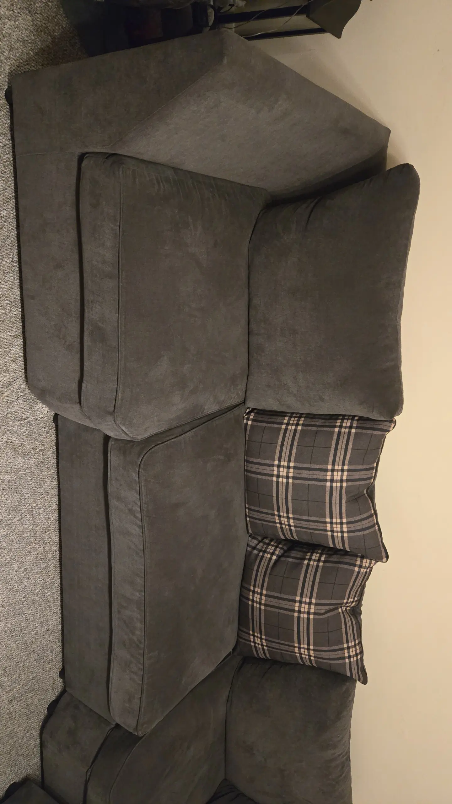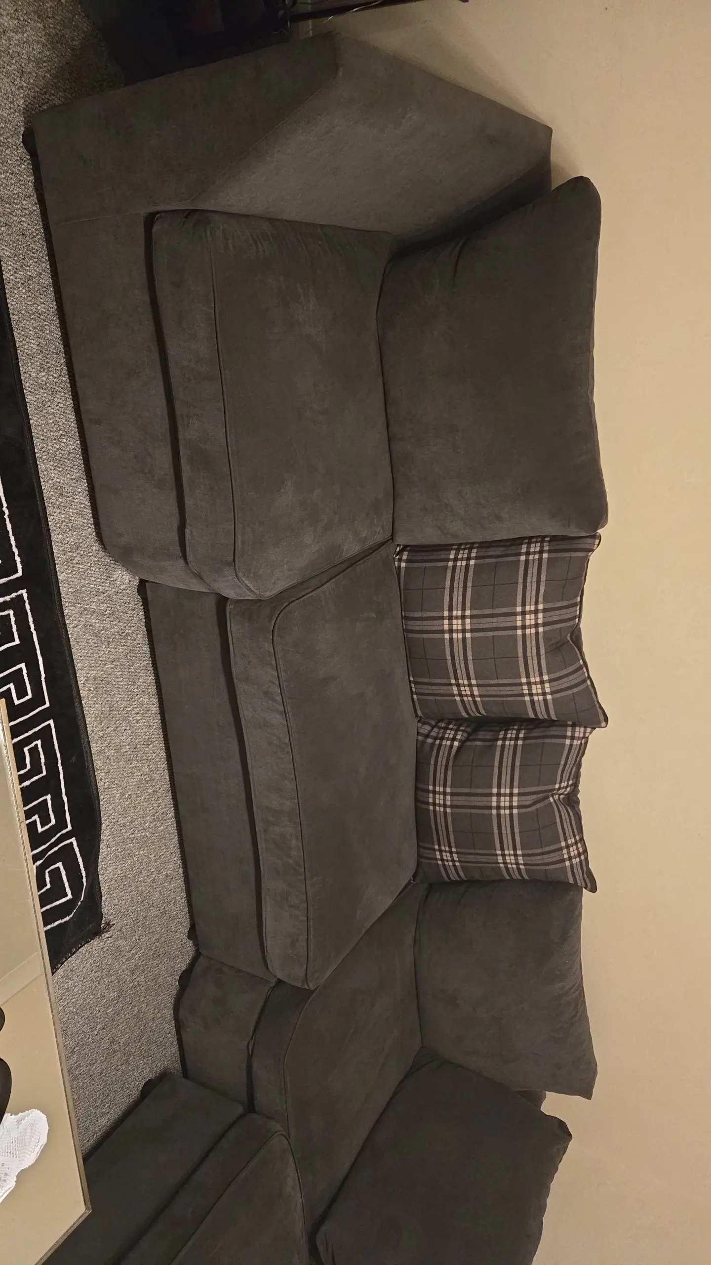 Stylish Grey Sectional (Corner and a 2in 1seater sofa), Stylish plaid accent pillows, Modern, versatile grey fabric.