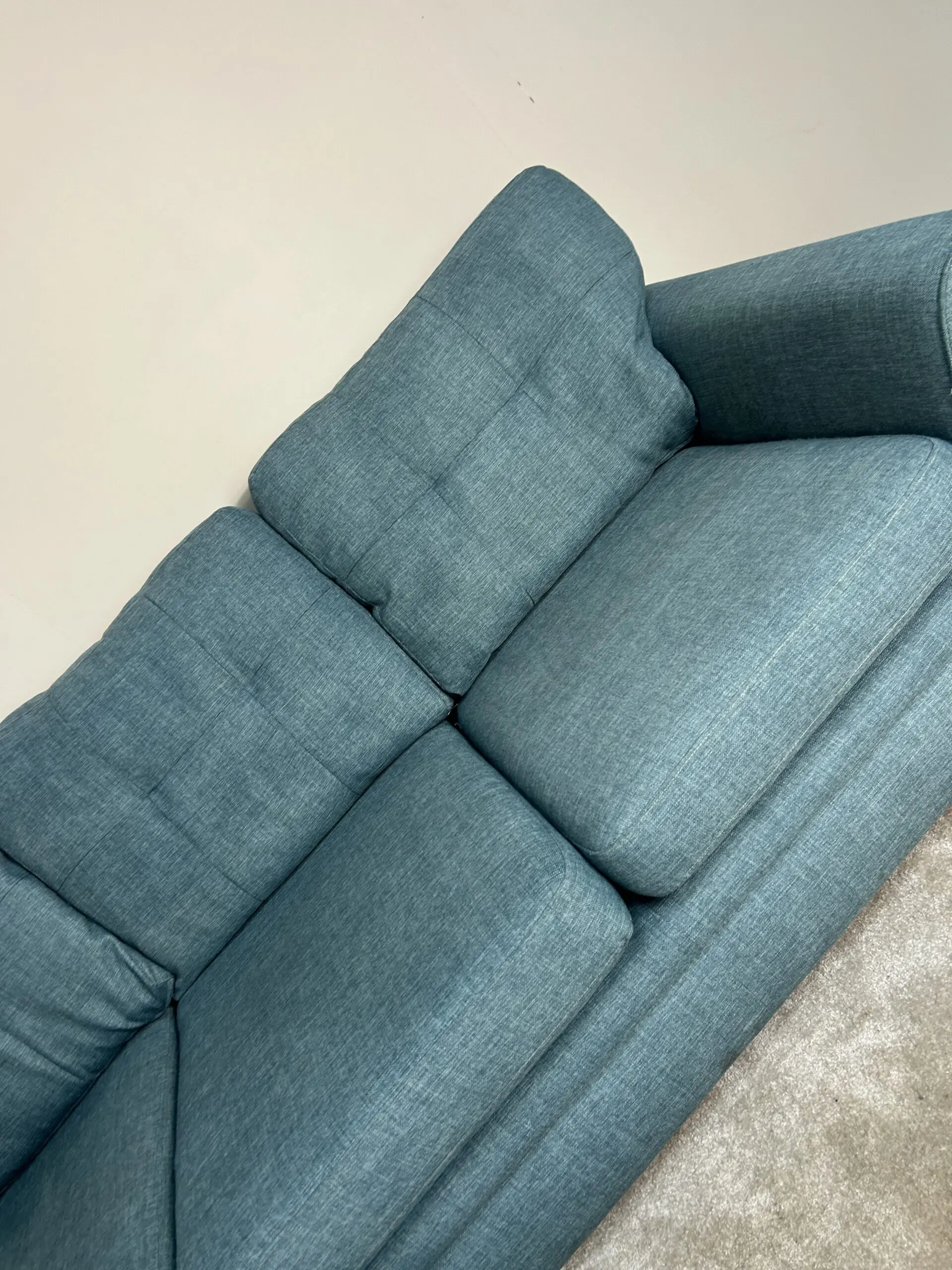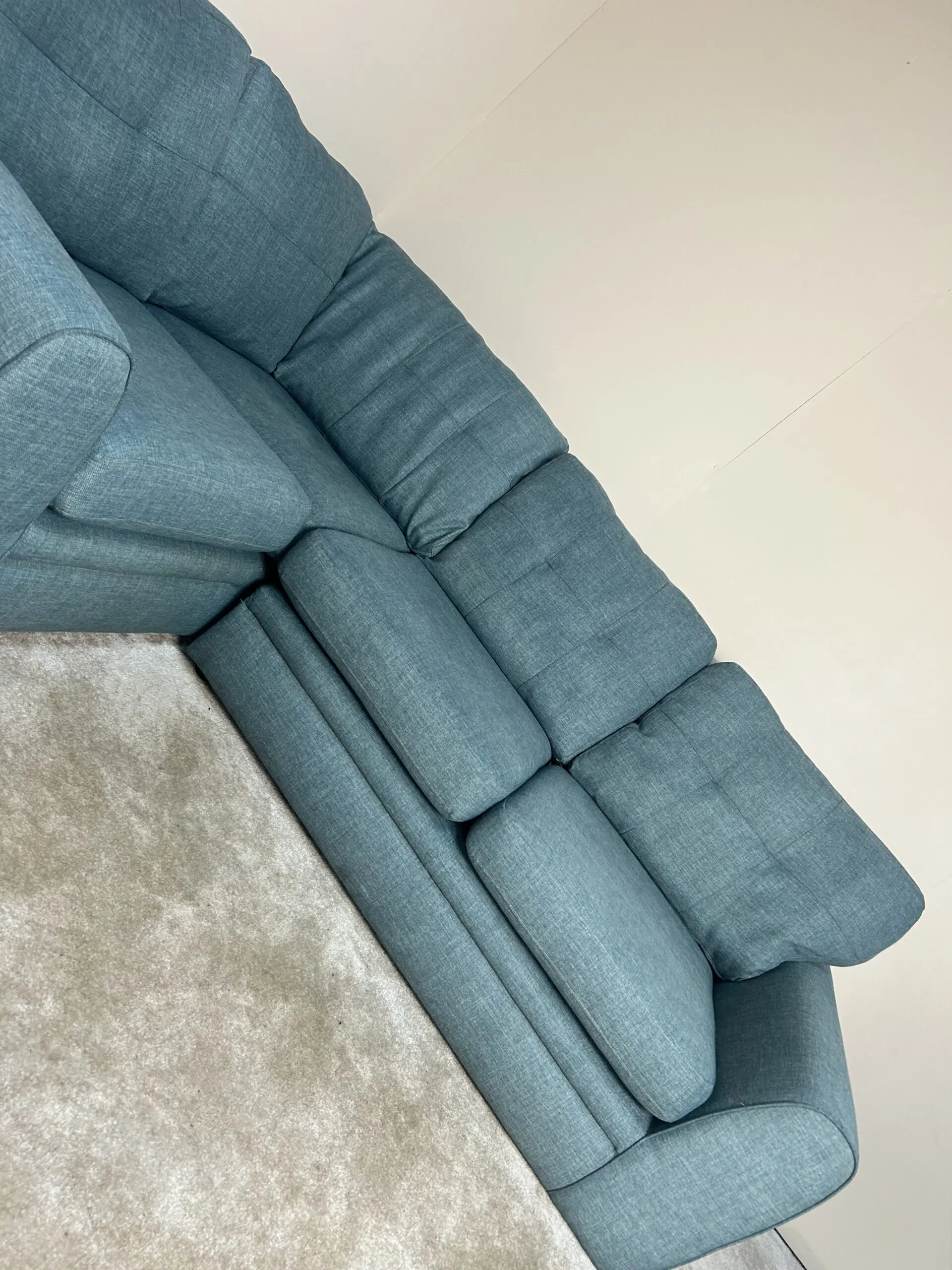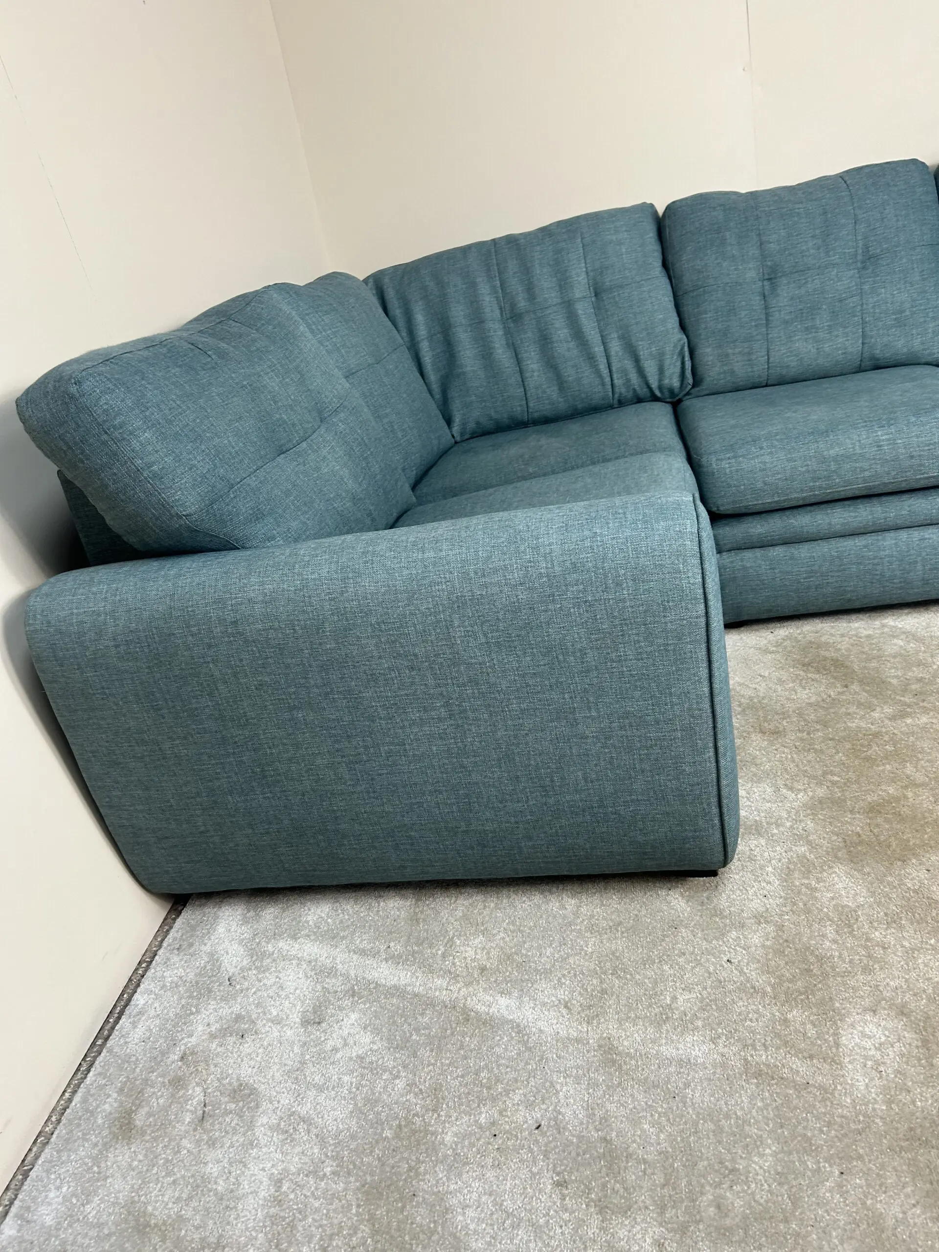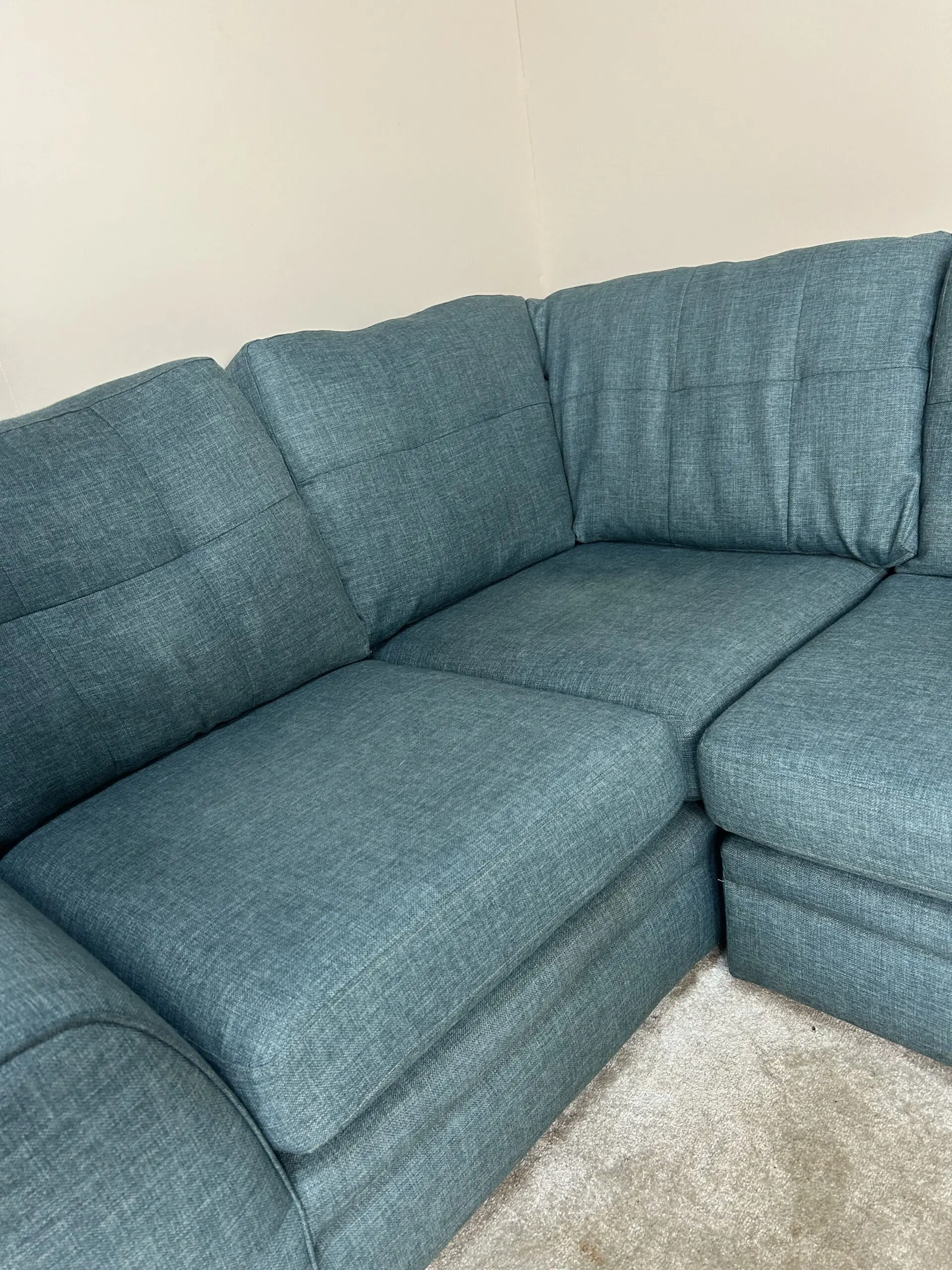 Well-built, sturdy corner sofa in a stylish teal blue fabric. In excellent condition with supportive cushions and a very comfortable sit. Solid construction and good-quality upholstery throughout.