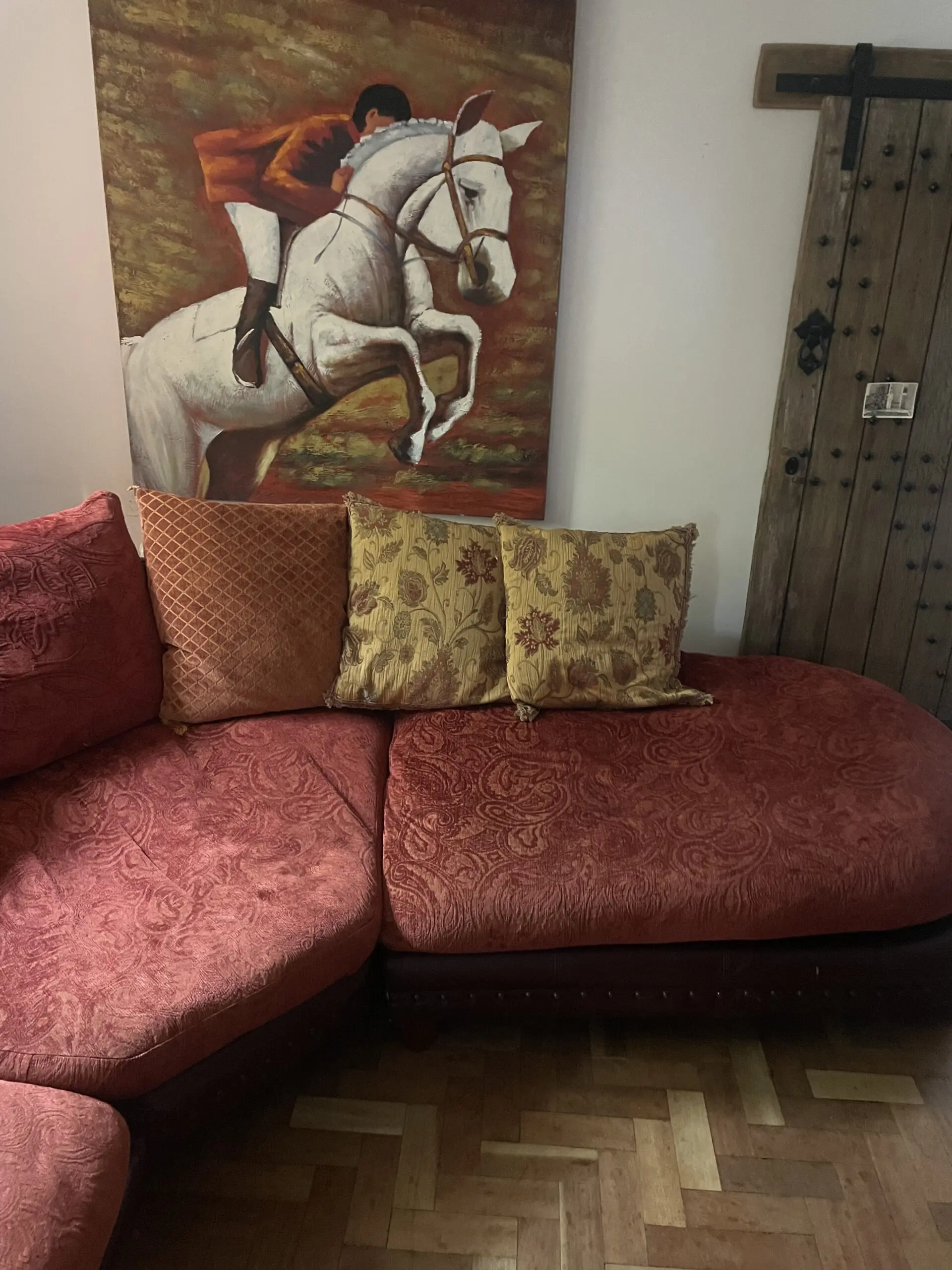 Leather ,material with hardwood feet ,feather seats and pillows,
