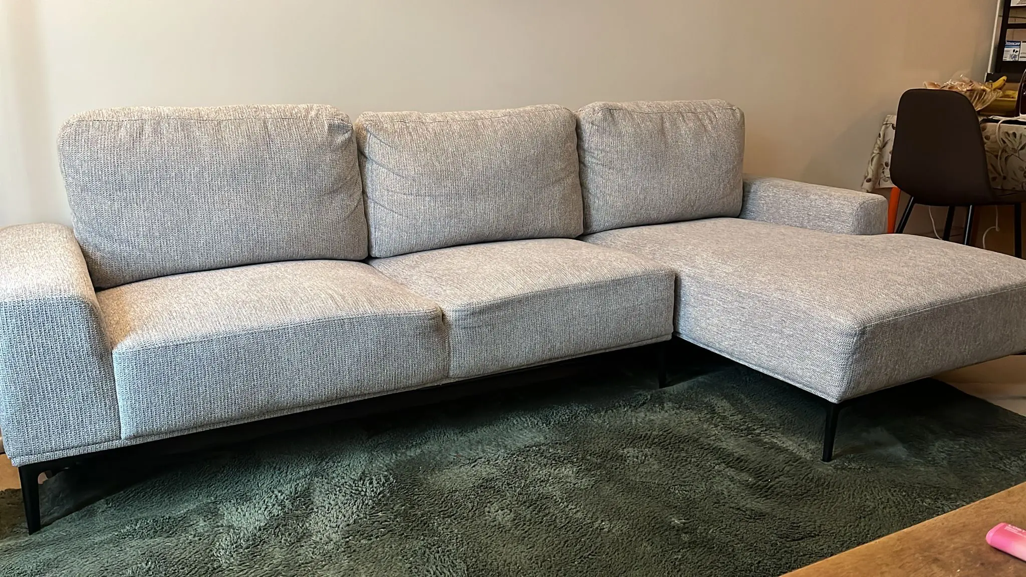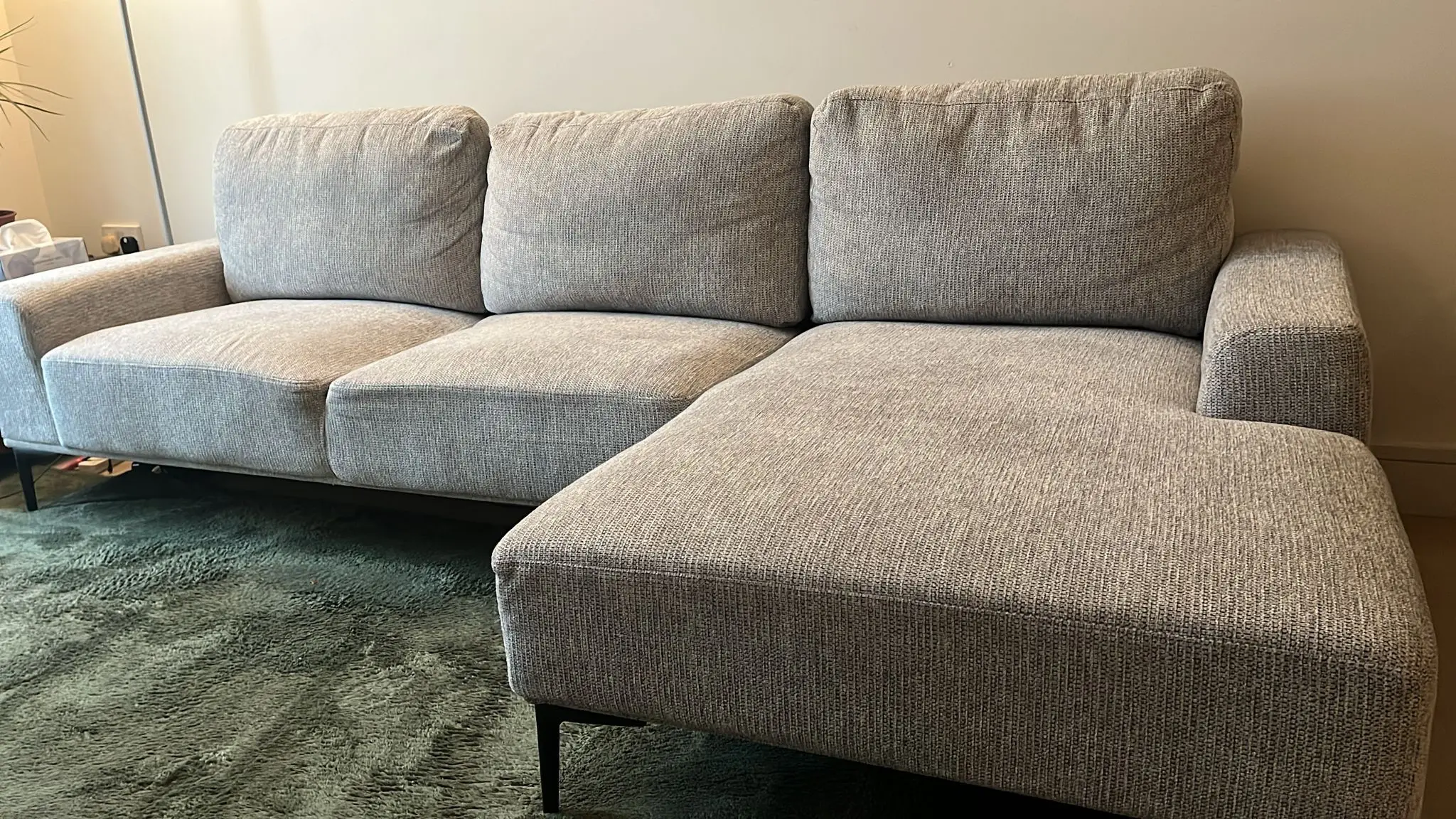 One year old Mediterranean style sofa with light grey and white specks. Beautiful texture with three spacious seats including an L.