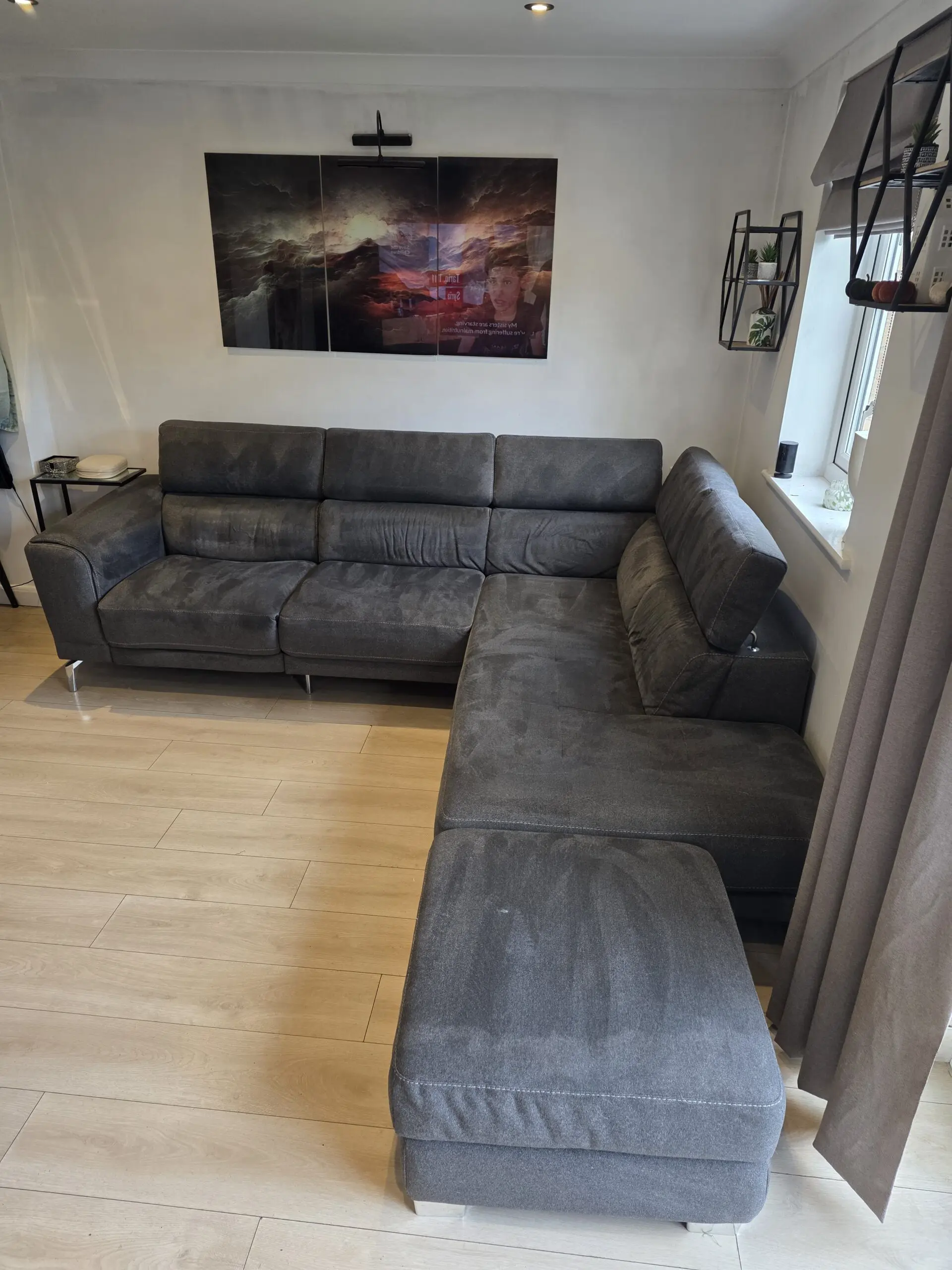 This L shape corner sofa with pouffe furniture in living room is a stylish and comfortable addition to any modern home. The sofa is upholstered in a grey textured fabric, featuring a solid/plain pattern and a contemporary/modern back style. Measuring 226cm in length, 73cm in height, and 284cm in width, this sofa from DFS under their Fabb Furniture product line is perfect for adults looking to relax and unwind in the living room. Additionally, the pouffe adds a touch of elegance to the overall design, making it a must-have for contemporary living spaces.