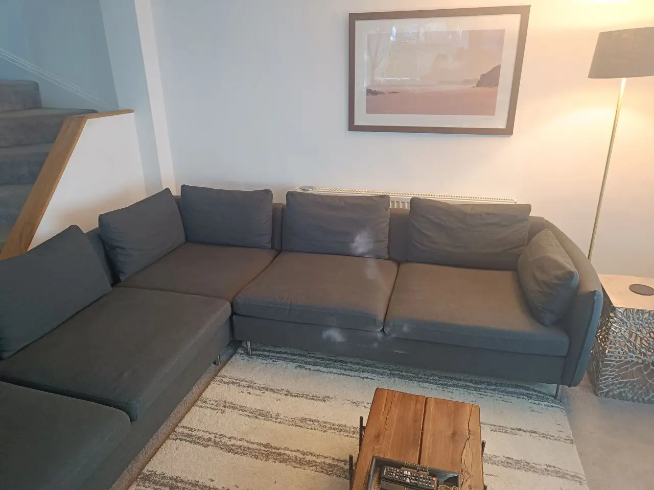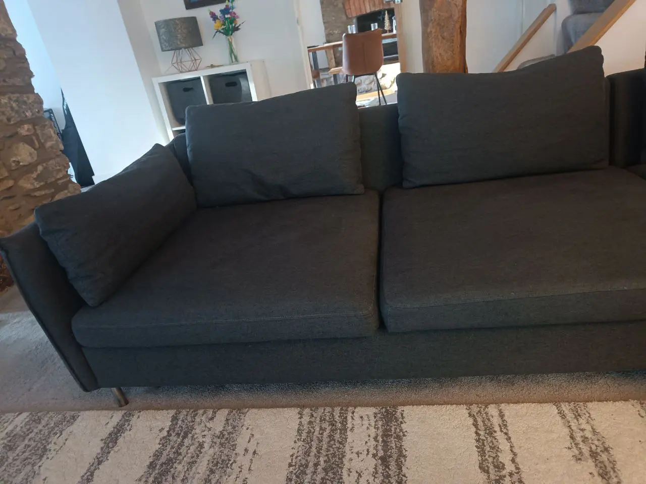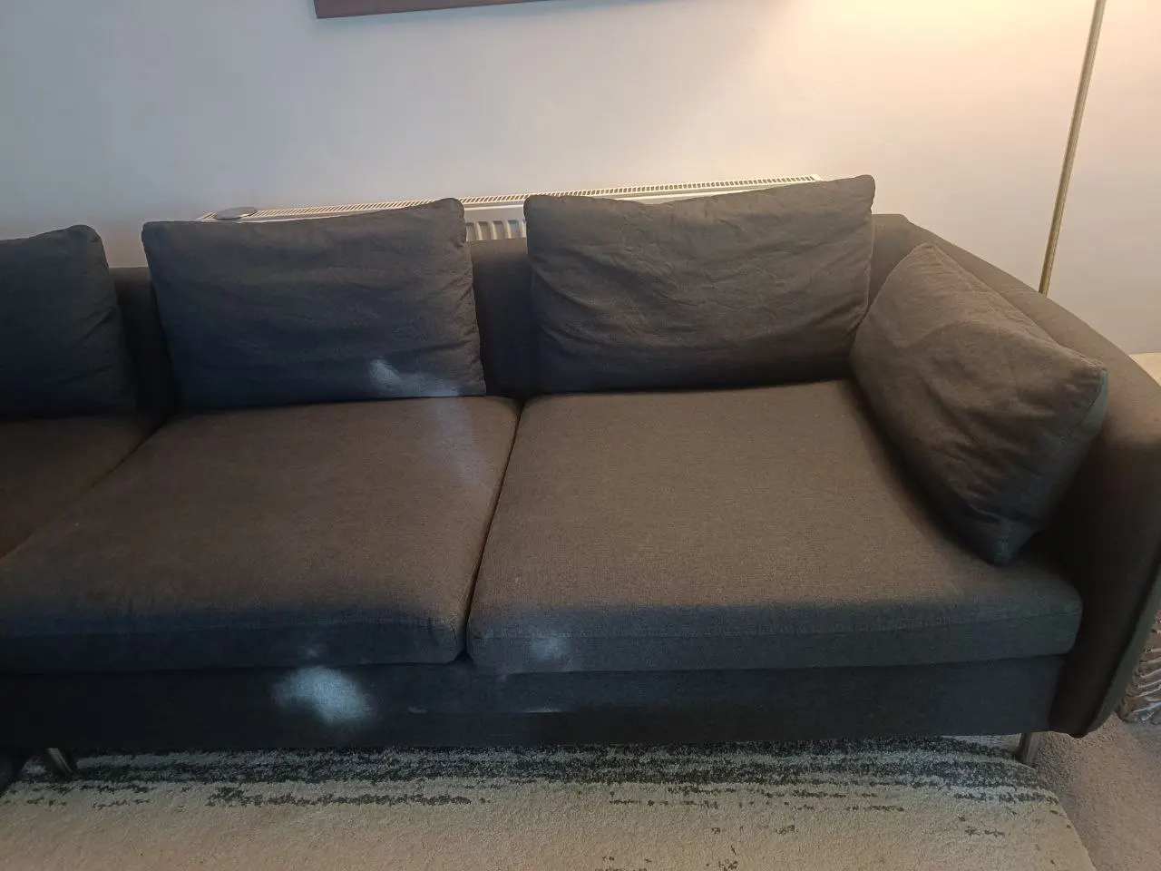 In excellent condition. no visible wear and tear. The fabric is of excellent quality, and the padding remains firm with minimal sagging. This sofa can seat up to 7 people, and is also lovely and deep.
