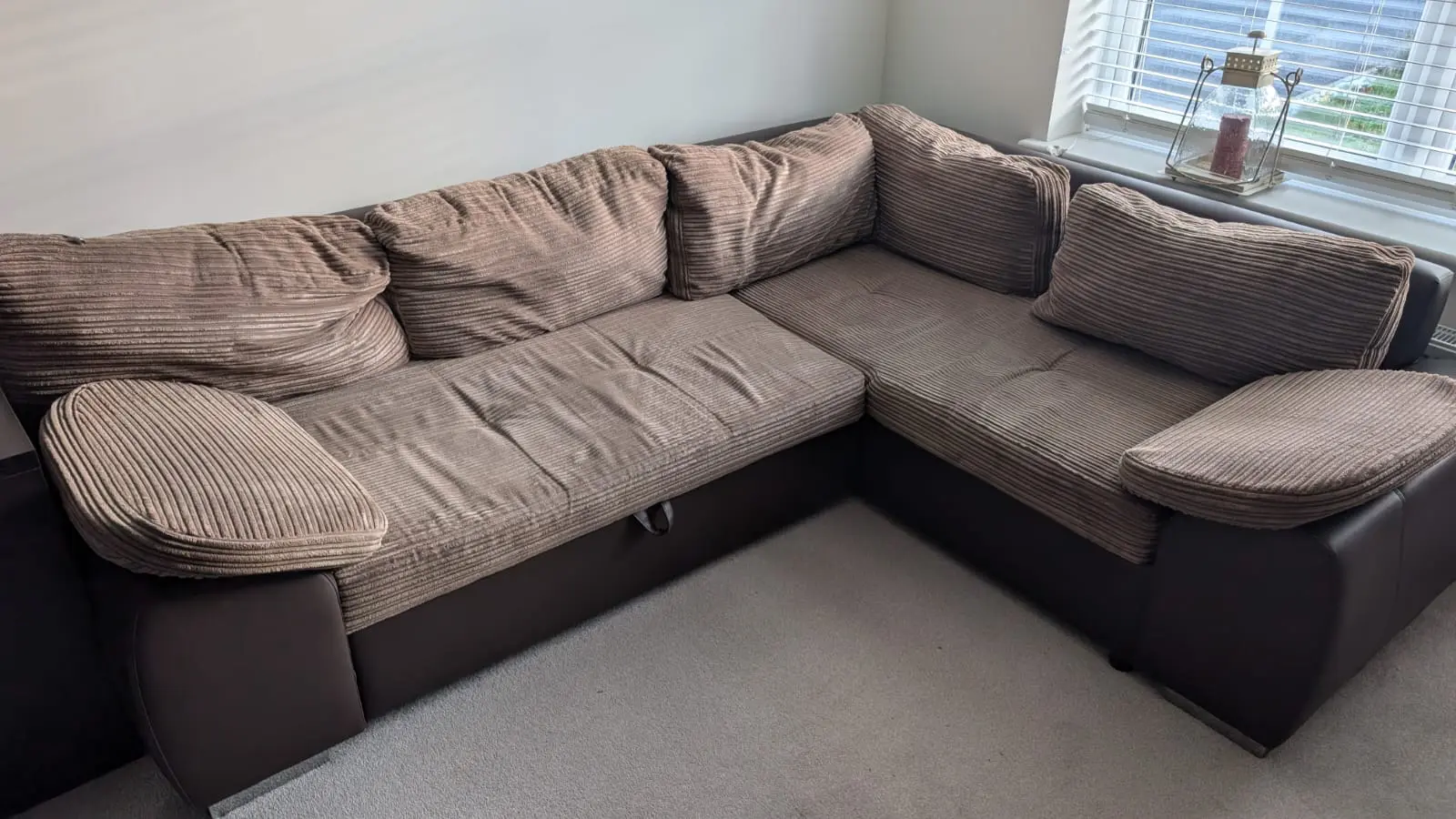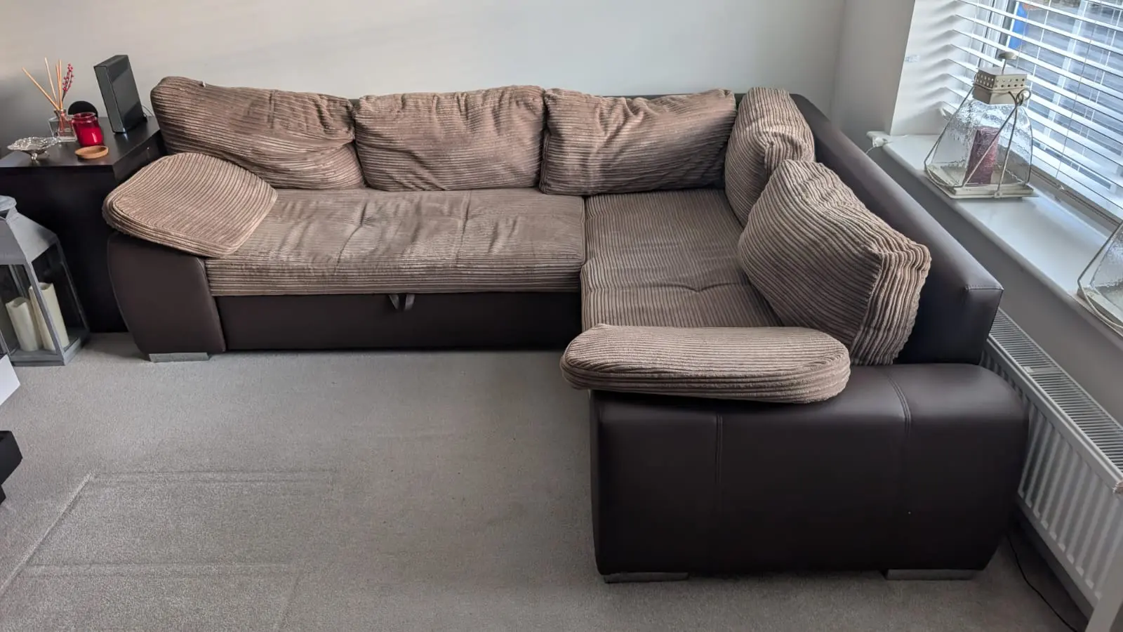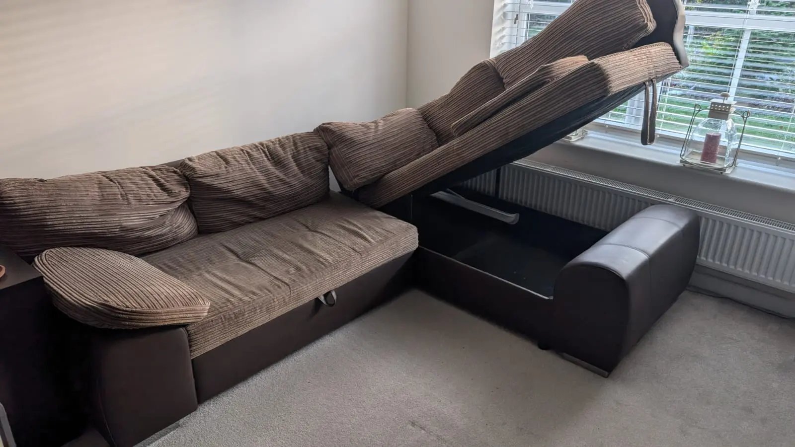 3 seater sofa bed with storage space. Good condition no pets no smoking. Cushions included. The sofa is leather chocolate brown colour with fabric finish on seating area and fabric cushions.