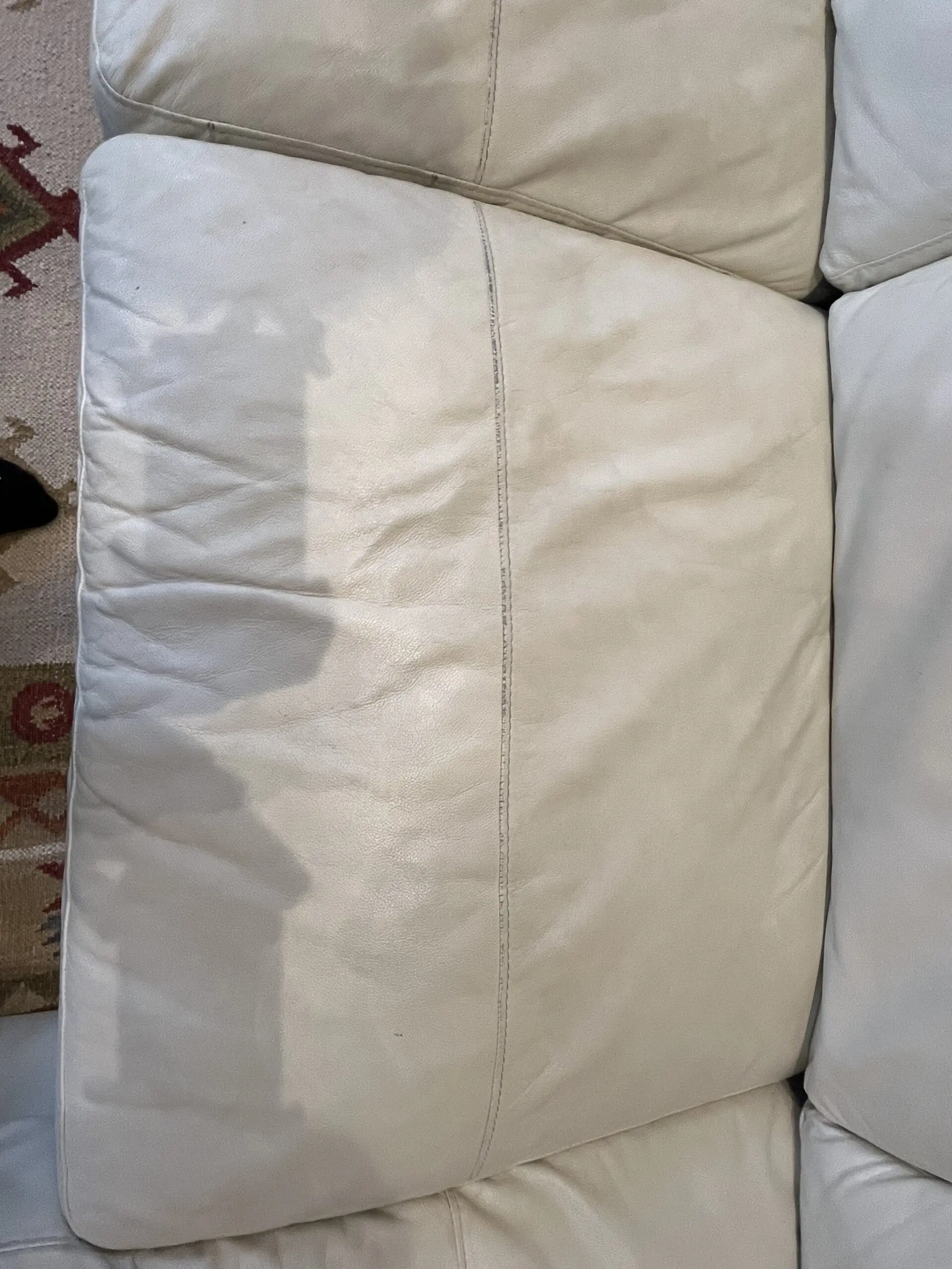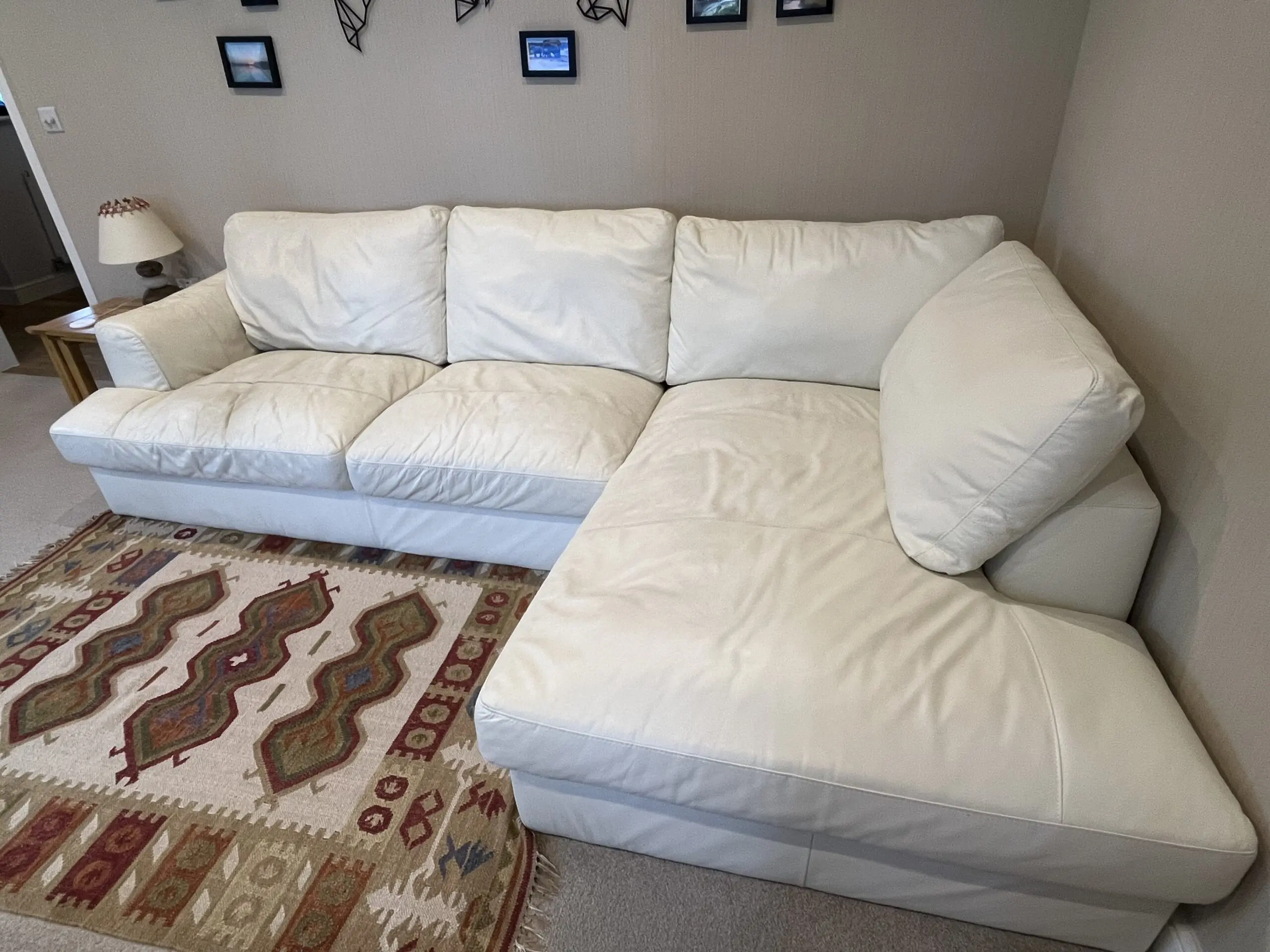 White leather corner sofa. Very comfortable, with space for 5 people sitting or two adults lying down. Very good condition except on one of the cushions (worn as shown in pictures)