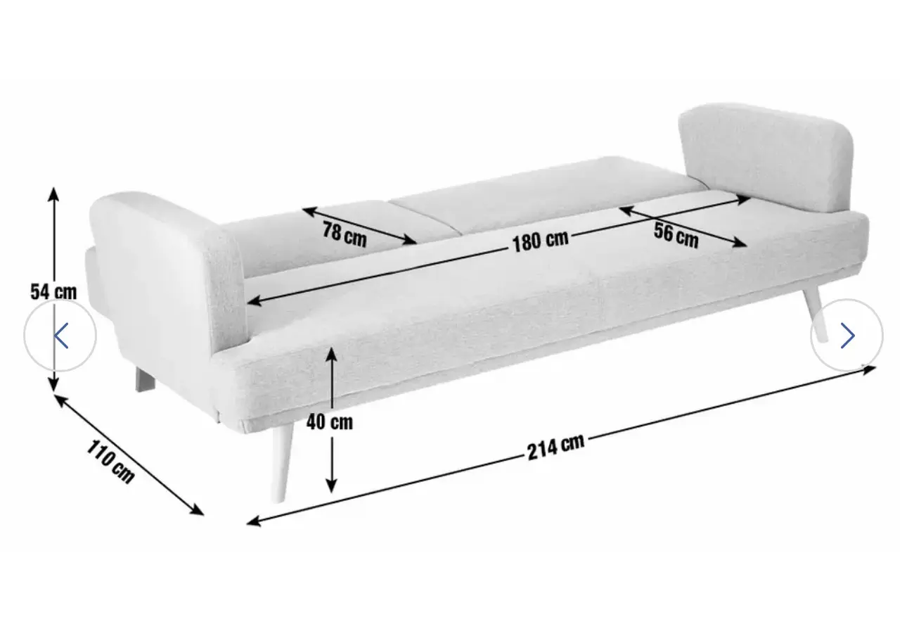 Sofa size H82, W214, D90cm (Depth as bed 110cm).