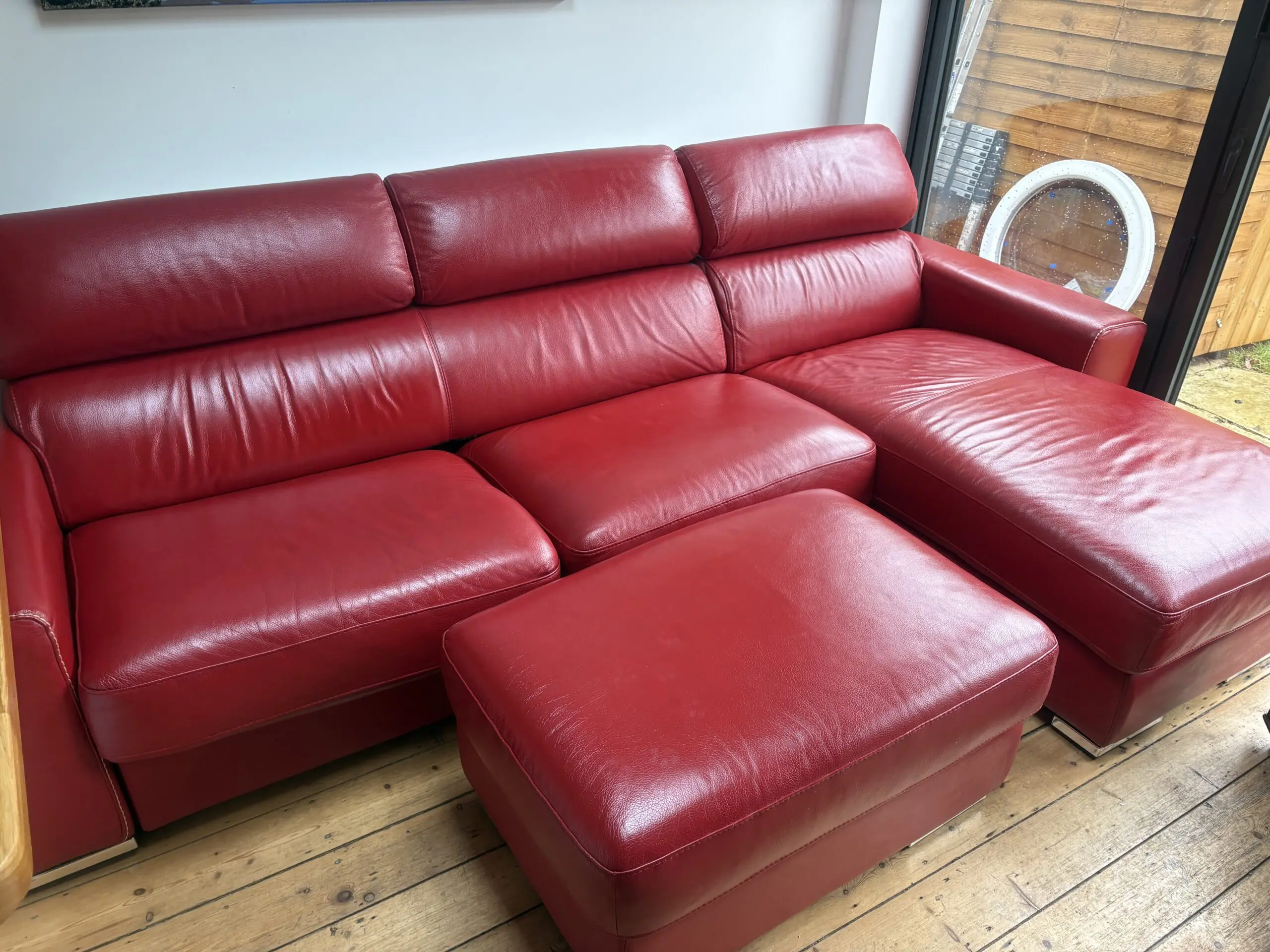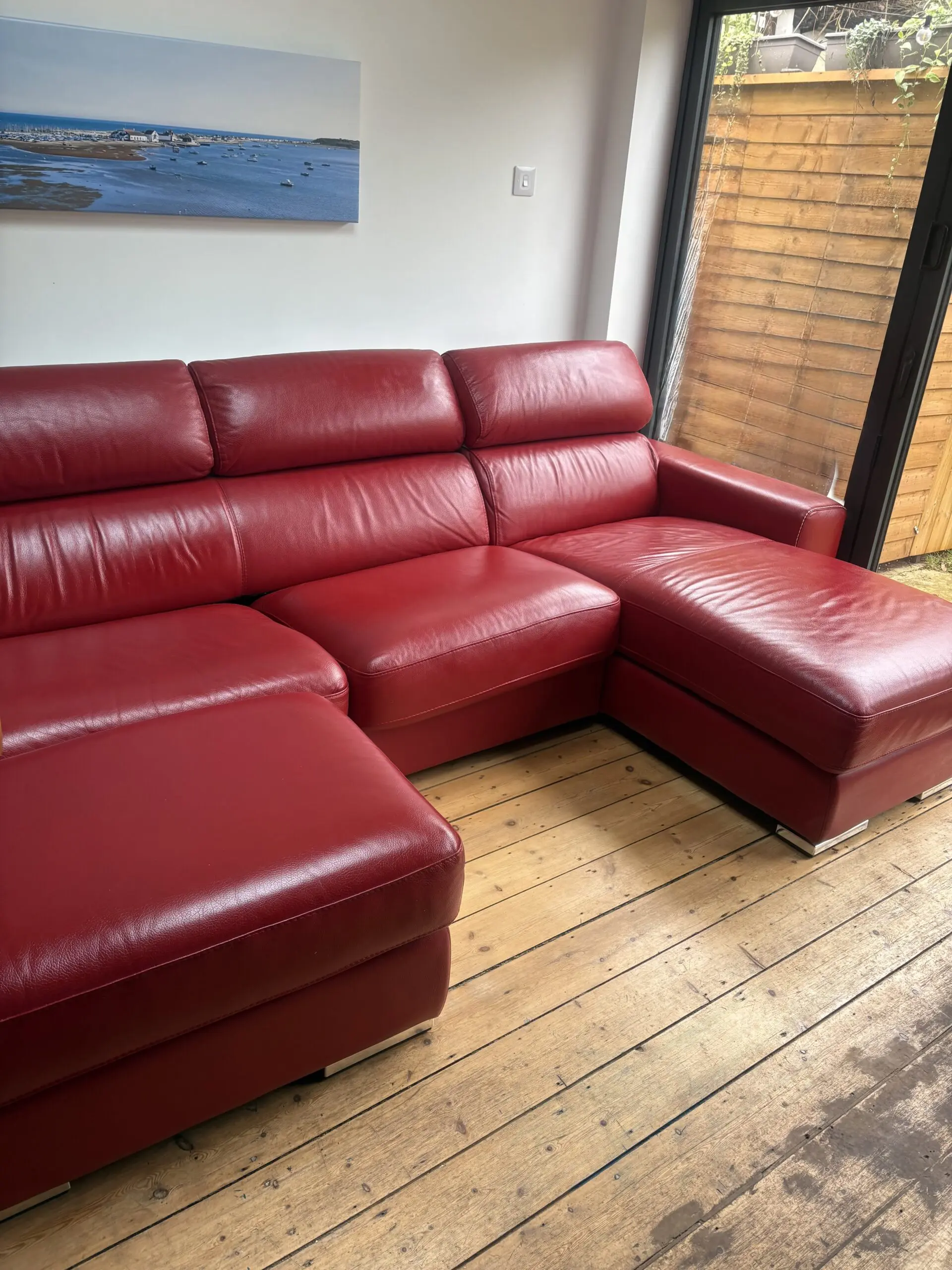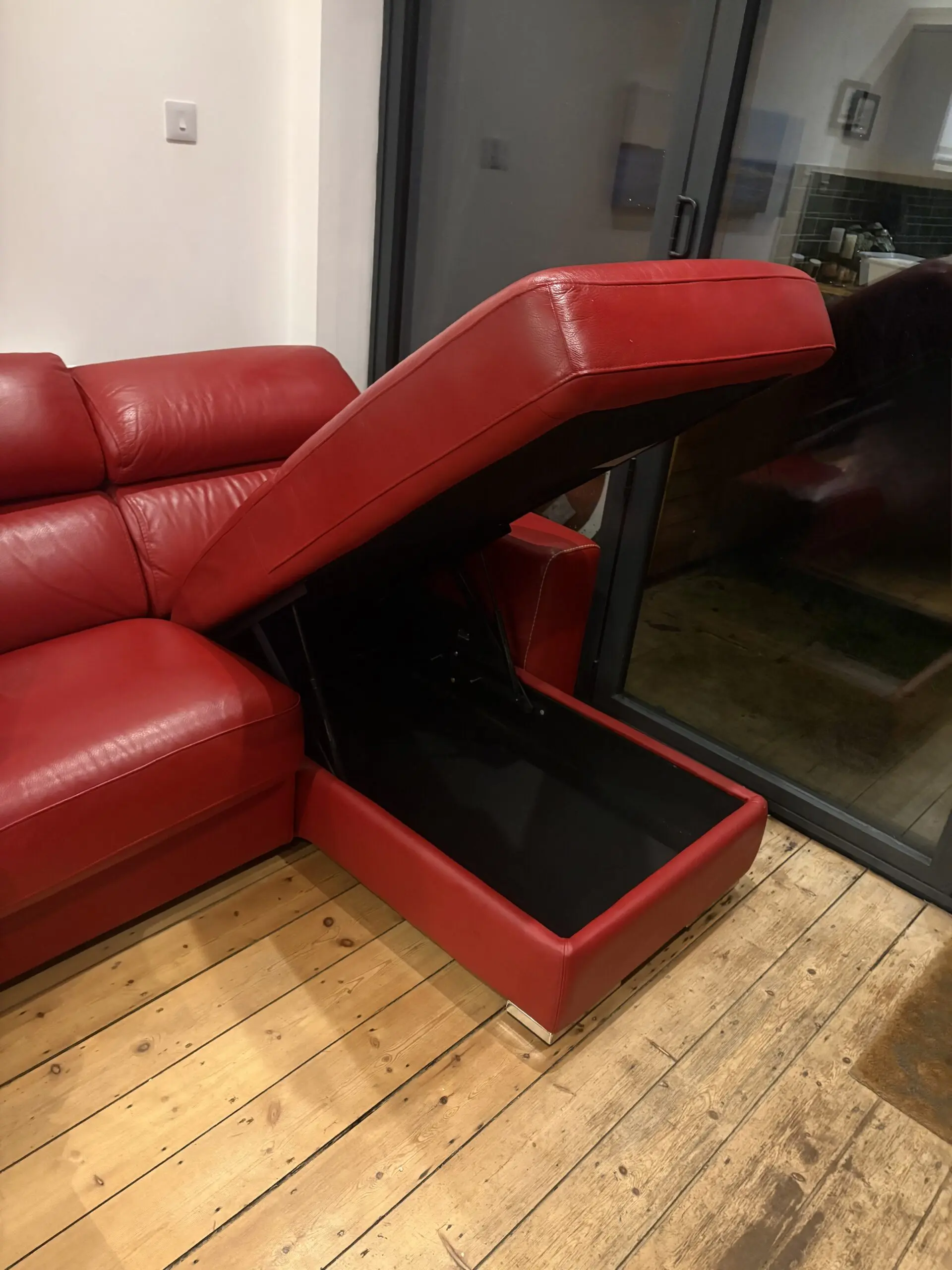 Paid £4,500 for this gorgeous eye stopping sofa with chaise which has storage. Head rests can be adjusted and is a really comfortable small double sofa bed too! Good condition and paid extra for thicker leather and which is so comfortable. Also have matching footstool which contains storage. Folds down into double sofa bed. Sofa bed genuinely was only used twice but not since so virtually brand new.