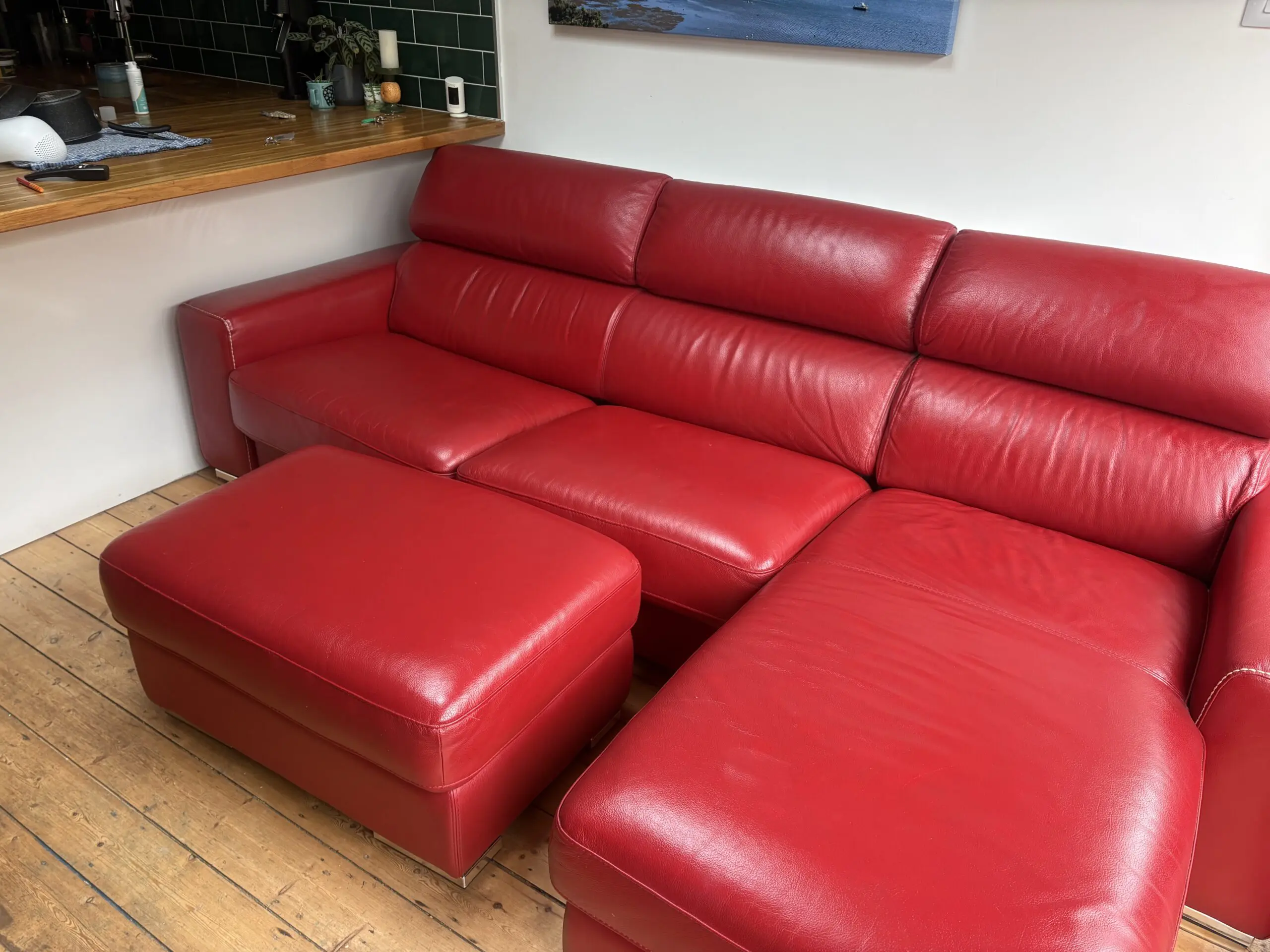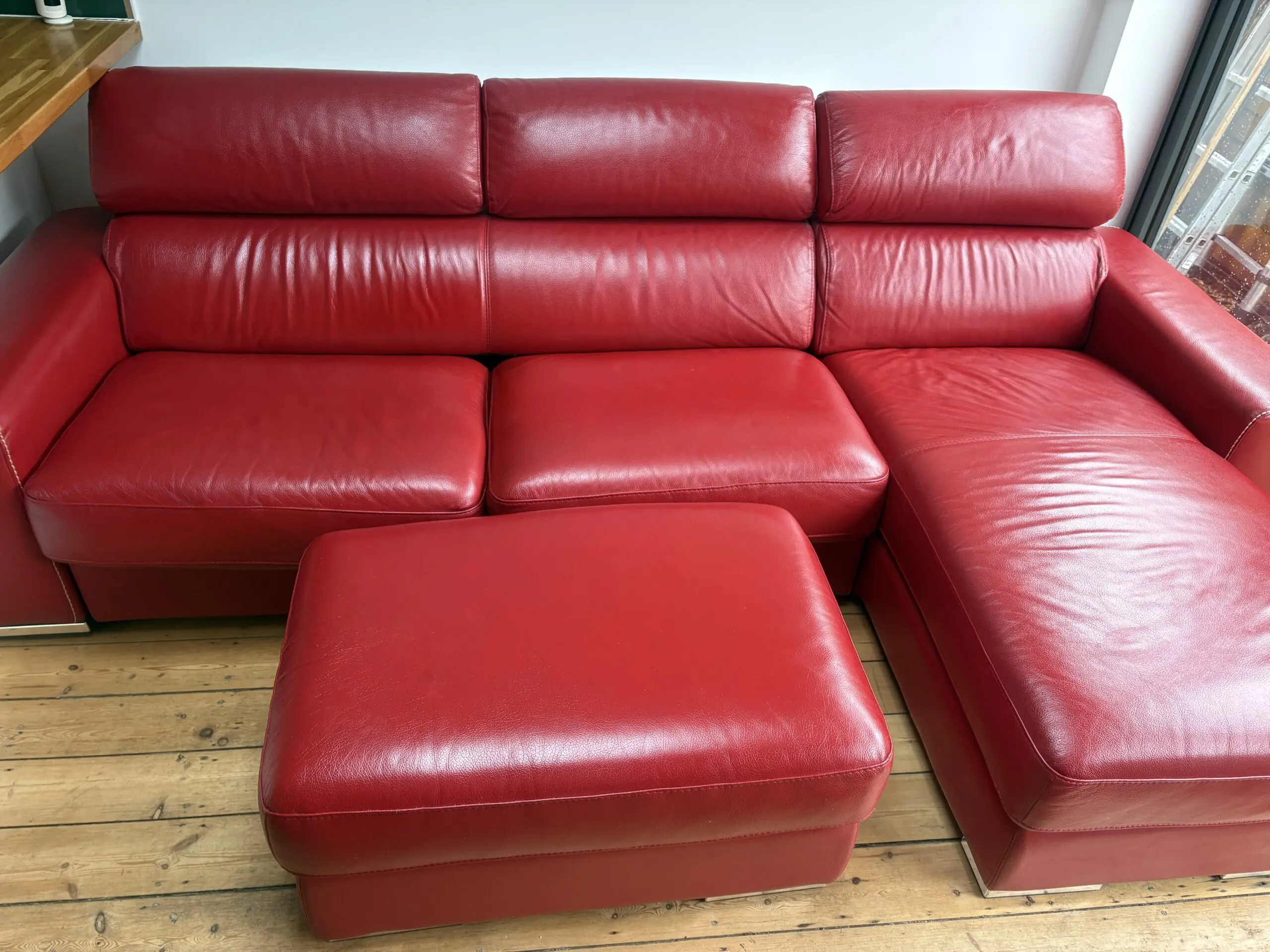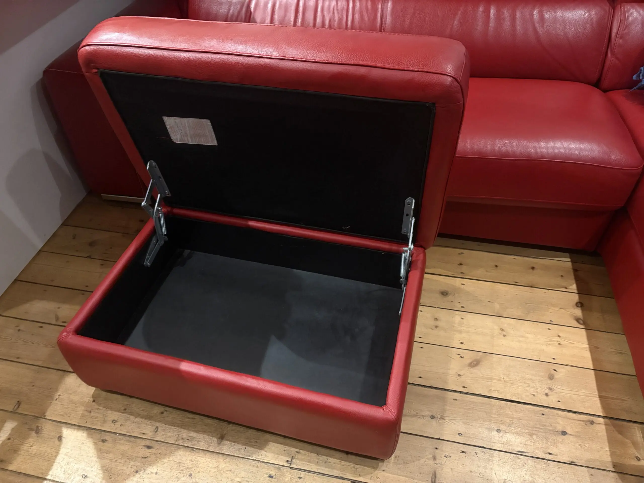 Paid £4,500 for this gorgeous eye stopping sofa with chaise which has storage. Head rests can be adjusted and is a really comfortable small double sofa bed too! Good condition and paid extra for thicker leather and which is so comfortable. Also have matching footstool which contains storage. Folds down into double sofa bed. Sofa bed genuinely was only used twice but not since so virtually brand new.