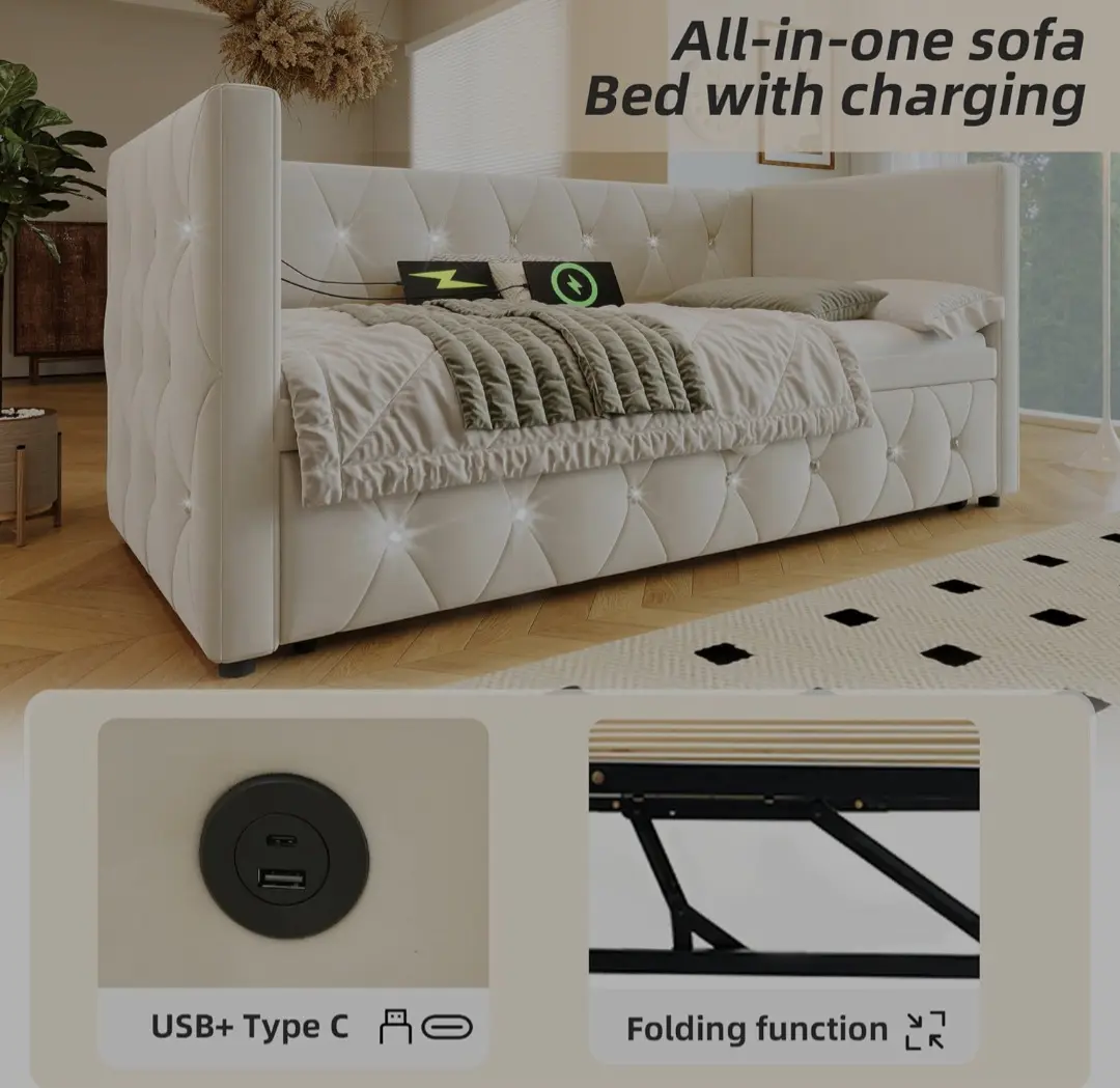 Upholstered Bed 90x190cm, Daybed sofa bed with USB and type c charging stations, 3ft single bed with trundle, pull out trundle for living room and bedroom velvet beige