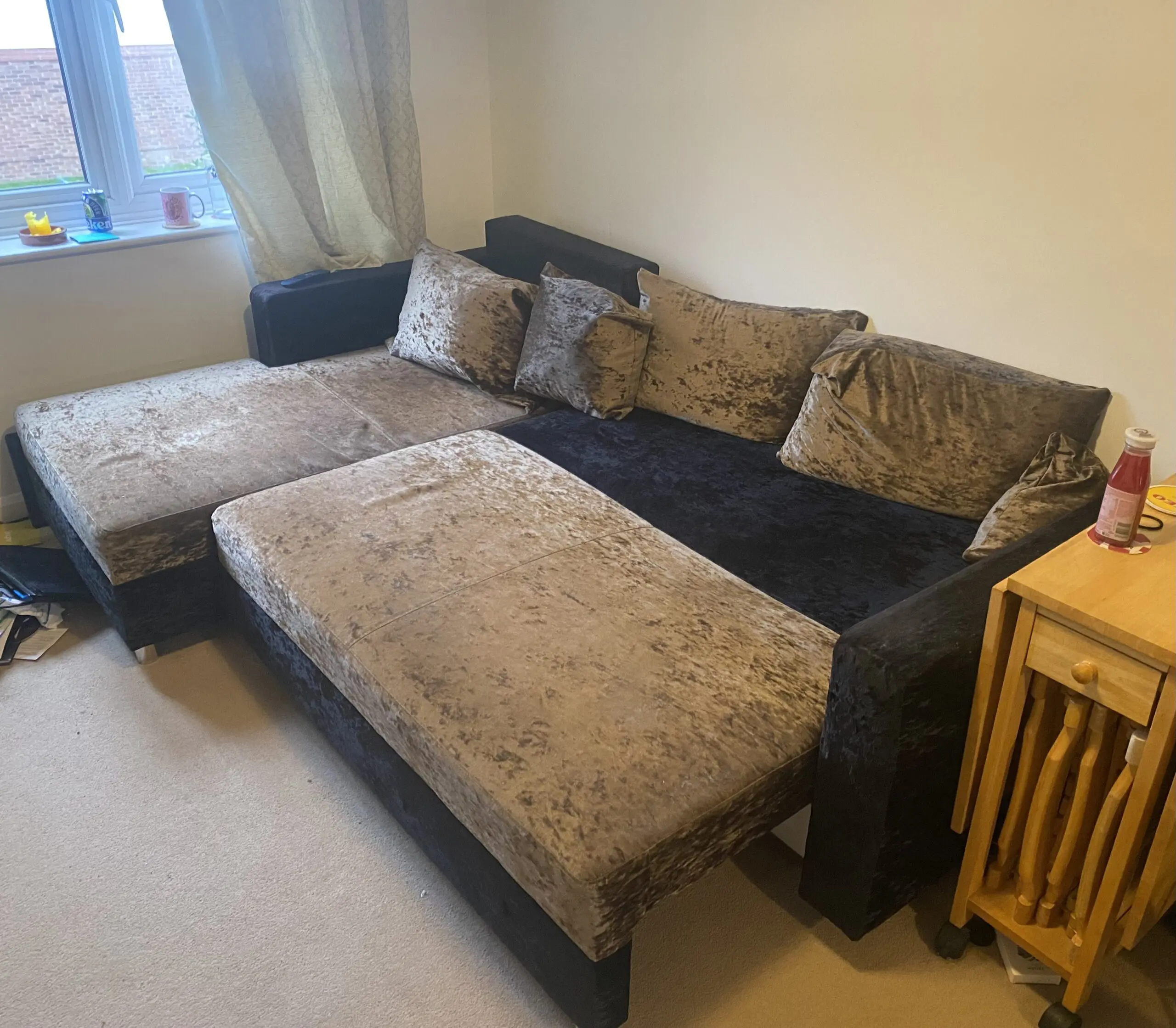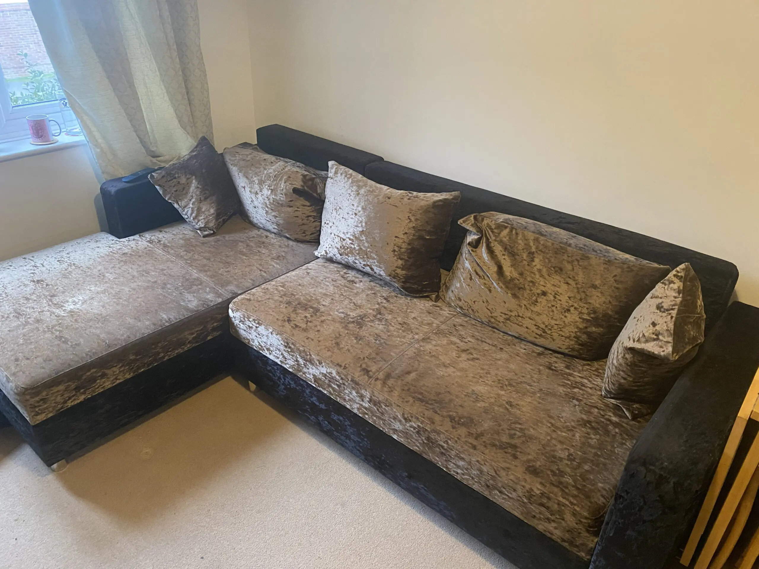This is a bespoke, brown and black 3 seater corner style sofa with built in sofa bed and storage space under. Comes with 3 large sofa pillows and 2 small ones all in light brown.