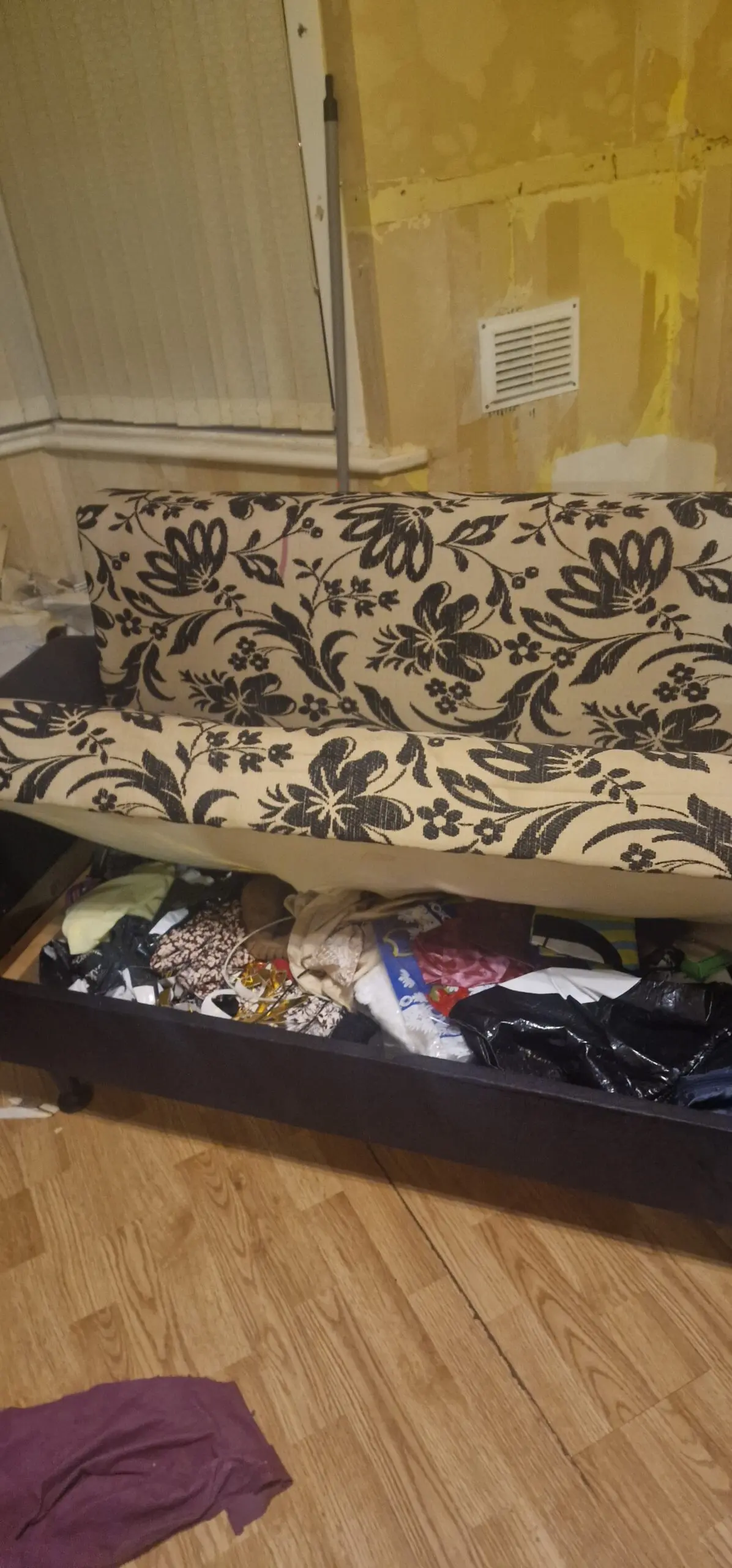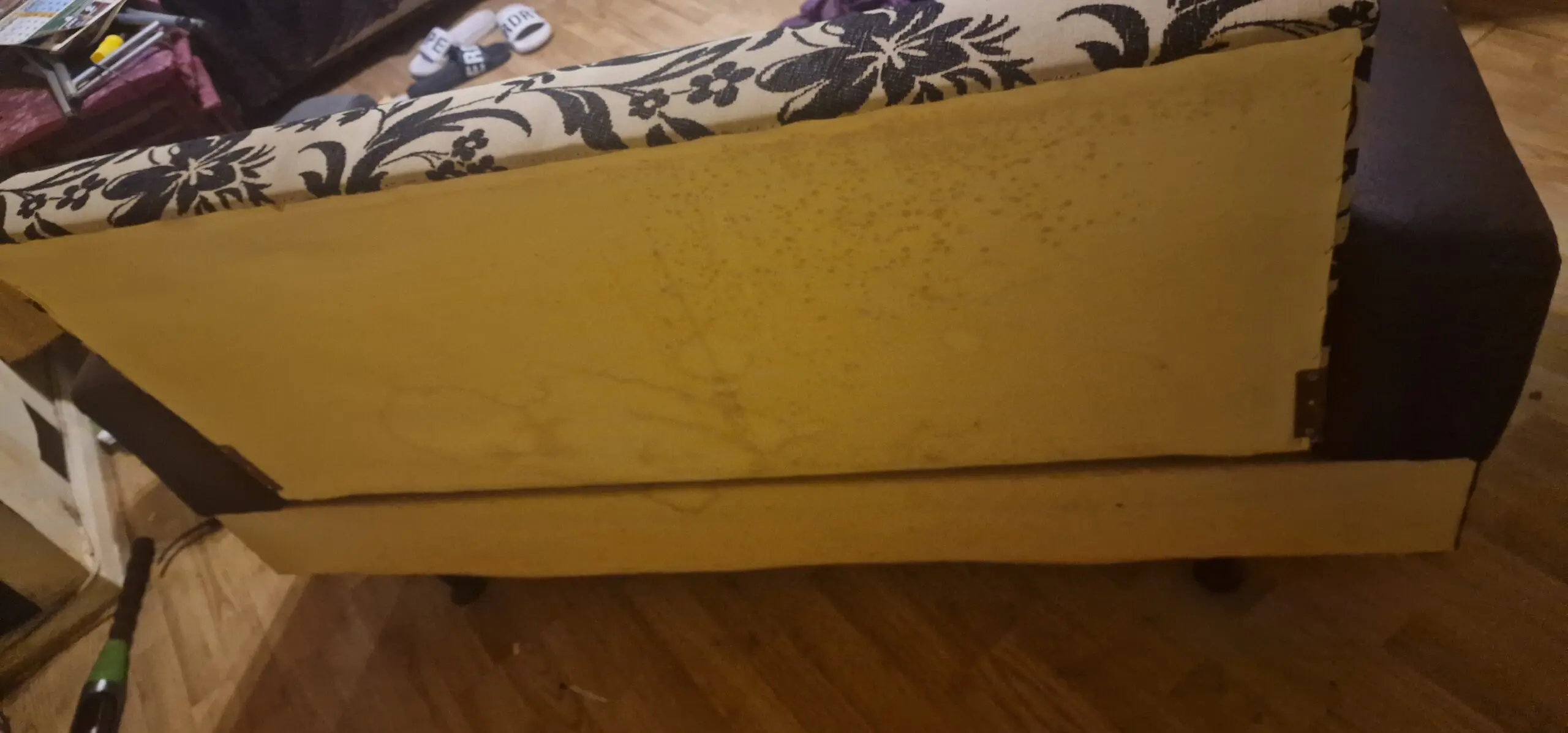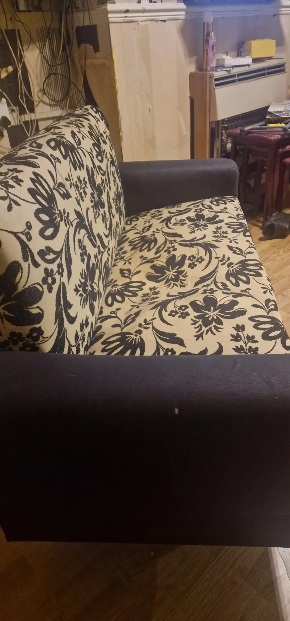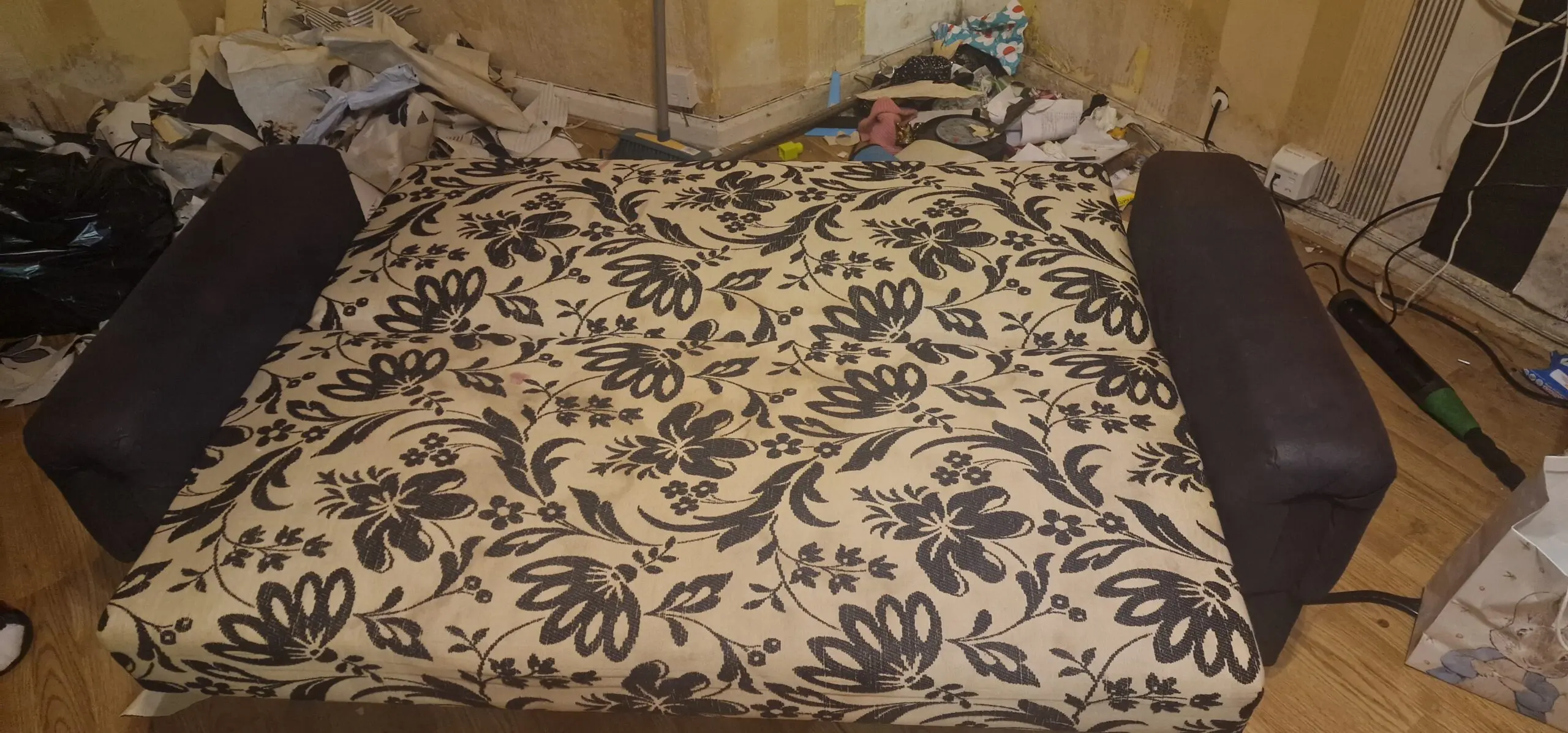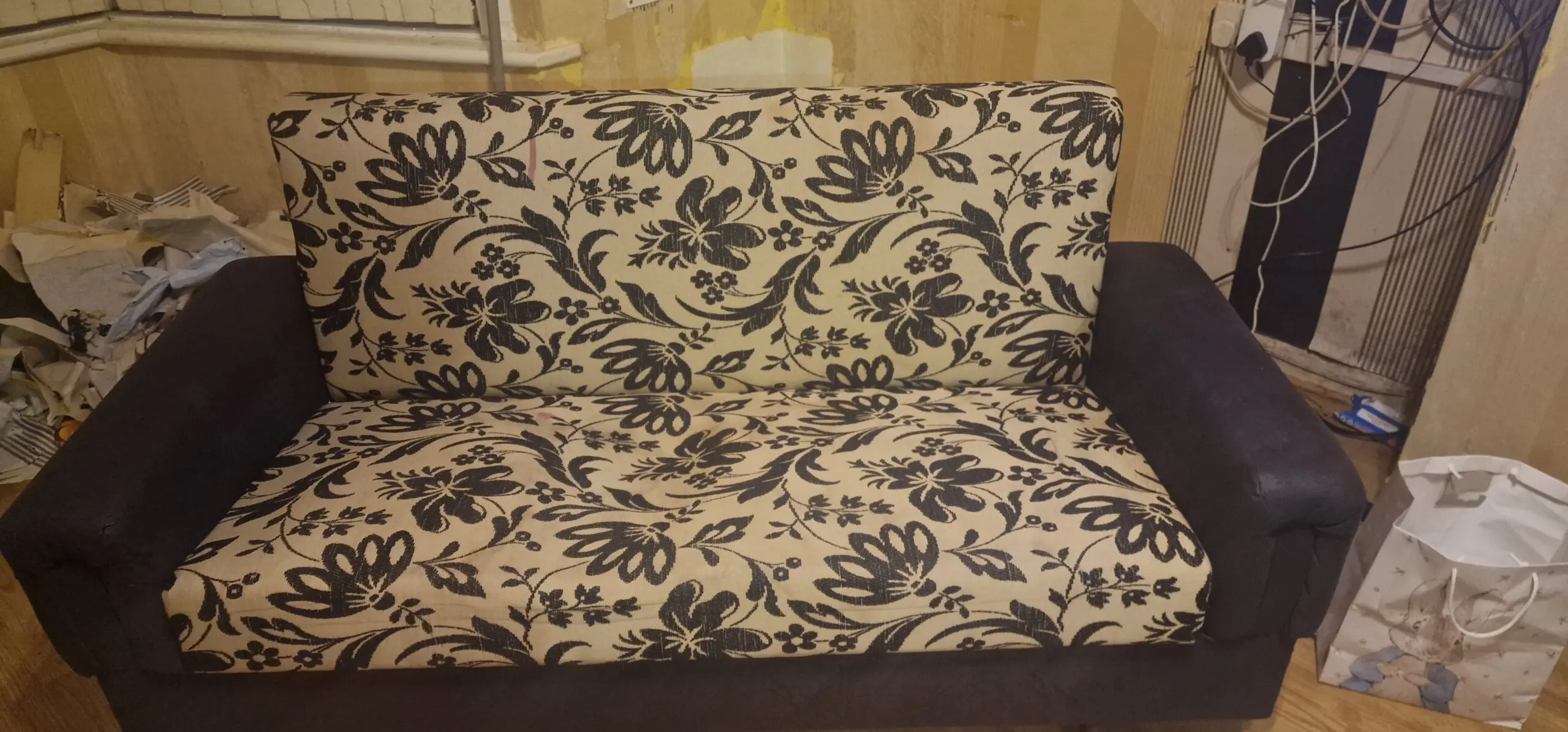 Black and cream colour sofa that open up to turn into a bed. Quite small and light