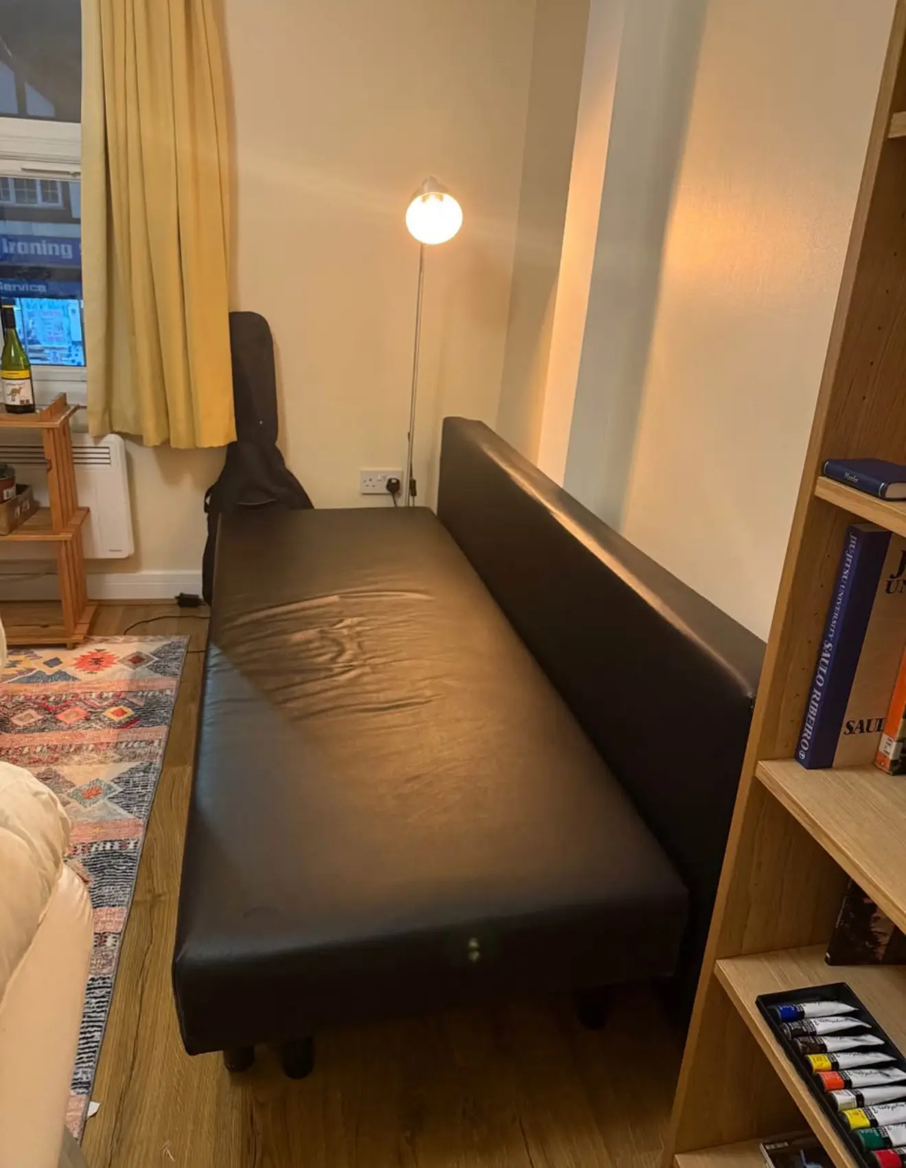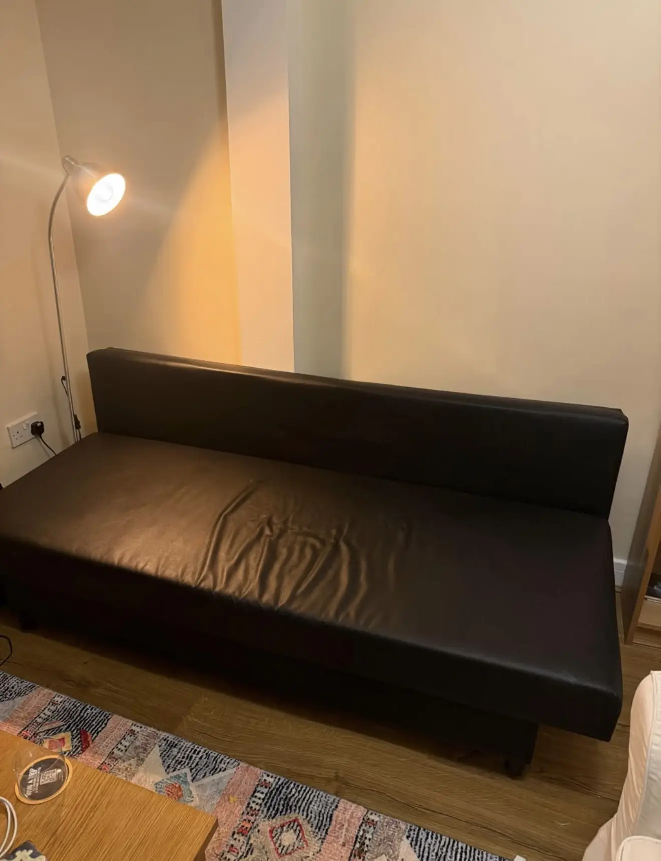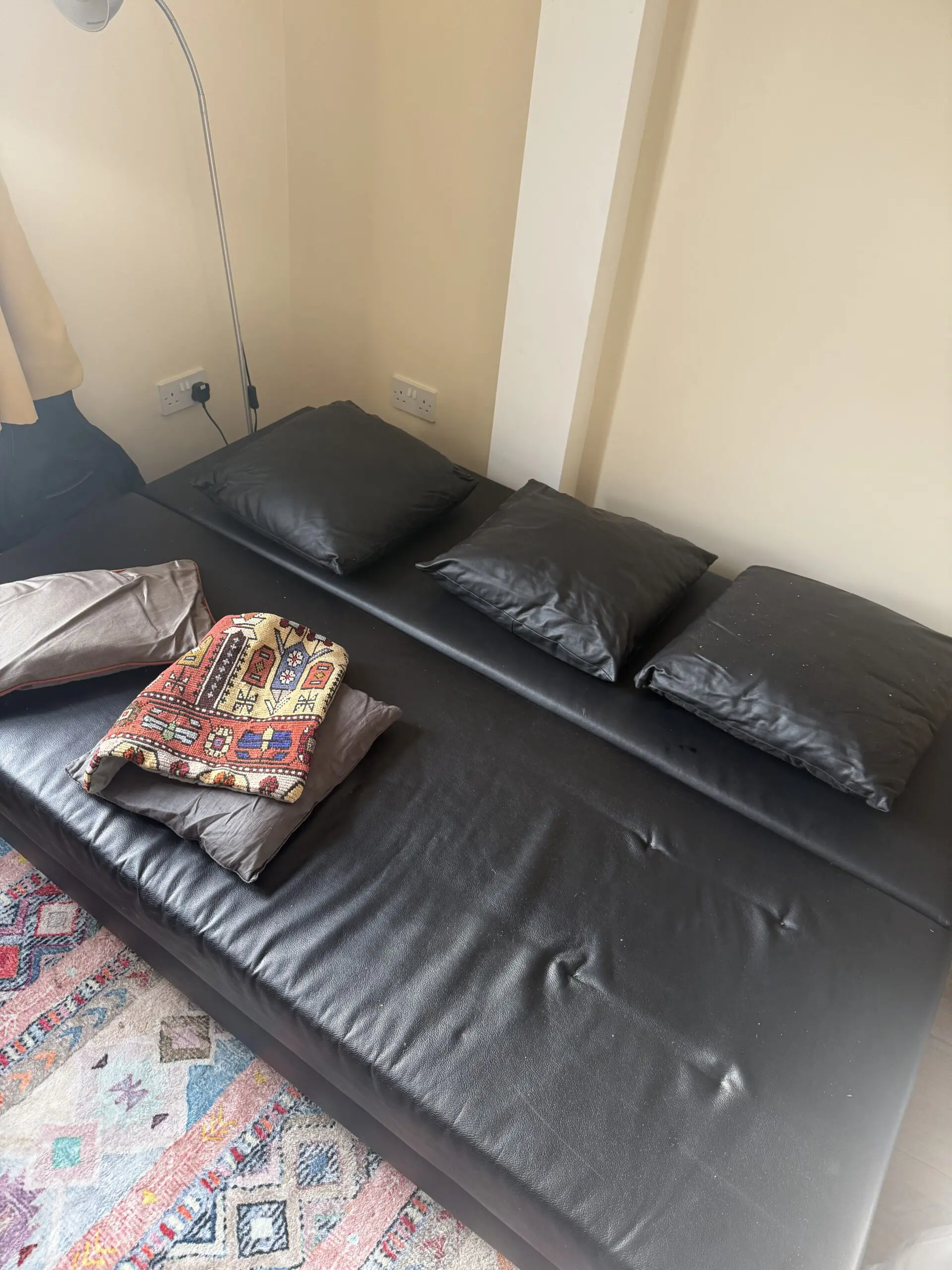 Black leather material sofa bed available- great condition. Comes with the 3 black pillows pictured.