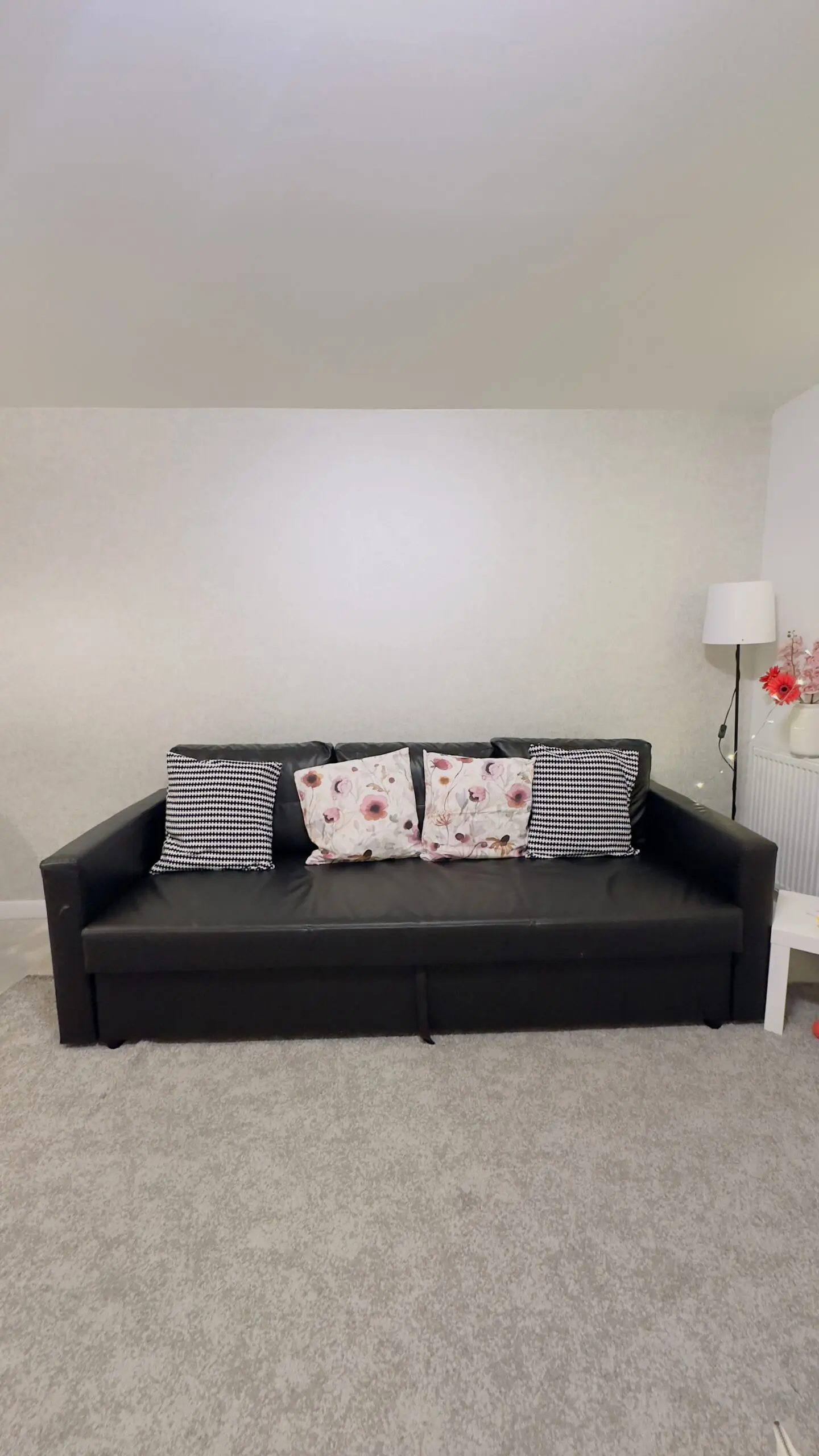 2 year old sofa, used as new. Very comfortable and spacious. Black leather material, easy to clean.