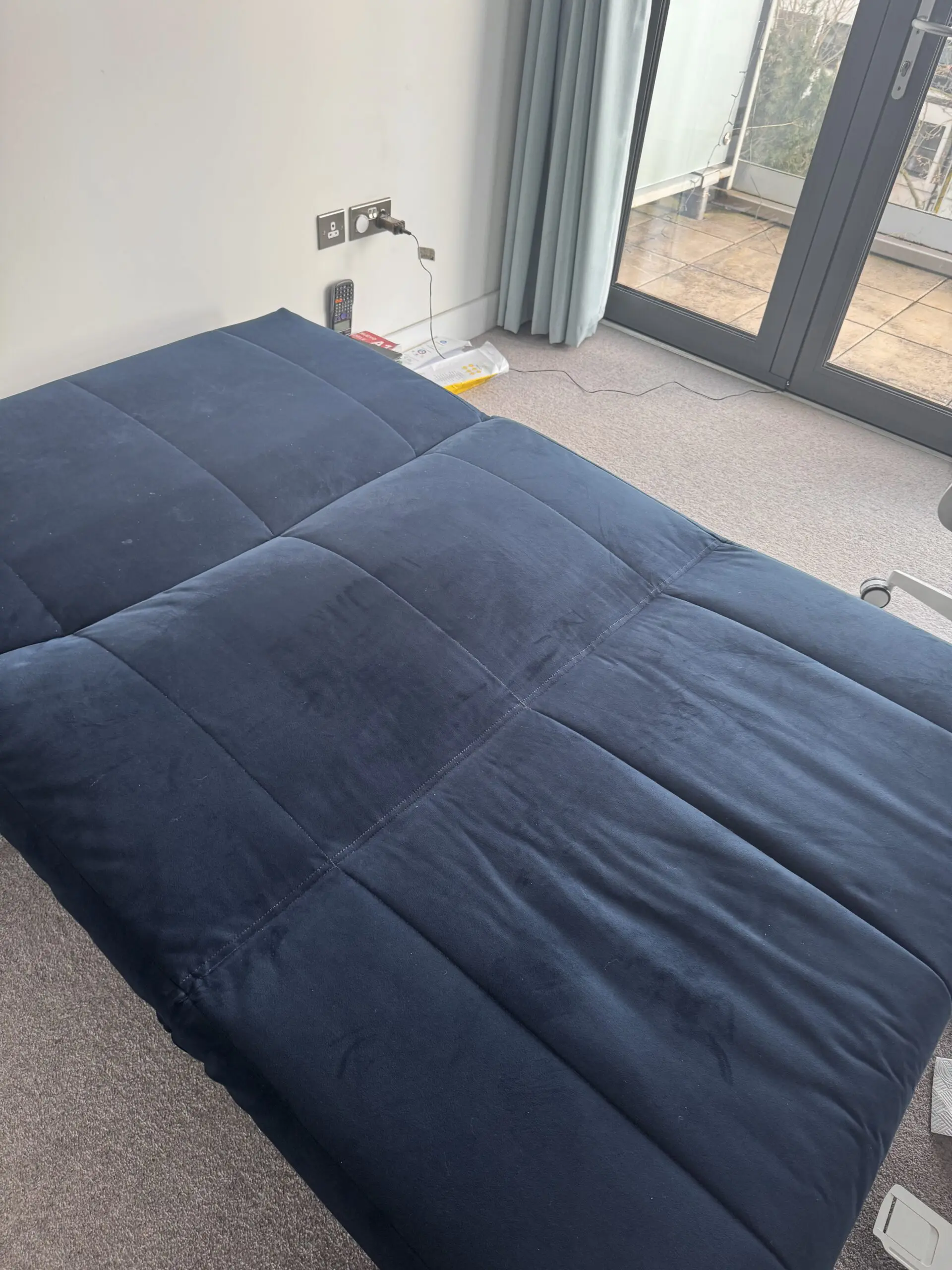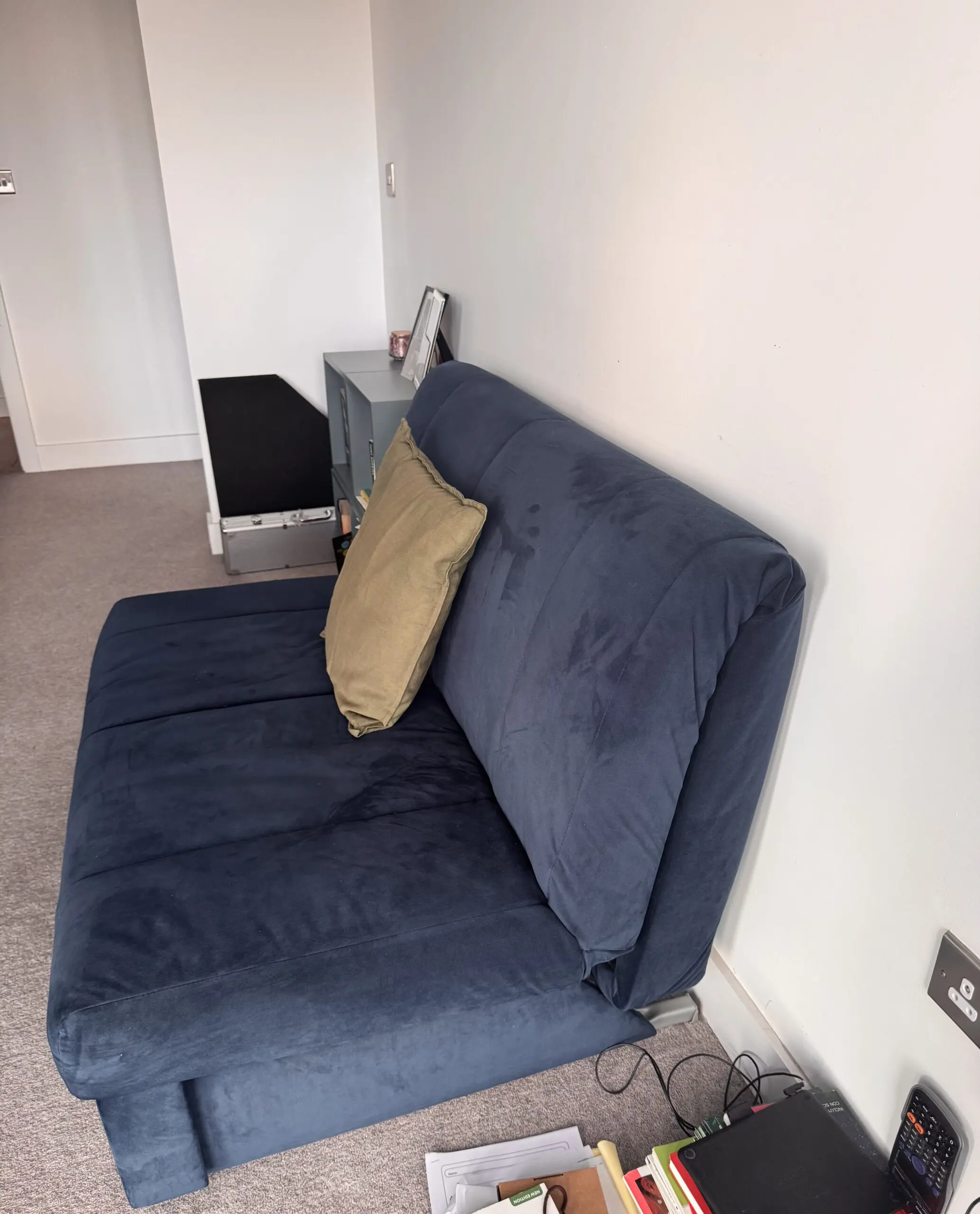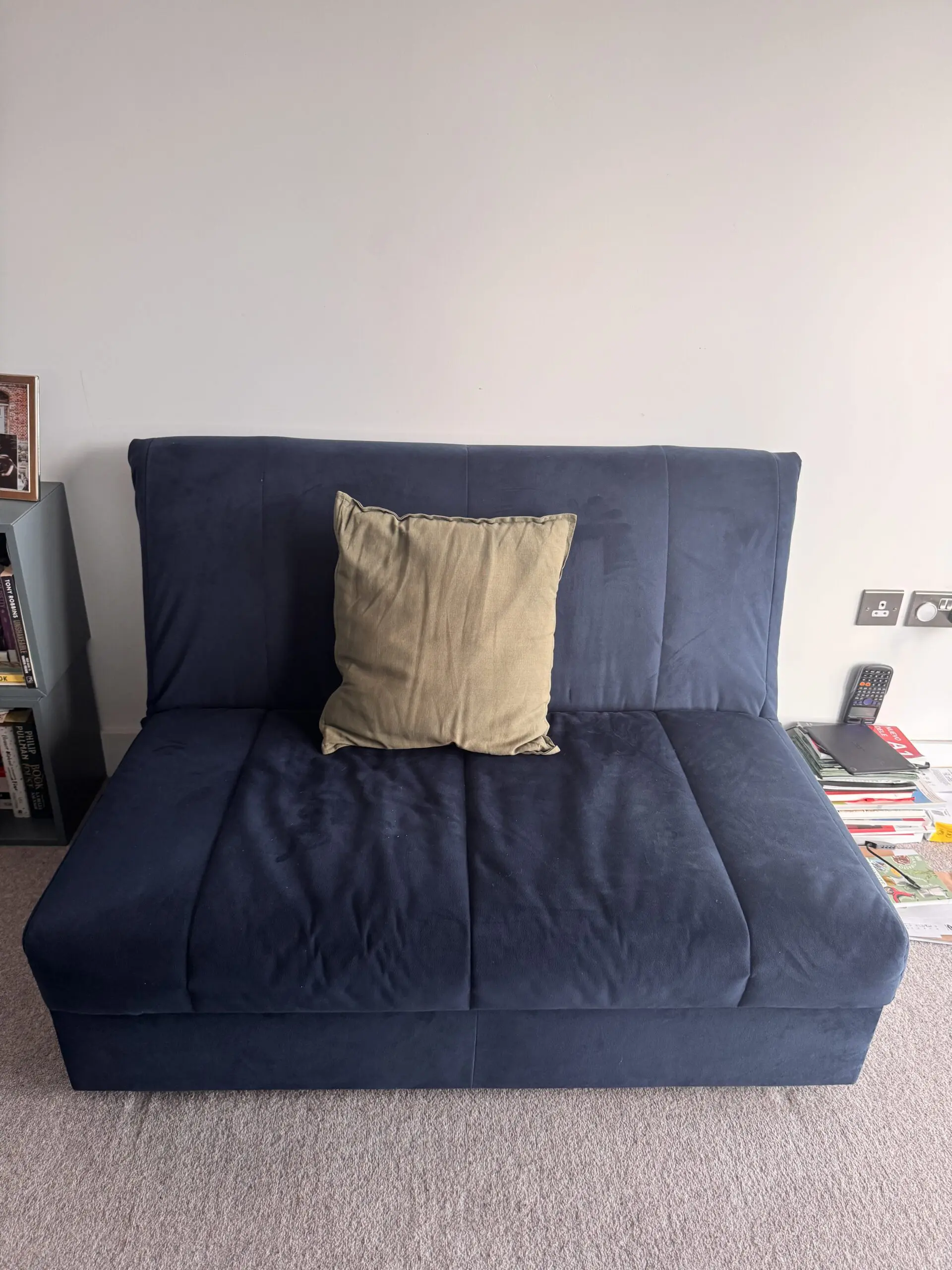 Selling our 2 seater sofa bed (blue velvet which will be cleaned before shipping). We’ve had very good feedback from people who have slept on the sofa bed.
