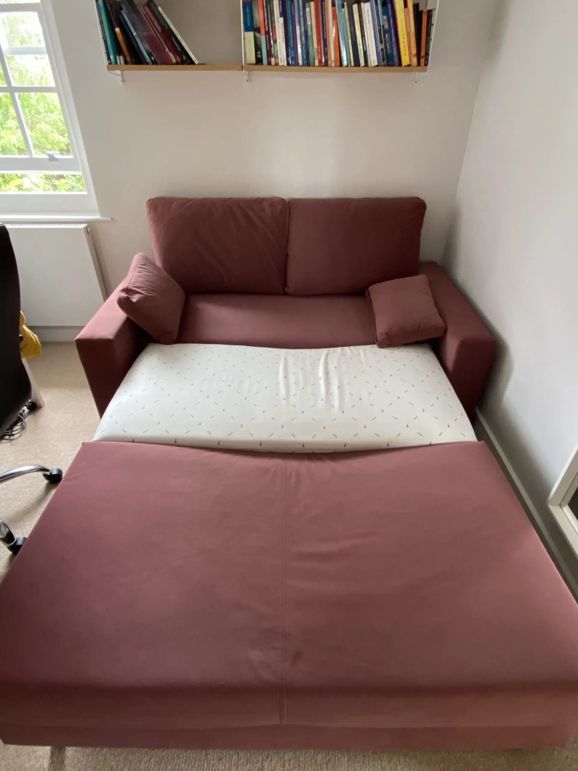 We sadly need to replace it with a toddler bed, otherwise would be keeping it as it’s very comfortable and functional. It’s in immaculate condition – looks brand new – except for one part of the frame that is damaged and causing a slight dip towards the end of the bed. Please see photos and/or get in touch if you have any further questions.