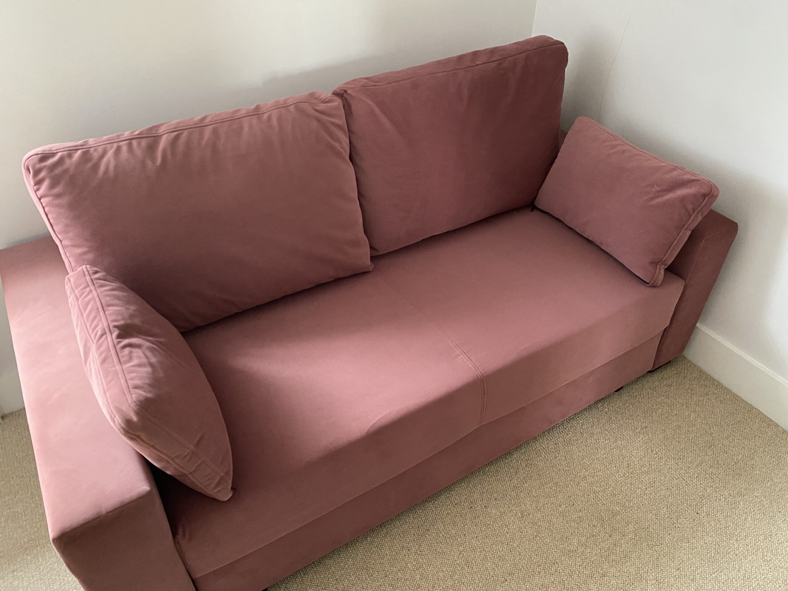 Cocoon’s Charlotte three-seater sofa bed has a 140 cm width pocket sprung mattress, with 15 cm wide arms, and a fold-down back where cushions can be stored while in sleep mode.