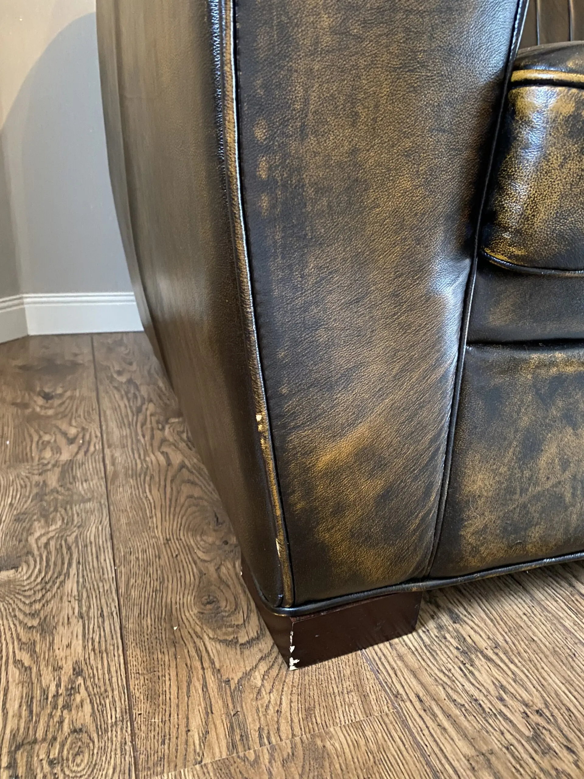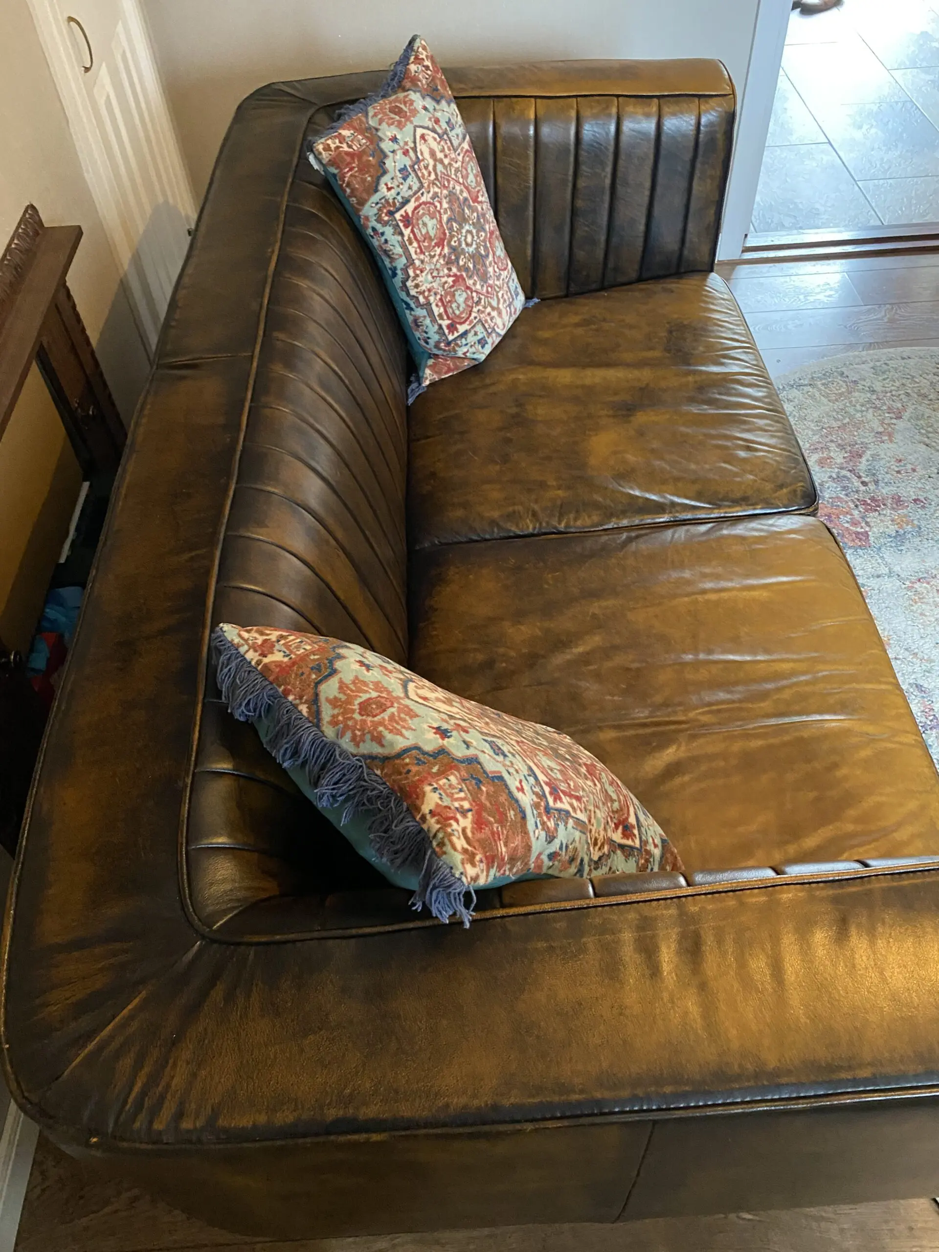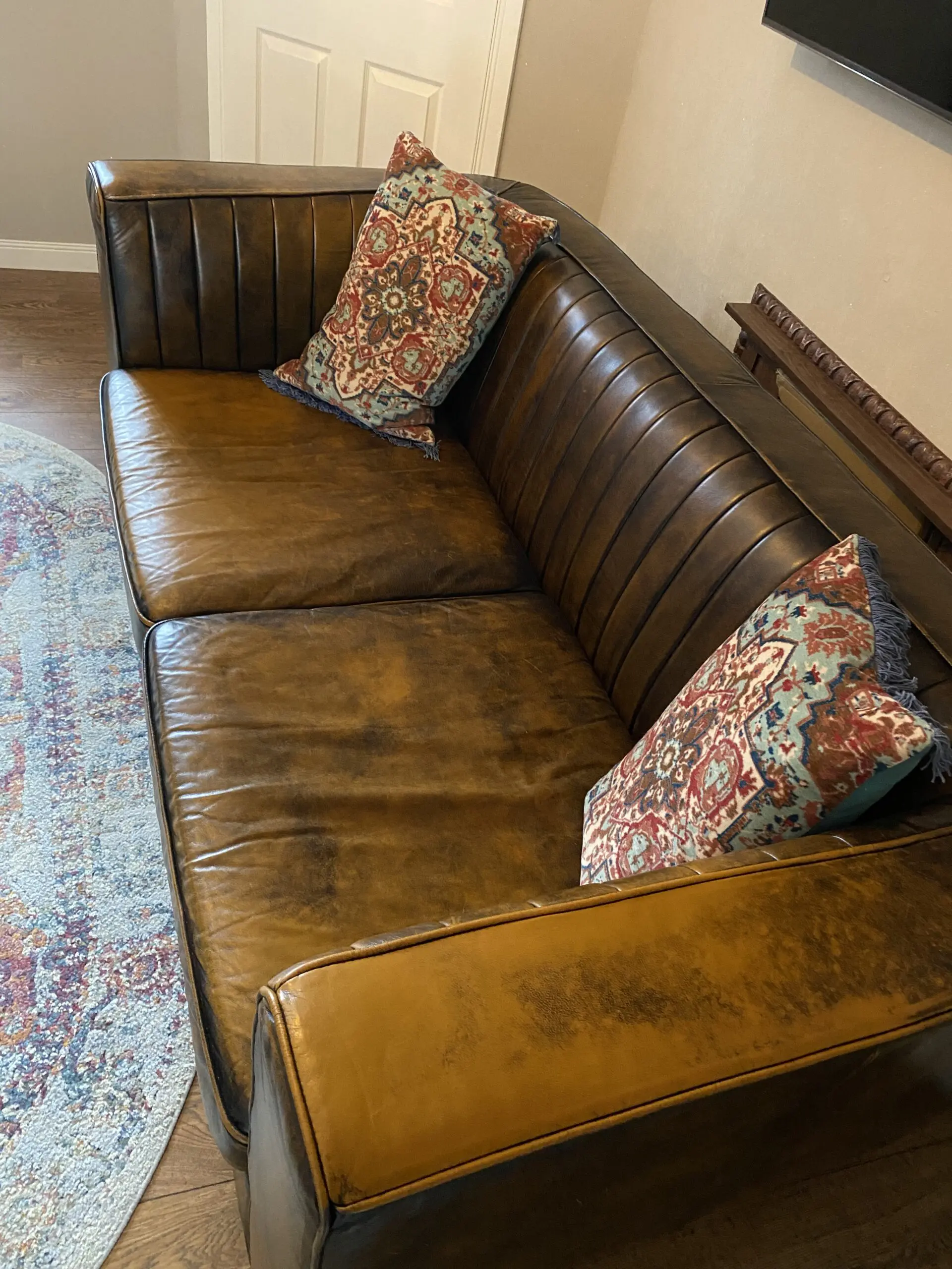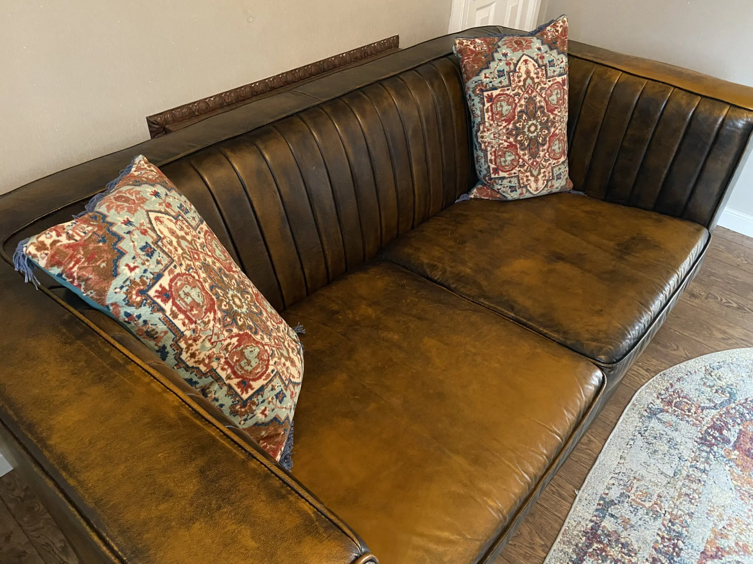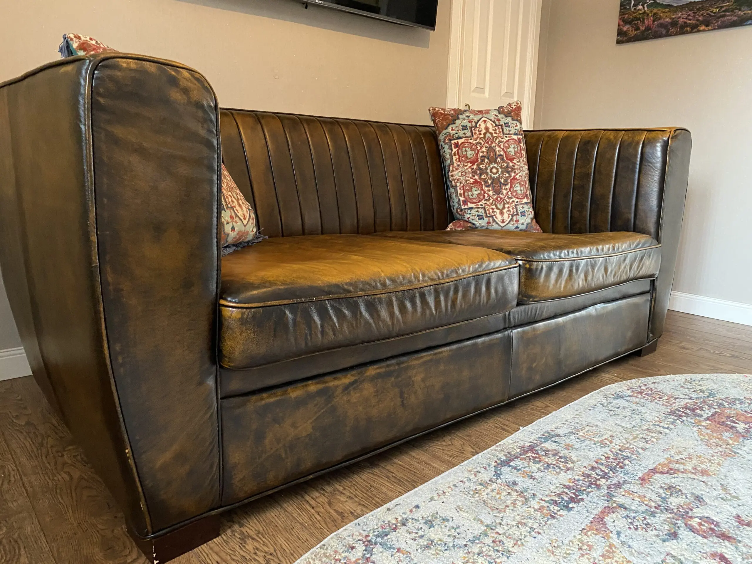 Upholstered in full genuine leather in a hand-finished vintage tan tone, this high-end piece combines classic Art Deco elegance with modern comfort.