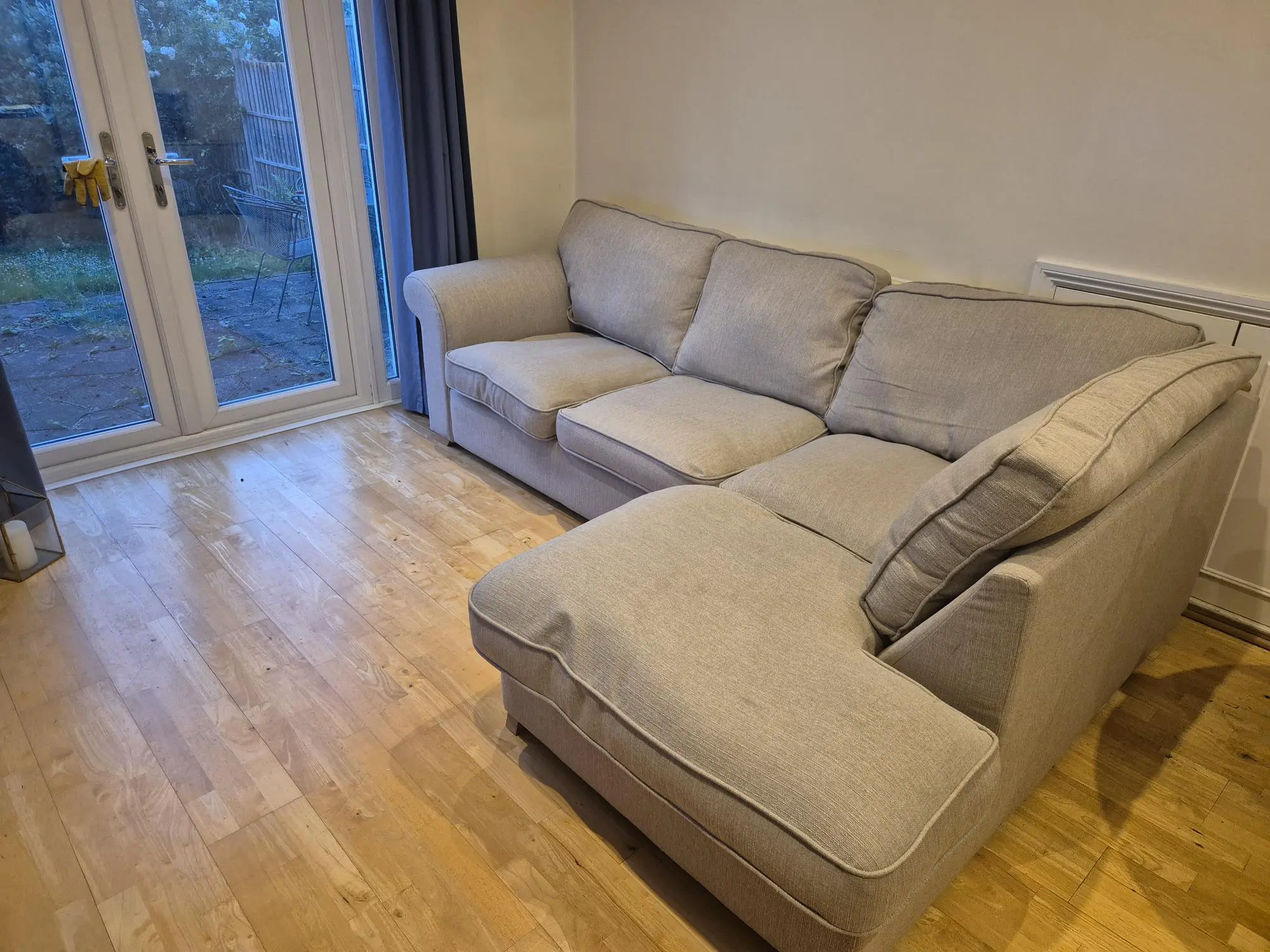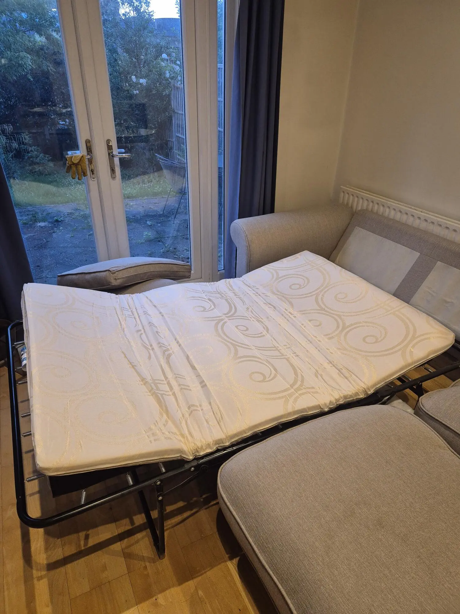 Beautiful and functional L Shape Sofa Bed. Very easy to pull out as a double bed. This is only a few years old and in very good condition. Extremely comfortable and roomy, with another space for 3 to 4 people.