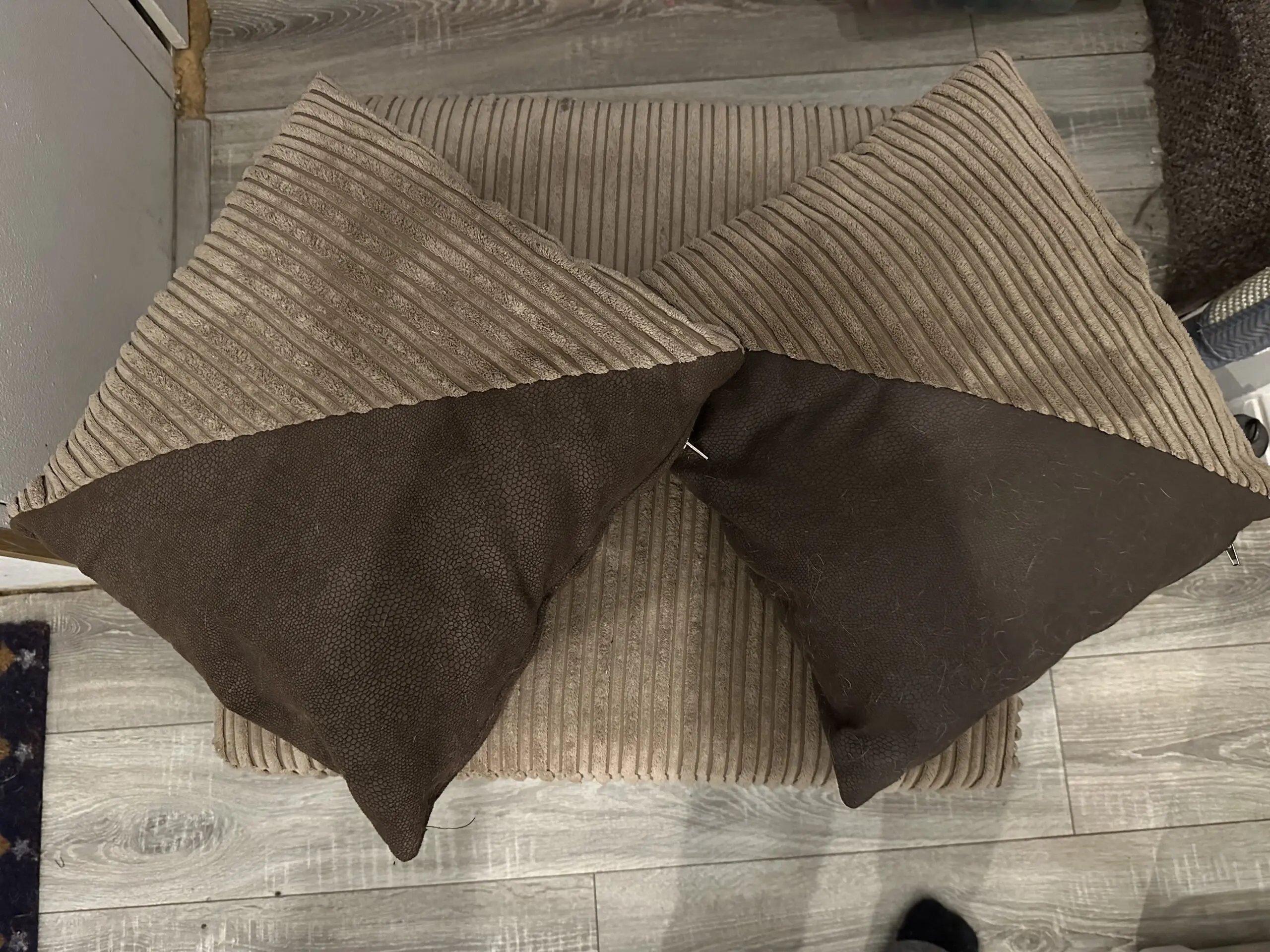 DFS Brown Cord Sofa Bed with matching footstool and 2 scatter cushions