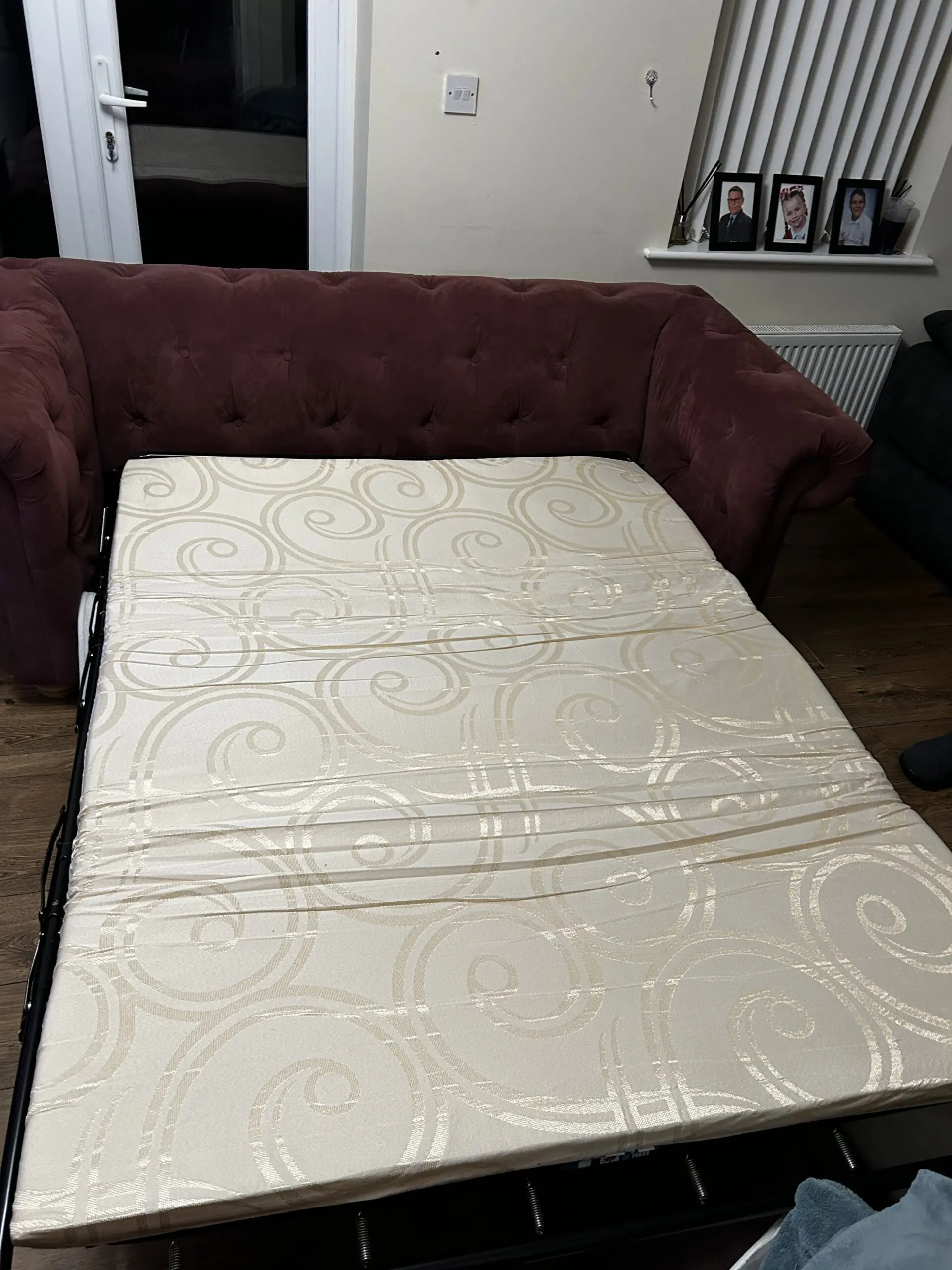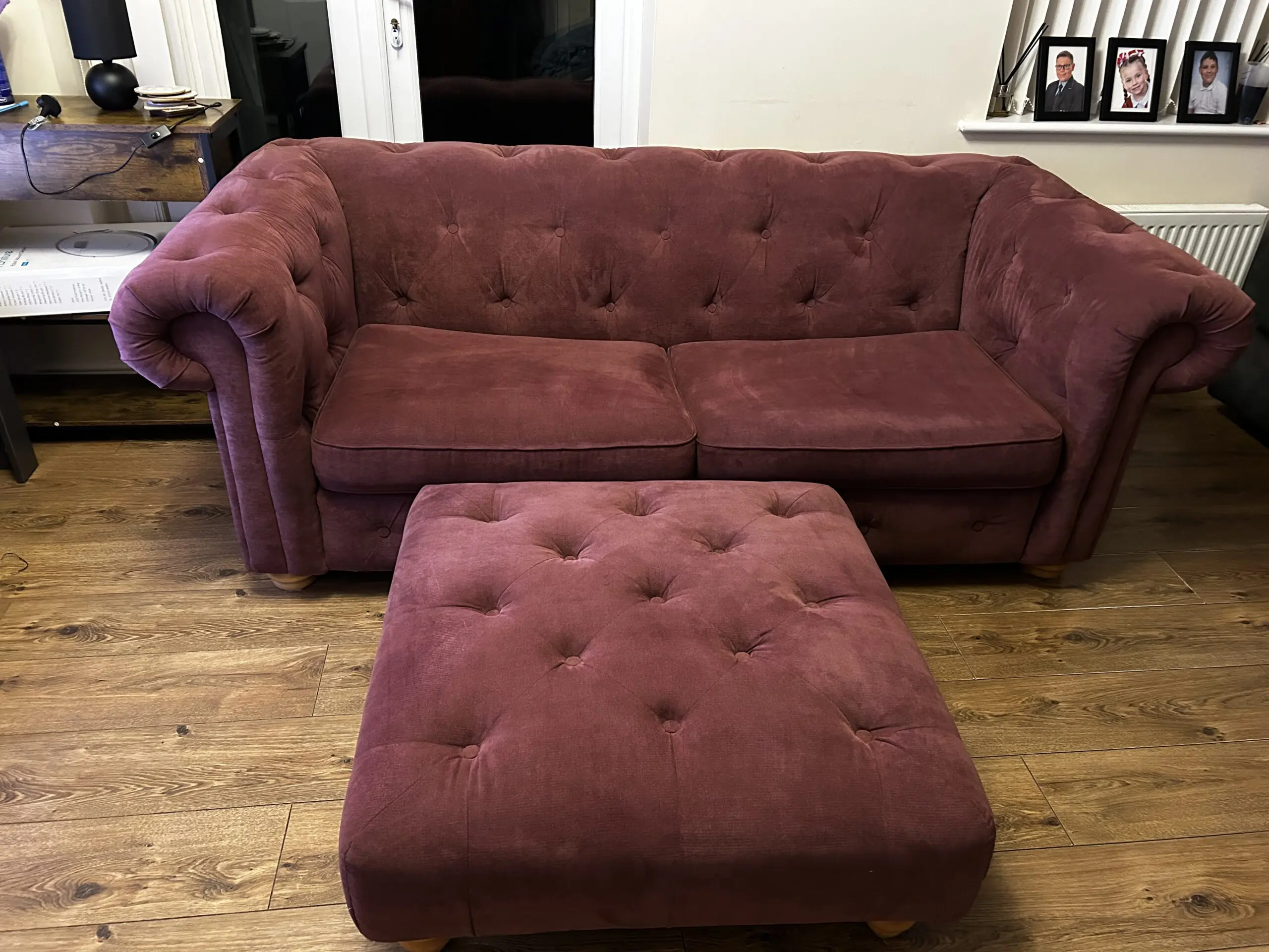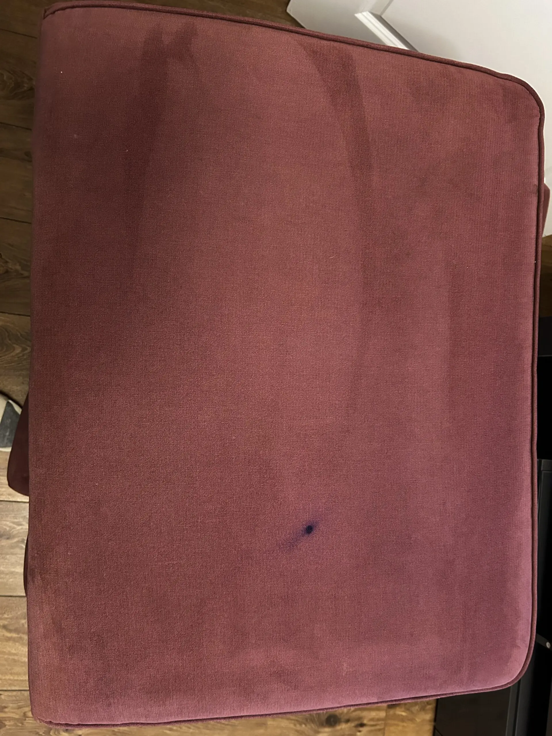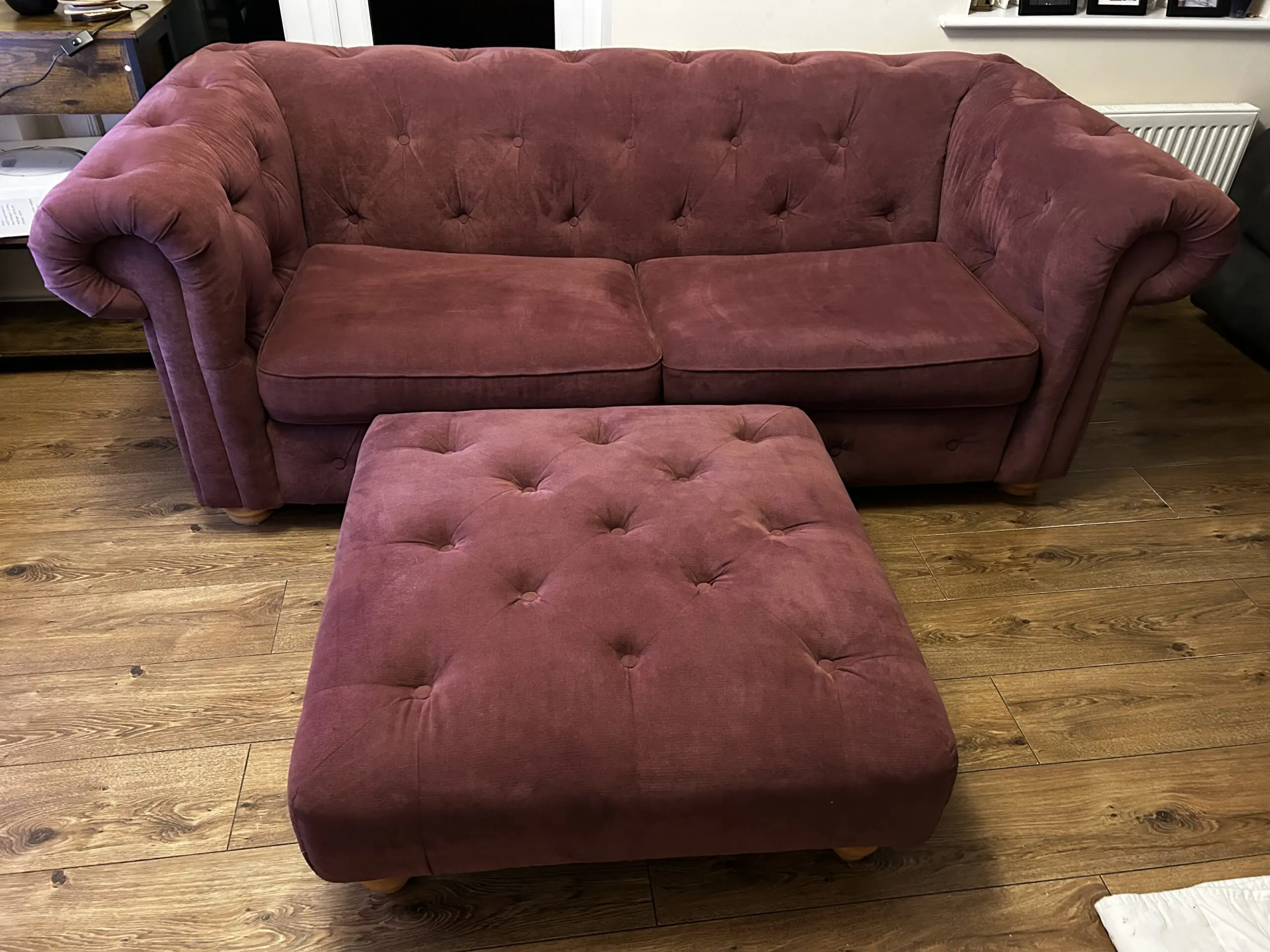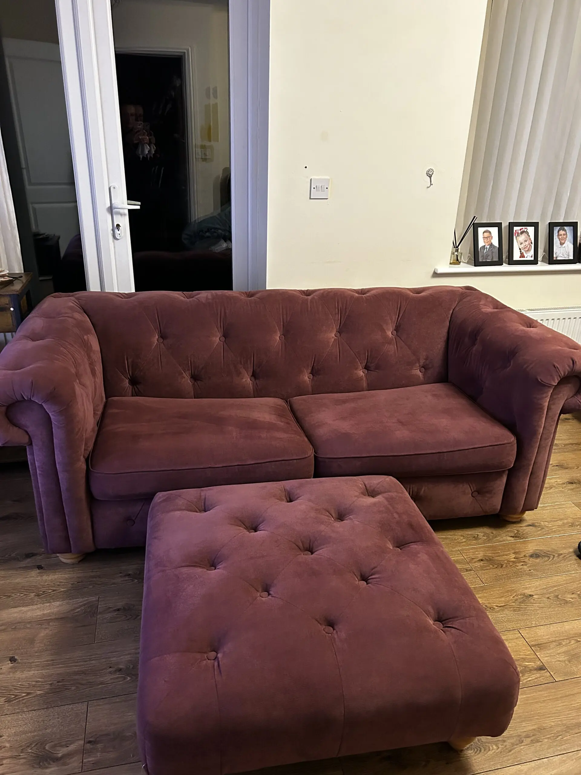 The couch is 18months old. In good clean condition, tho It has an ink stain on the under side of the seat cushion. It also come with a large matching foot stool.