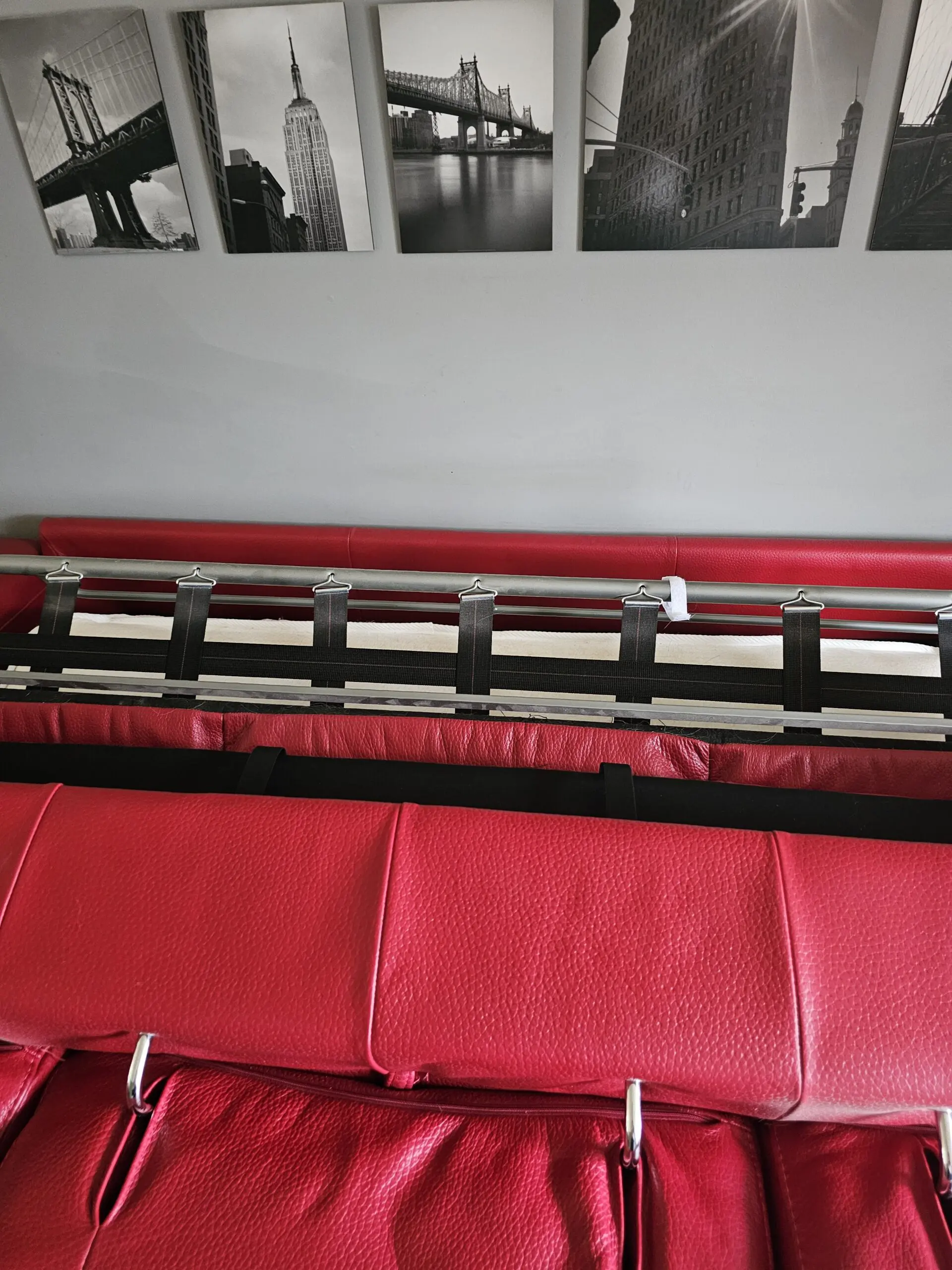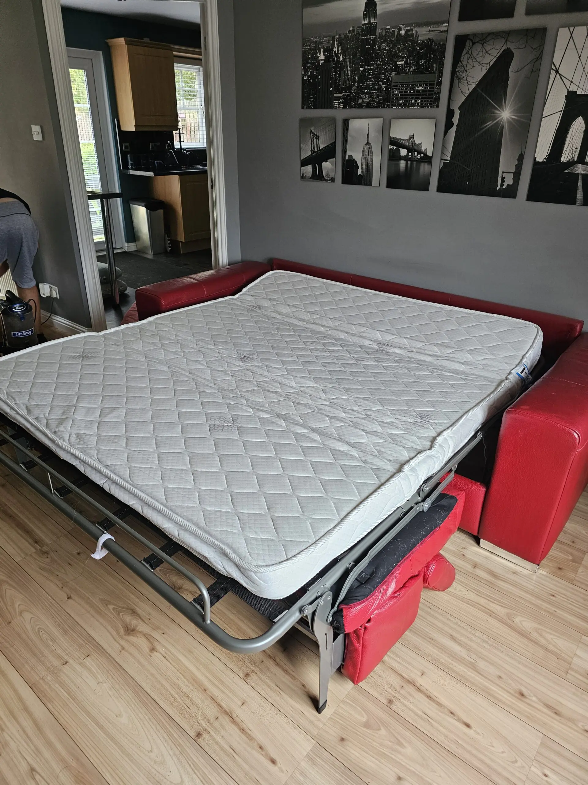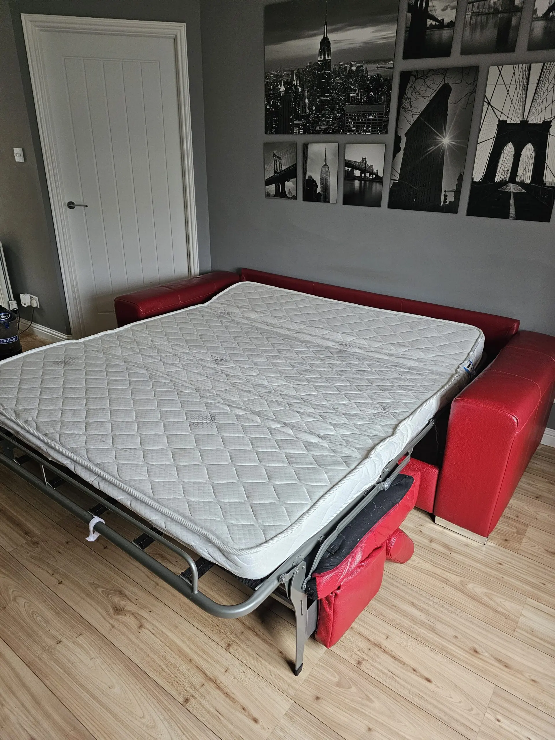 Beautiful 4 seater red leather Sofa bed. Manual multi positional head rests. One hand pull out bed. Handle tucks away when not in use, full tension sprung bed frame. with full mattress, only used a handful of times.