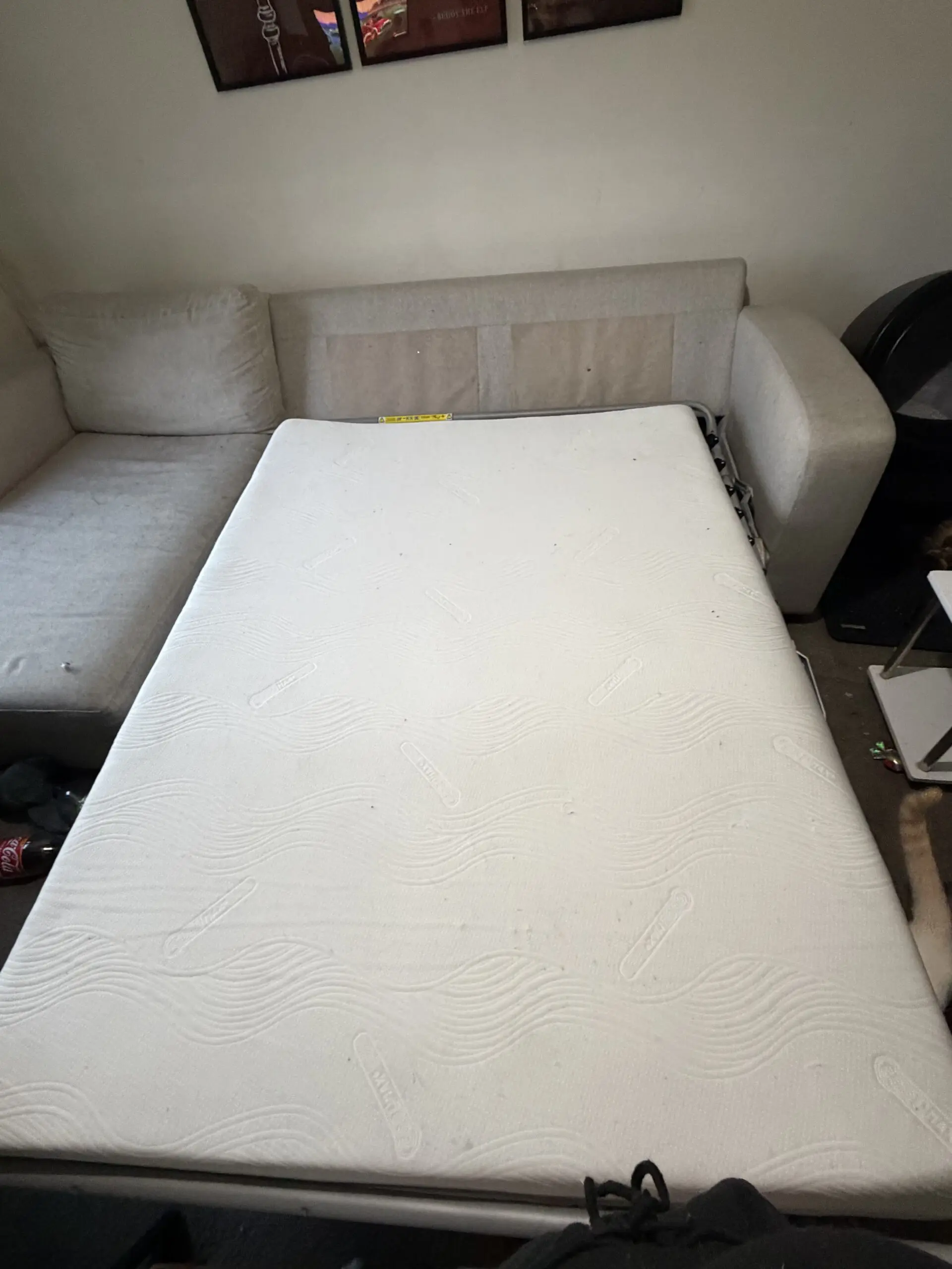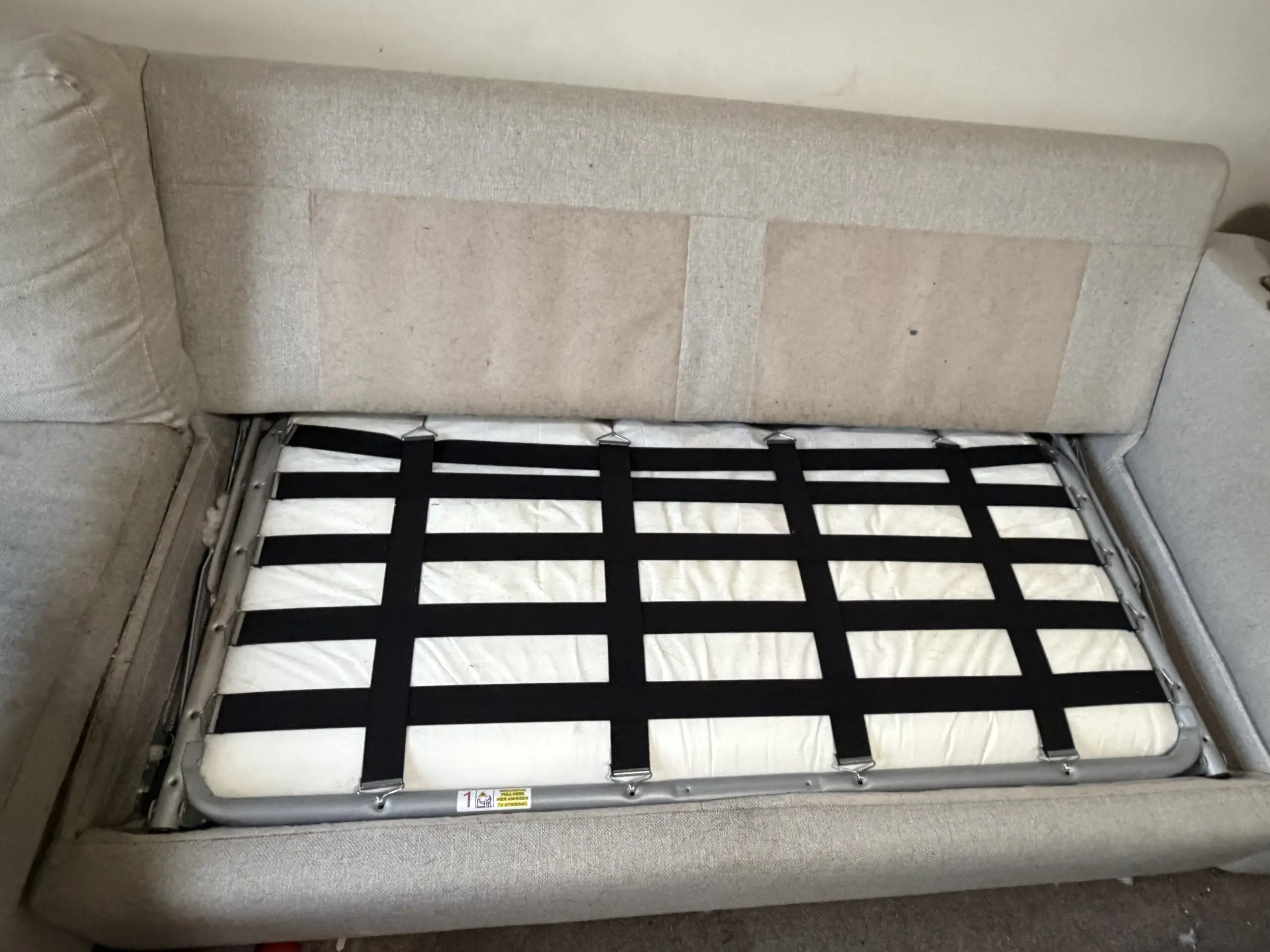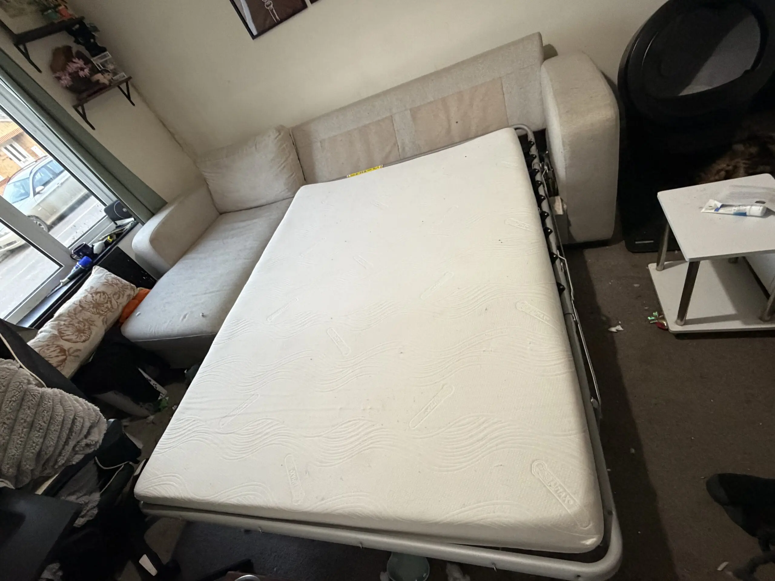 Used, has and will be deep cleaned before collection for satisfaction, does not come with mattress, the fabric that lays over the sofa bed has been cut off but is not needed, has storage